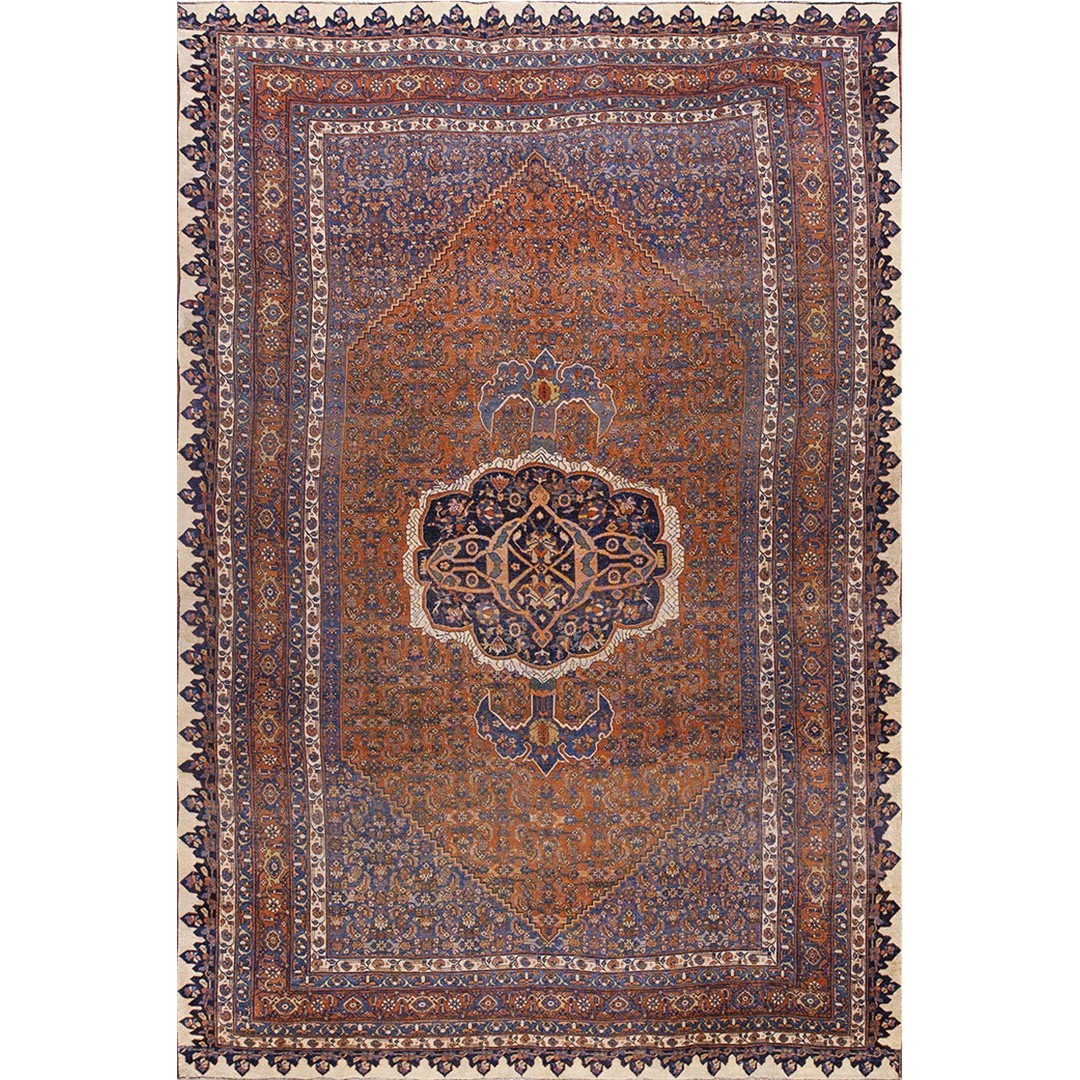 Probably the heaviest and longest wearing of any handmade carpet, with a very firm and almost board like handle, they are produced in the town of Bijar and in lesser qualities in the surrounding villages in Persian Kurdistan. The best feature all wool construction with a compact and dense pile of high quality wool which takes dyes well, including an excellent dark blue and a warm copper red, along with green, lighter blues, and a natural ivory. Patterns maybe overall or medallion, the fields full decorated or open. The weave varies from medium to very fine in the Halvai quality. Prices and sizes range widely.