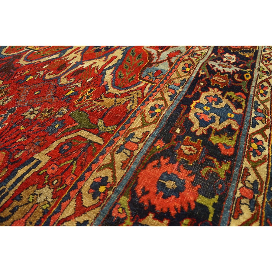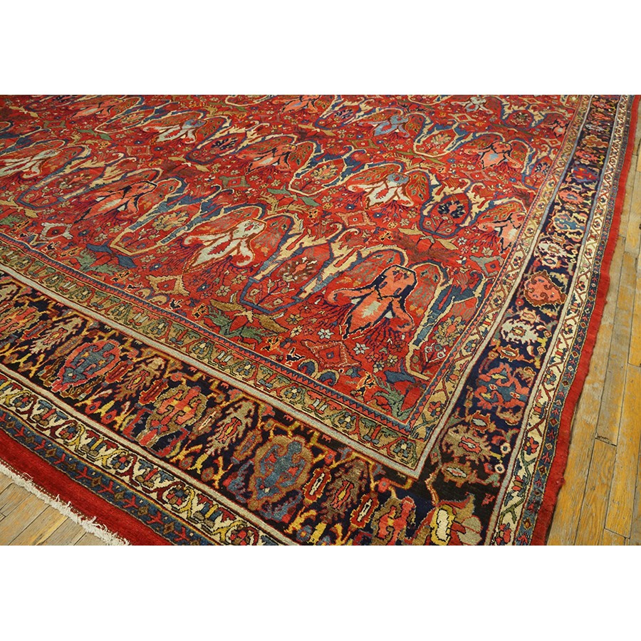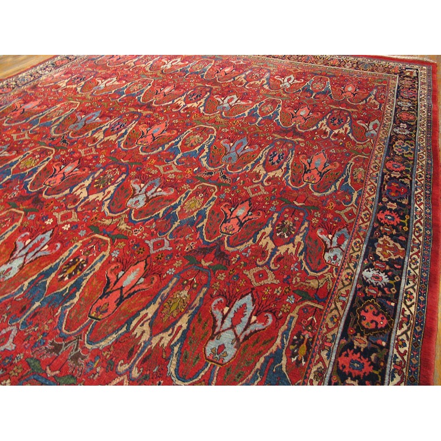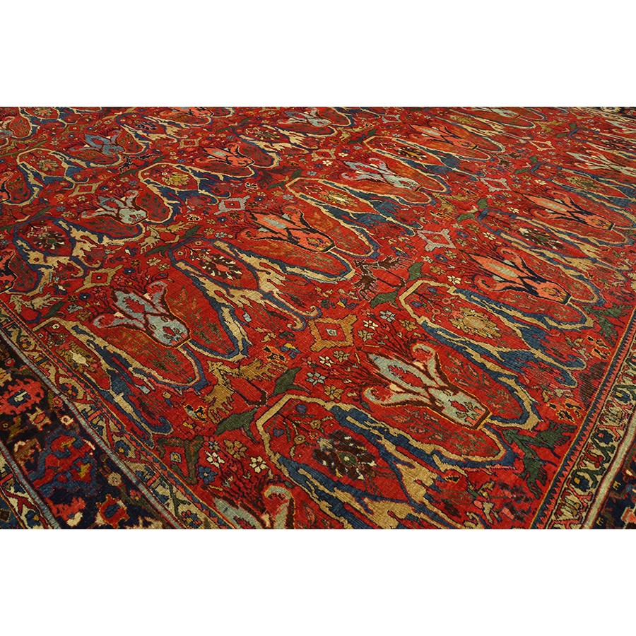 This classic Garrus Bijar shows a six row allover pattern of reversing palmettes and U-shaped conjoint ivory arabesques, with smaller palmettes within on a subtle abrashed madder red field. The detail tones include: abrashed light blue, salmon, royal blue, and green. The narrow navy main border shows small palmettes on the sides, which narrow at the ends to Cypress-like motives, with oblique fan palmettes in the corners. In excellent condition with a very compact pile. Unfaded natural colors.