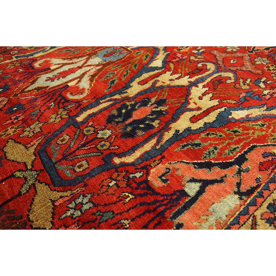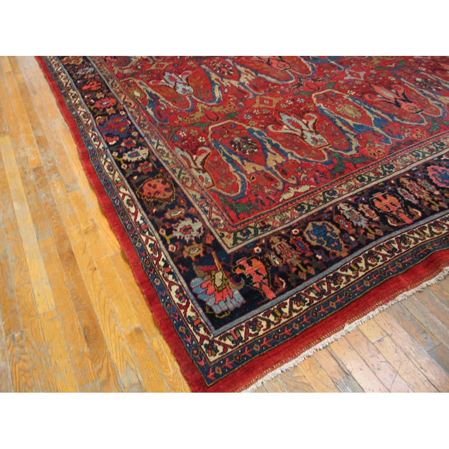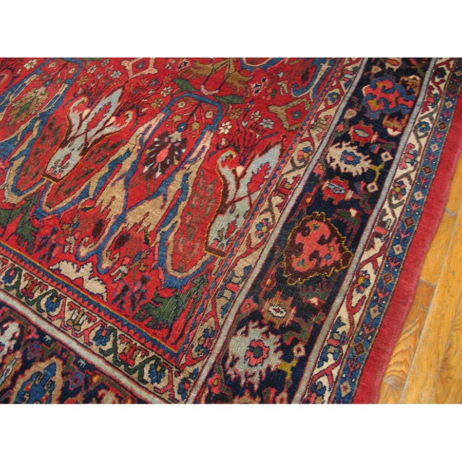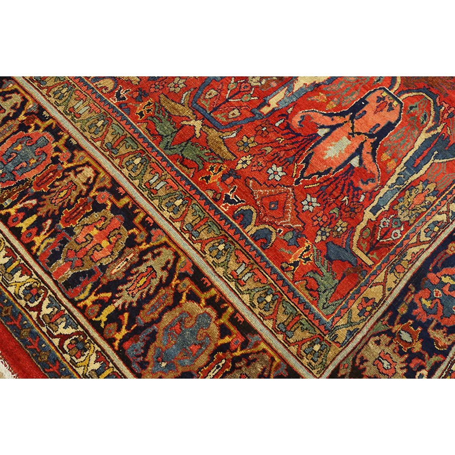 This classic Garrus Bijar shows a six row allover pattern of reversing palmettes and U-shaped conjoint ivory arabesques, with smaller palmettes within on a subtle abrashed madder red field. The detail tones include: abrashed light blue, salmon, royal blue, and green. The narrow navy main border shows small palmettes on the sides, which narrow at the ends to Cypress-like motives, with oblique fan palmettes in the corners. In excellent condition with a very compact pile. Unfaded natural colors.