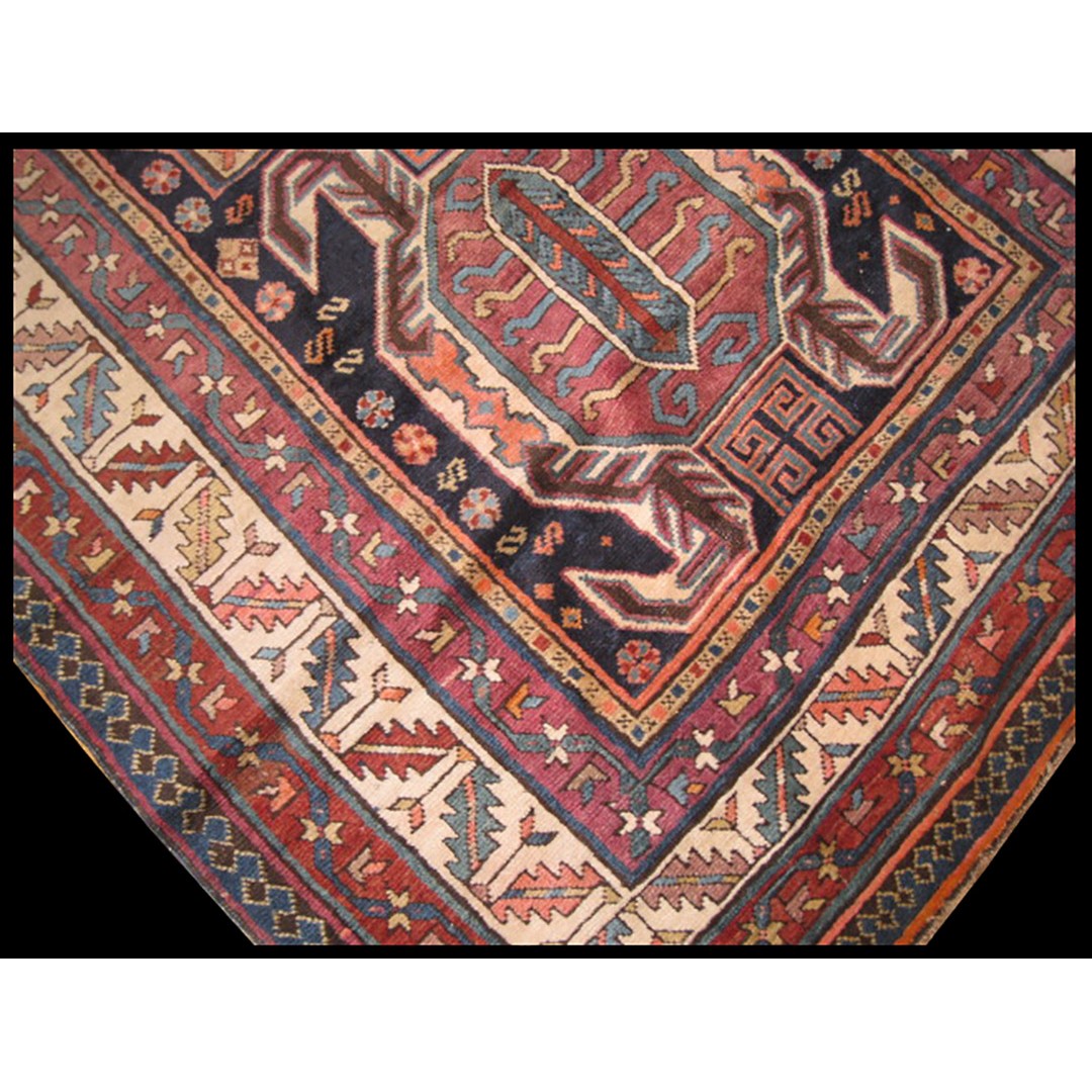 DescriptionCaucasianThis is the general heading for all rugs made in the Caucasus mountains and in the trans-Caucasus areas, north of the Arax River, and between the Black and Caspian Seas. This includes rugs from the Kazak, Karabagh, Gendje, Koghan, Talish, Akstafa, Shirvan, Baku, Kuba and hesghi districts and the variants and subtypes thereof. The rugs are usually in scatter sizes and of all wool construction, with bold colors and geometric patterns, from the 18th through 20th centuries. Prices range widely depending on rarity, color, design and condition. A strong collector market exists for the better examples. | |