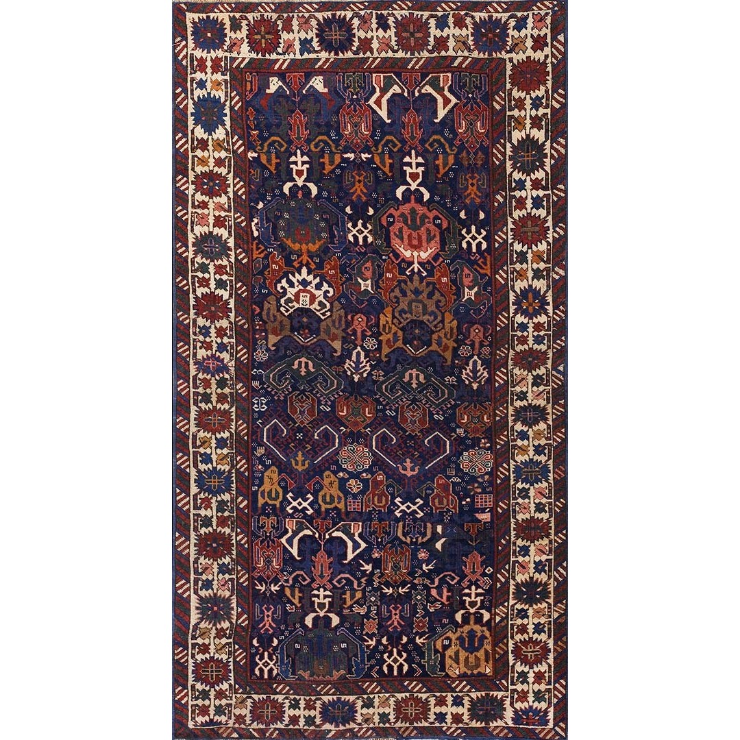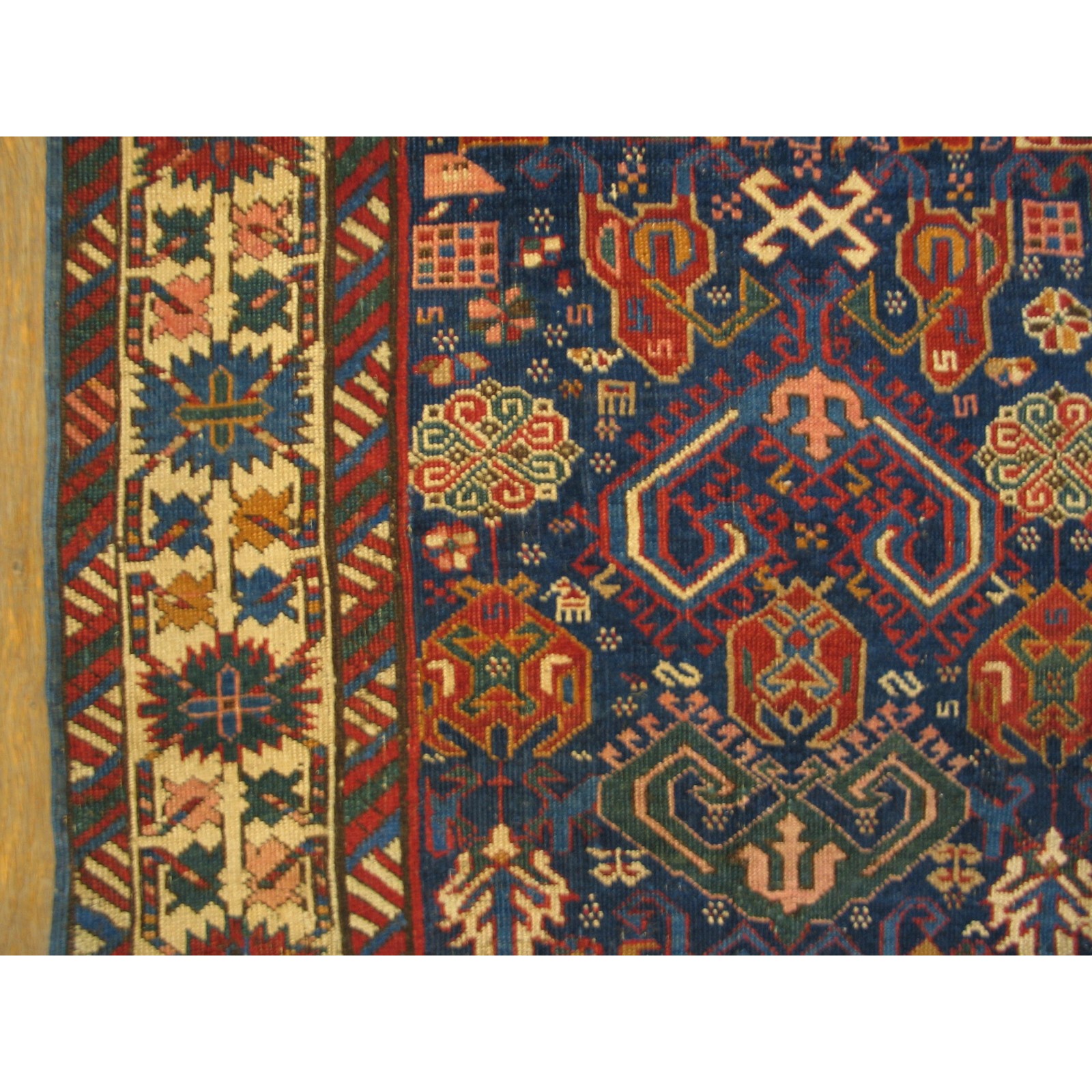 DescriptionCaucasianThis is the general heading for all rugs made in the Caucasus mountains and in the trans-Caucasus areas, north of the Arax River, and between the Black and Caspian Seas. This includes rugs from the Kazak, Karabagh, Gendje, Koghan, Talish, Akstafa, Shirvan, Baku, Kuba and hesghi districts and the variants and subtypes thereof. The rugs are usually in scatter sizes and of all wool construction, with bold colors and geometric patterns, from the 18th through 20th centuries. Prices range widely depending on rarity, color, design and condition. A strong collector market exists for the better examples. Caucasian - BidjovBidjov is a town in the Kuba region of the Caucasus, north of Shirvan and west of the Caspian Sea. Bidjov rugs have the same structure as Zeichurs and often employ the running dog main border. By far the most popular design is an ascending array of stylish palmettes in tones of red, green, yellow, light blue and ivory, on an almost universal dark blue ground. The weave is light and think, and the foundation all wool. Black is very corrosive and with pile loss the rugs often look older than they really are. This inherent vice limits the number of Bidjous in good, original condition. | |