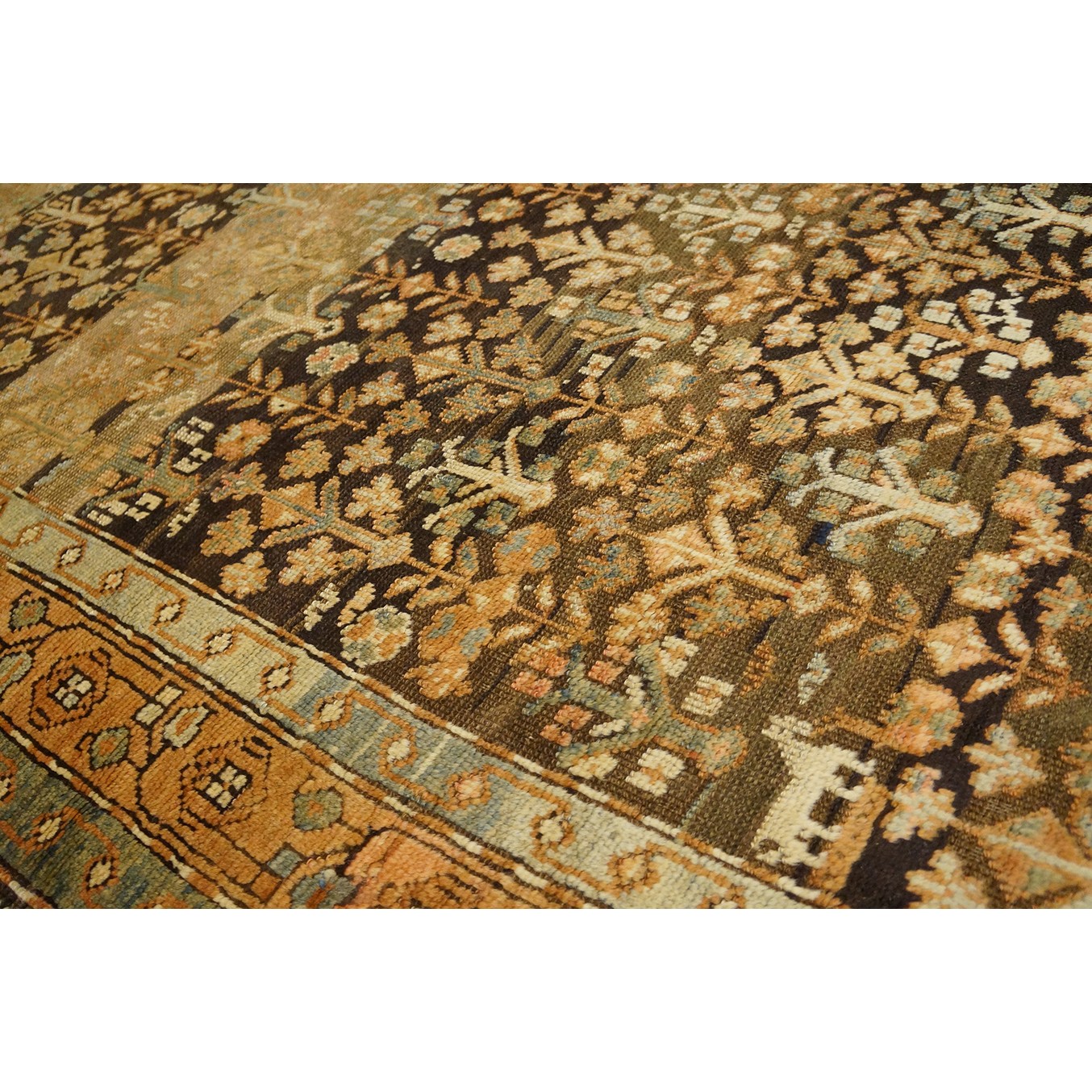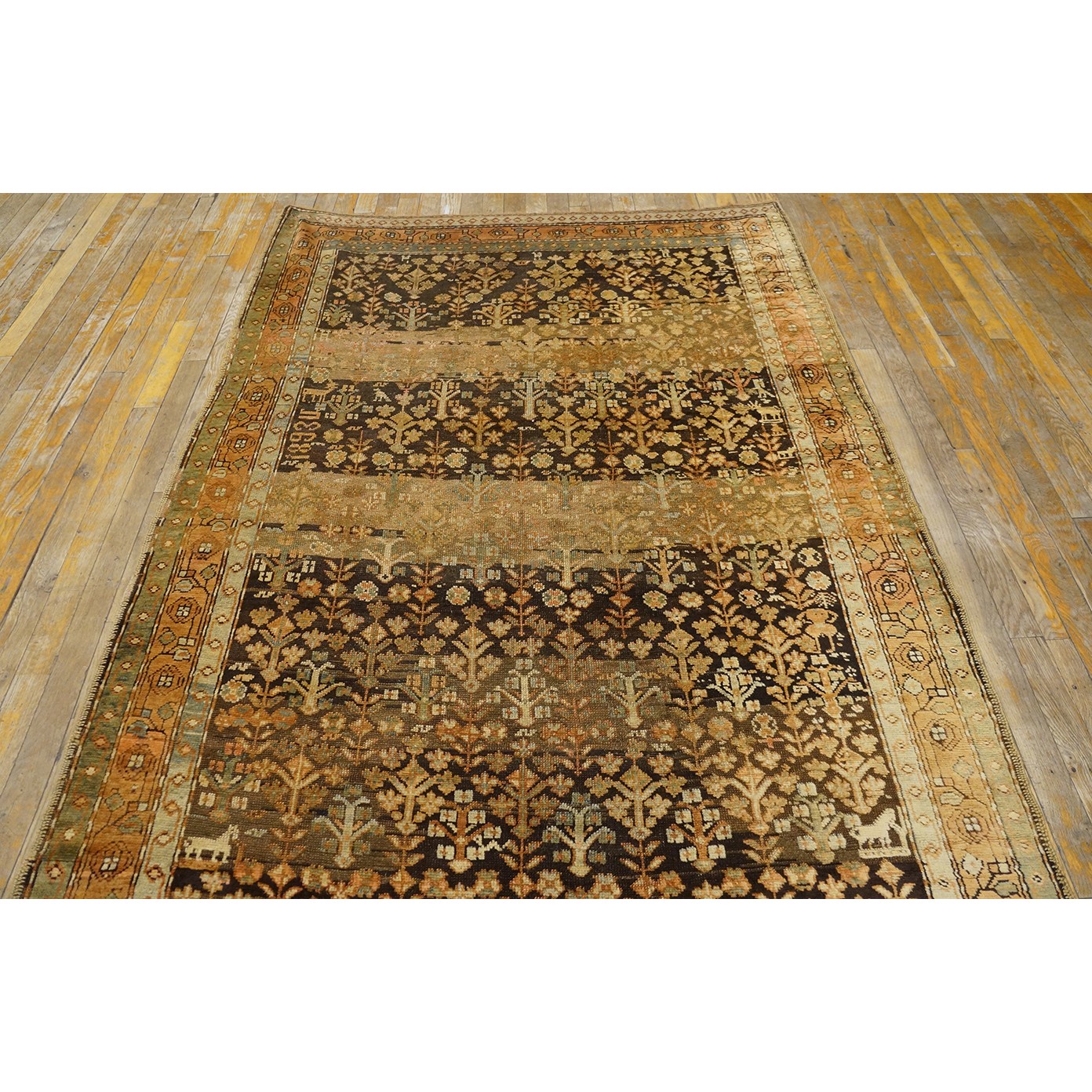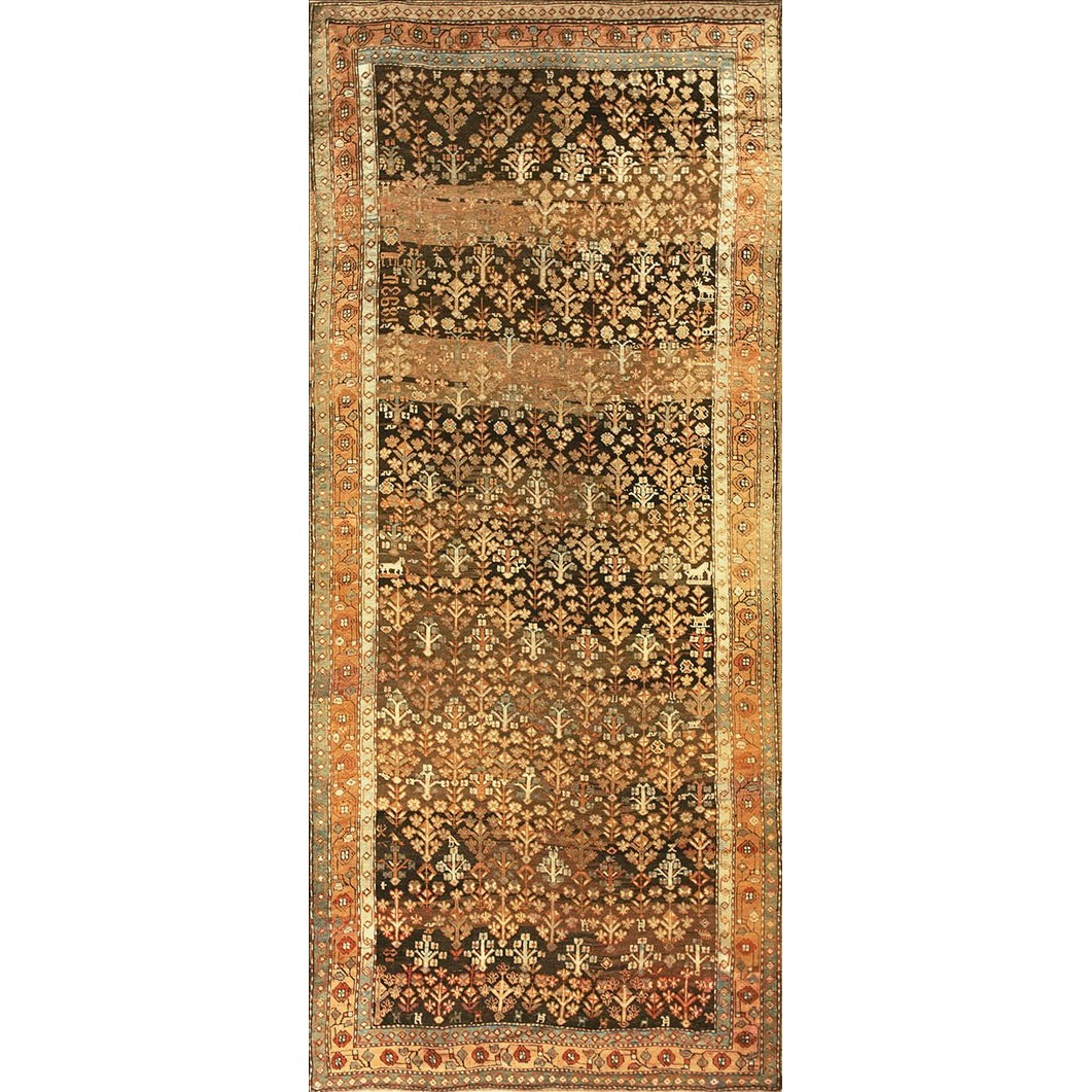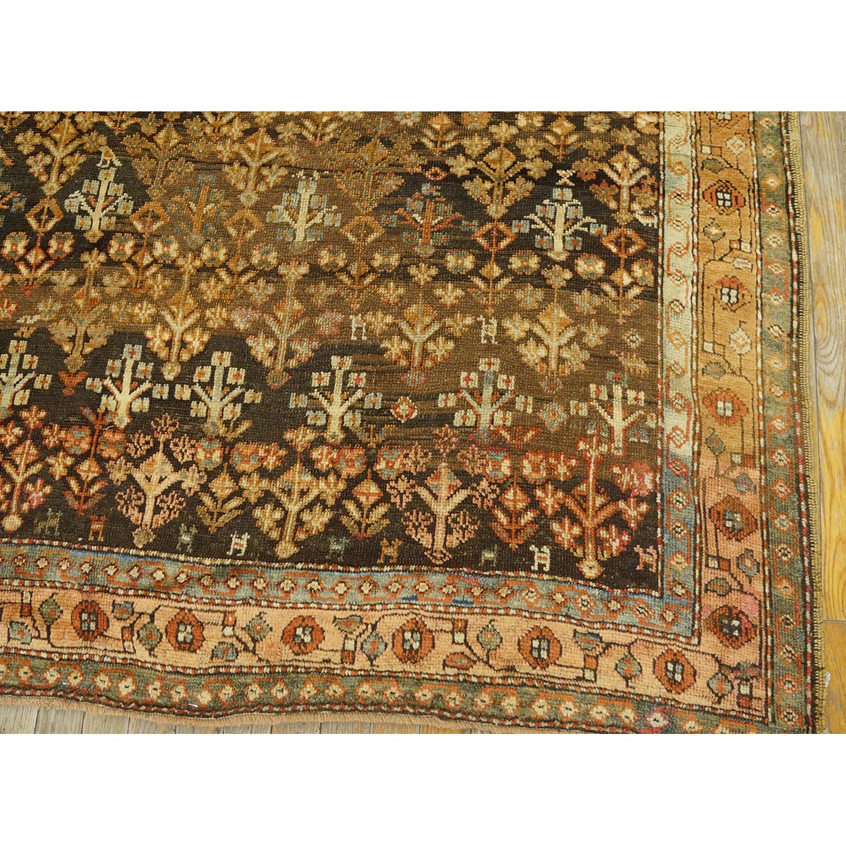 All-over tree pattern with small animals such as goats and birds. Brown background with borders of soft rust, and soft blue and blue green. This rug has a strong abrash dominant on one end. Hand knotted wool construction.