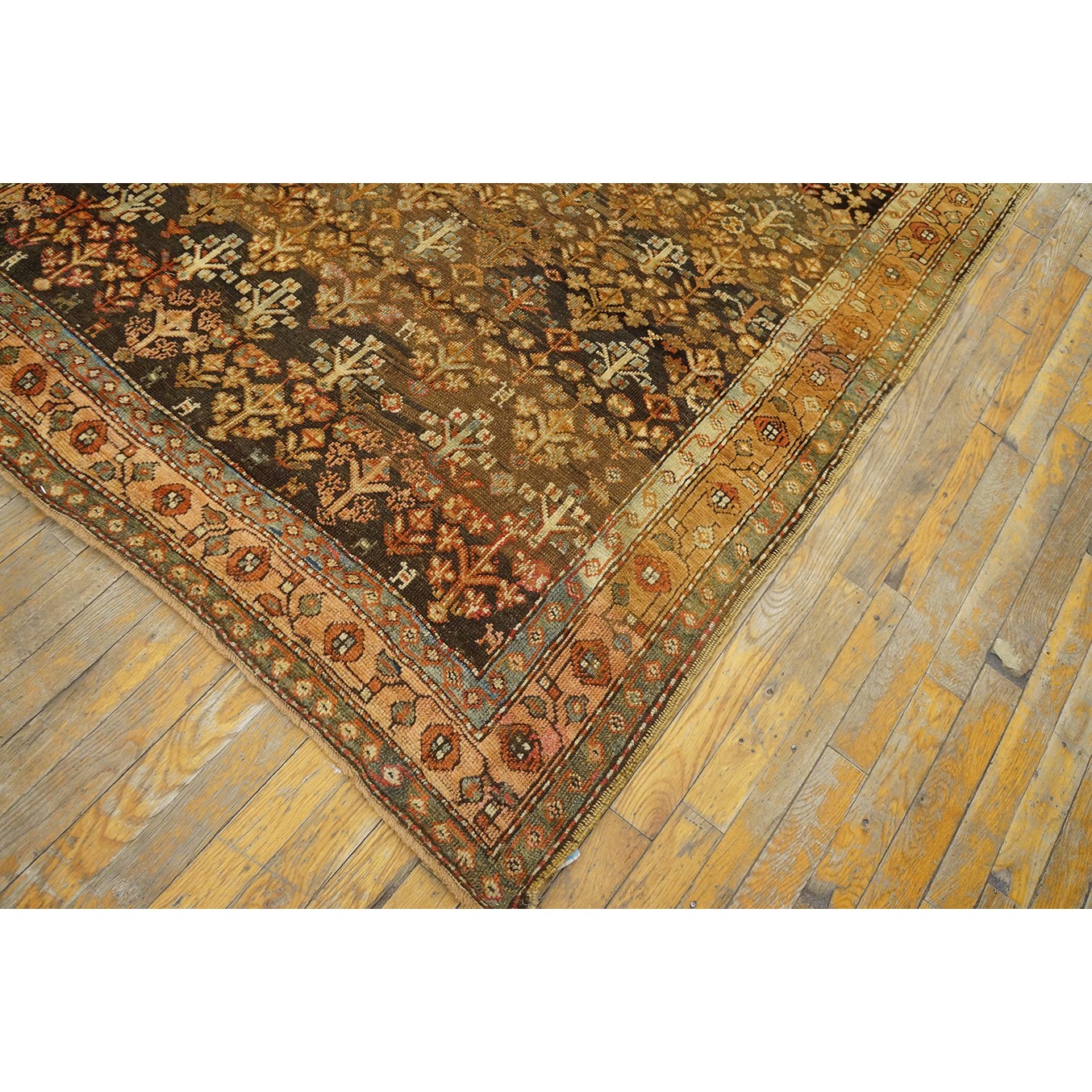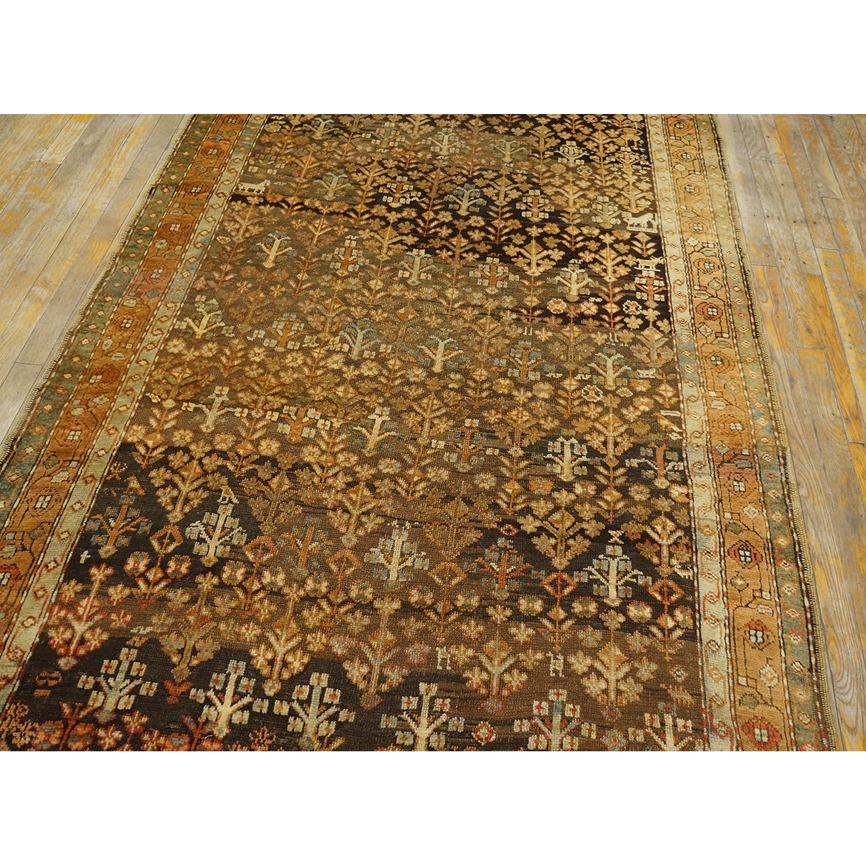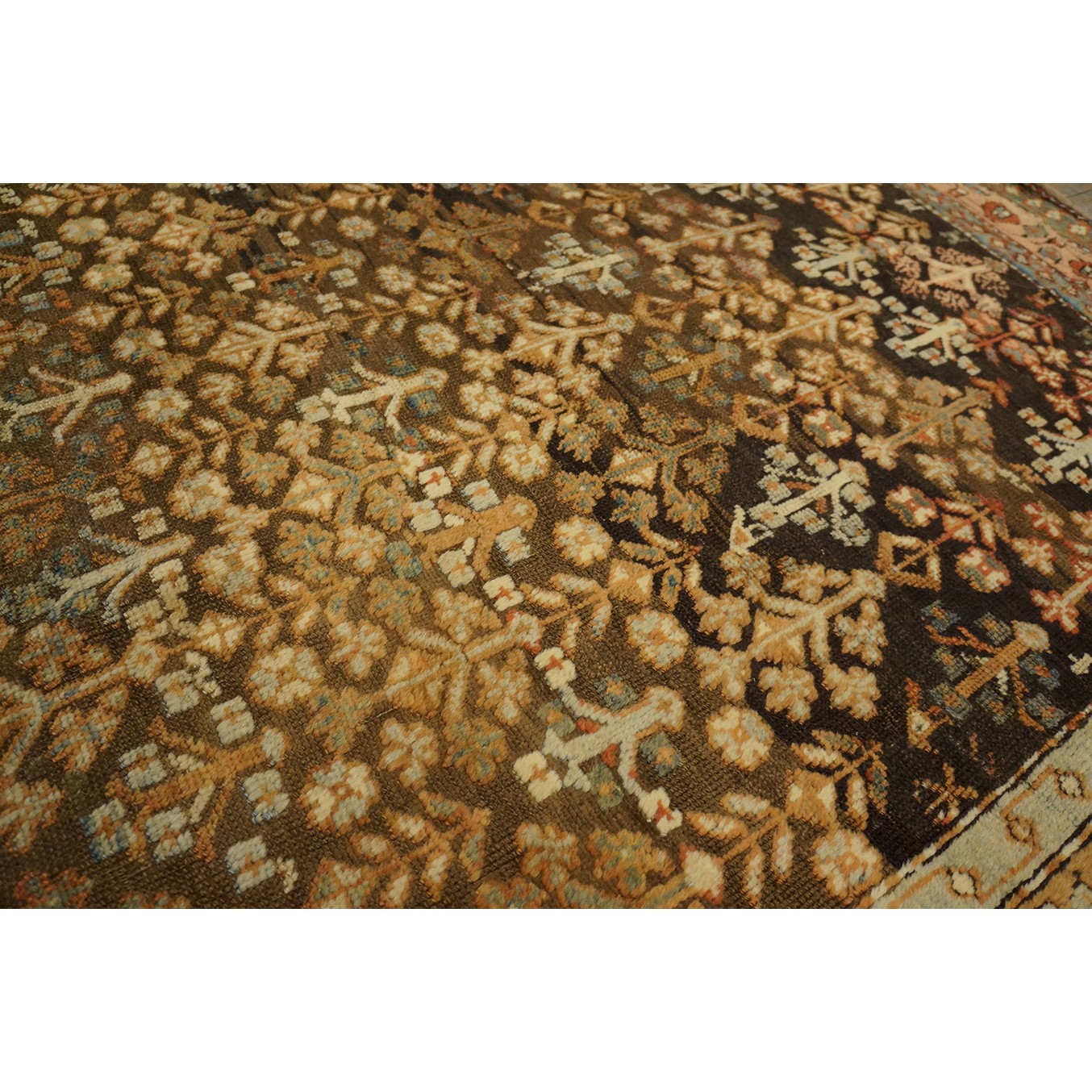 All-over tree pattern with small animals such as goats and birds. Brown background with borders of soft rust, and soft blue and blue green. This rug has a strong abrash dominant on one end. Hand knotted wool construction.