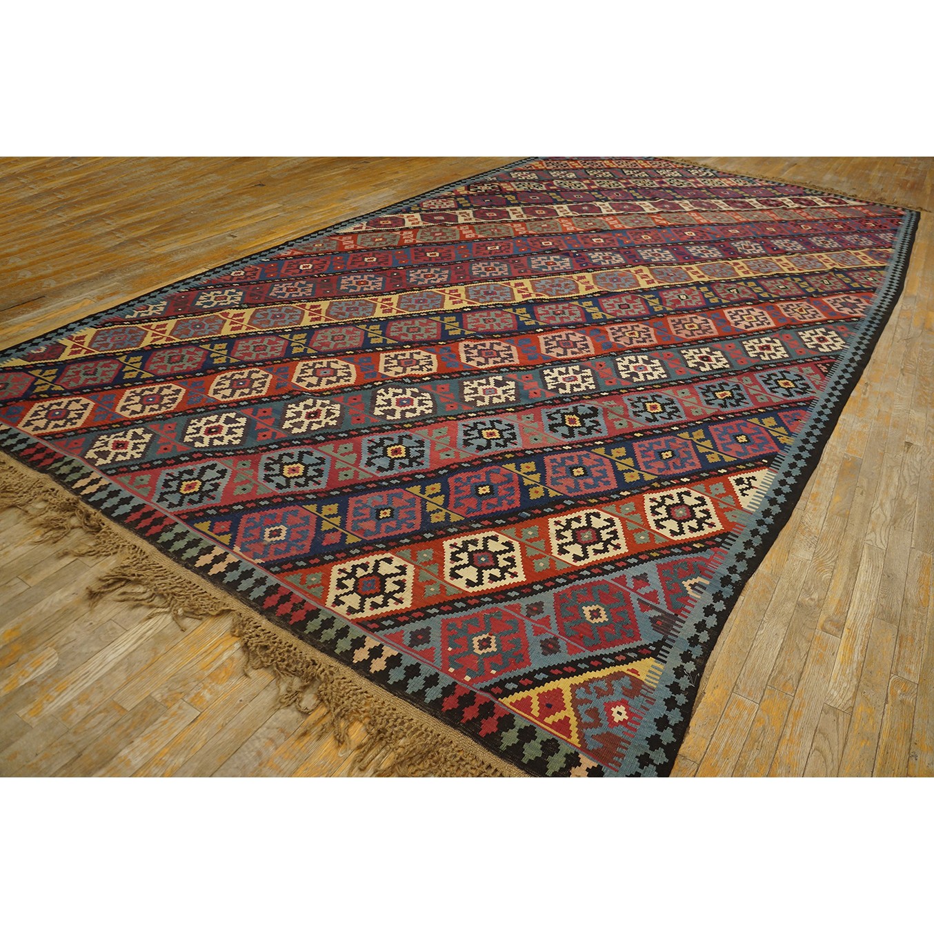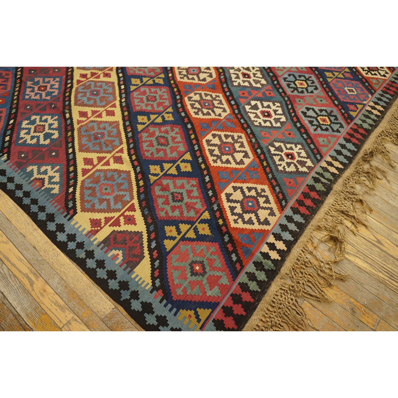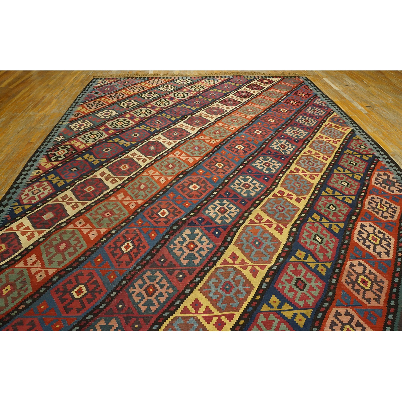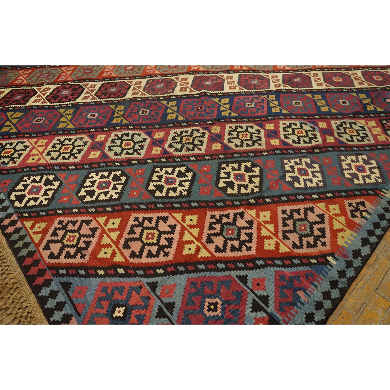 One of the largest known antique Caucasian kilims, the weavers have taken what is usually a horizontal pattern of wide bands of medallions and turned it about 45 degrees, resulting in a dynamic , movemented design instead of the more static layout of most, smaller pieces. The color scheme is much wider than usual, with a striking bright yellow diagonal standing out.This rare c.1890 east Caucasian flat-weave carpet will work in any rustic, folk or tribally-inspired interior.