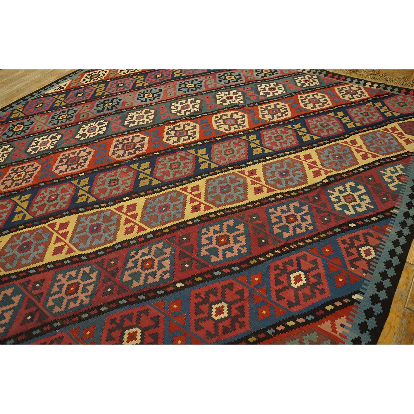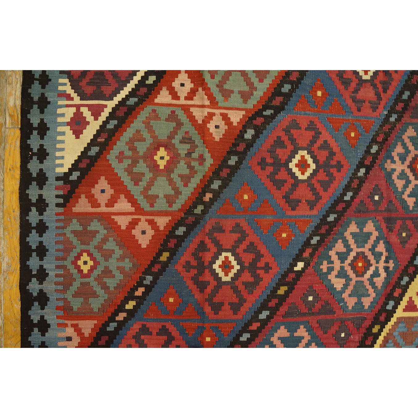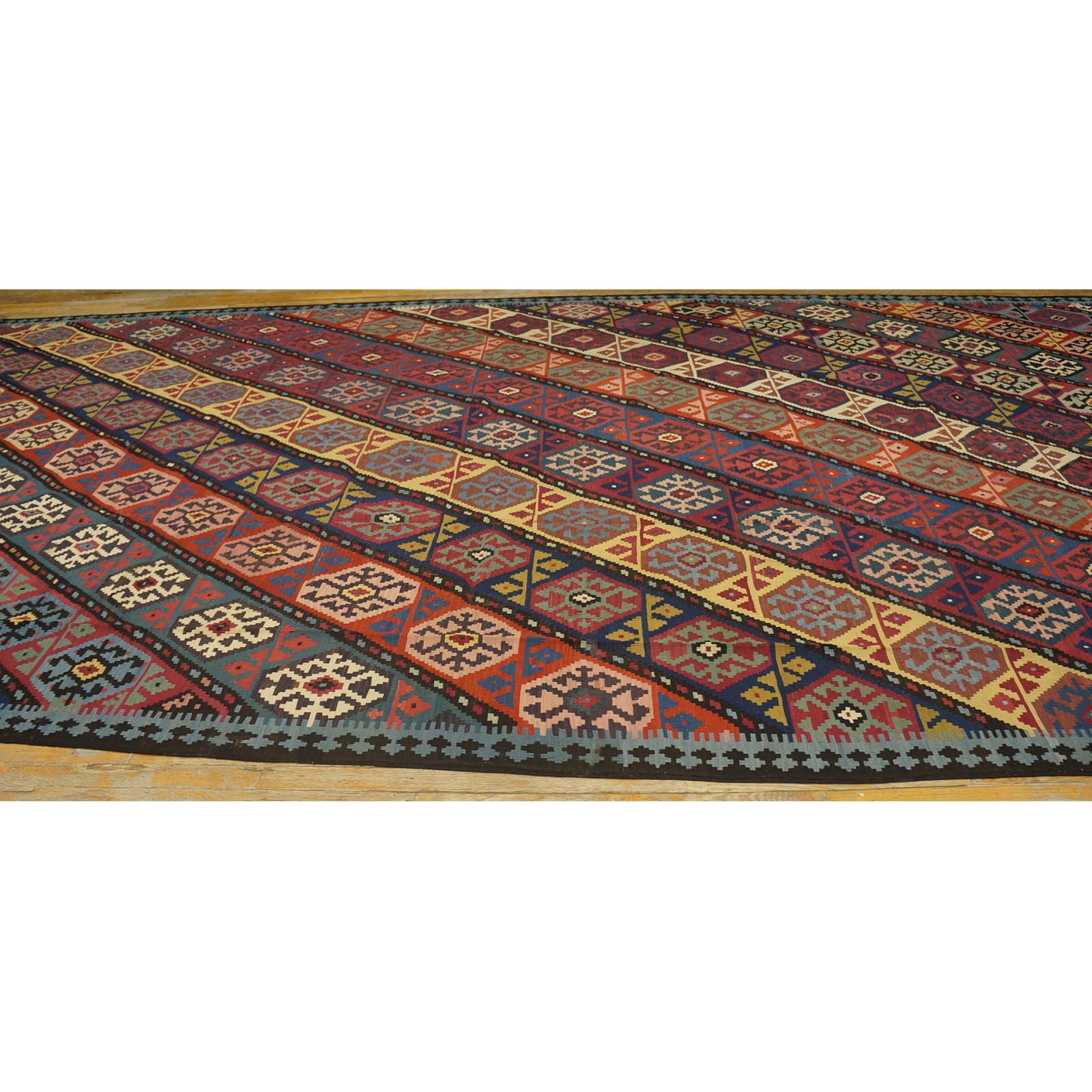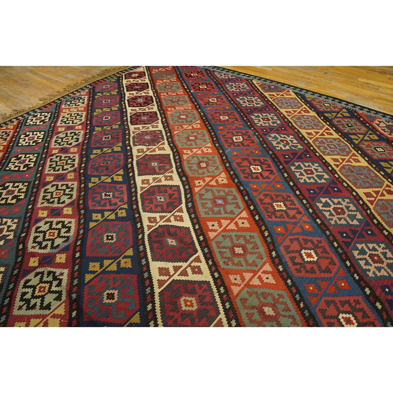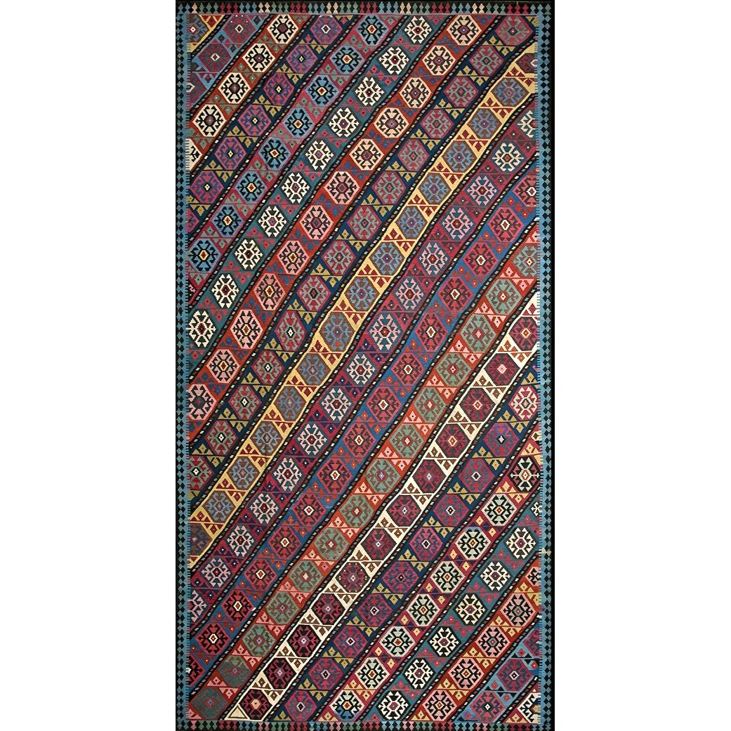One of the largest known antique Caucasian kilims, the weavers have taken what is usually a horizontal pattern of wide bands of medallions and turned it about 45 degrees, resulting in a dynamic , movemented design instead of the more static layout of most, smaller pieces. The color scheme is much wider than usual, with a striking bright yellow diagonal standing out.This rare c.1890 east Caucasian flat-weave carpet will work in any rustic, folk or tribally-inspired interior.