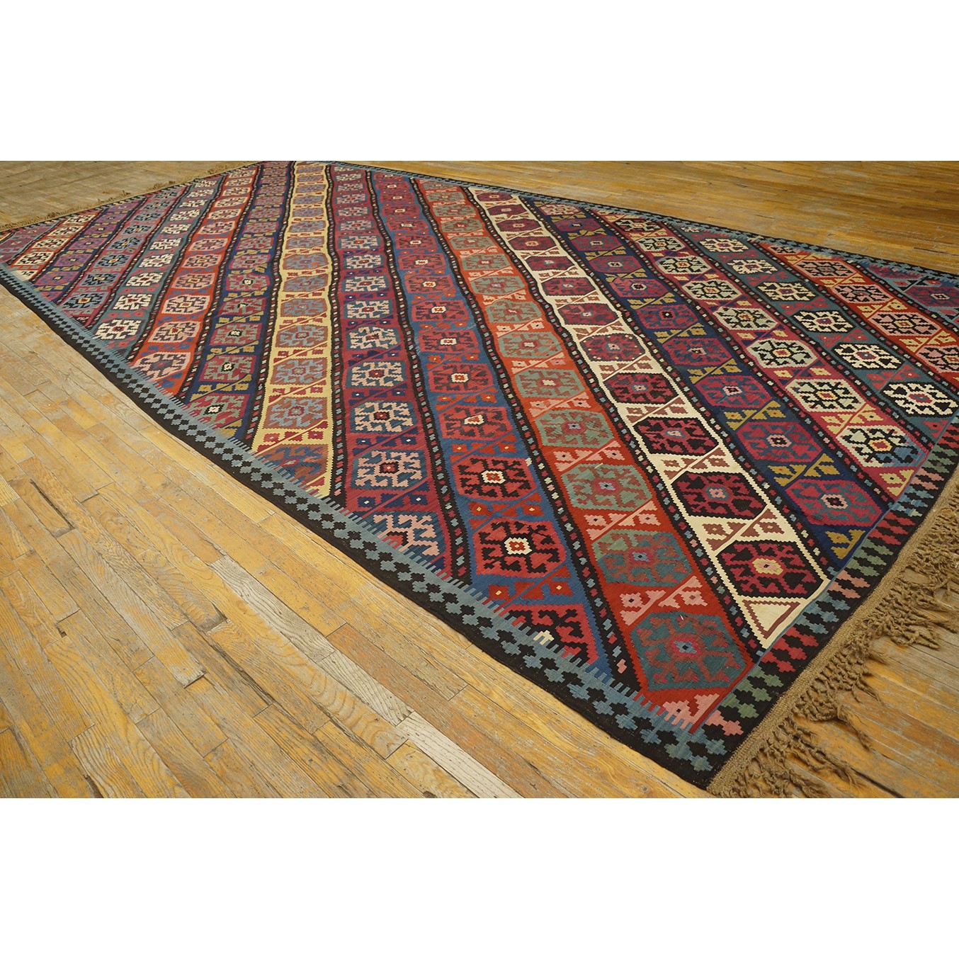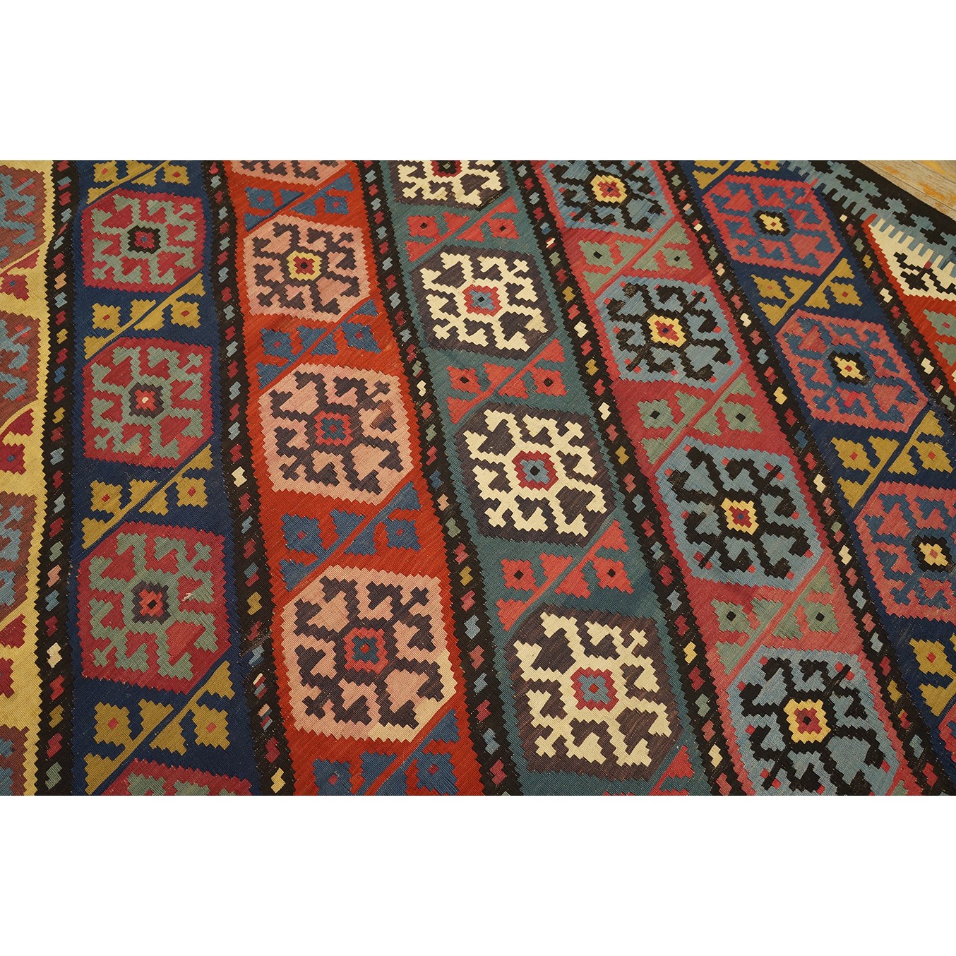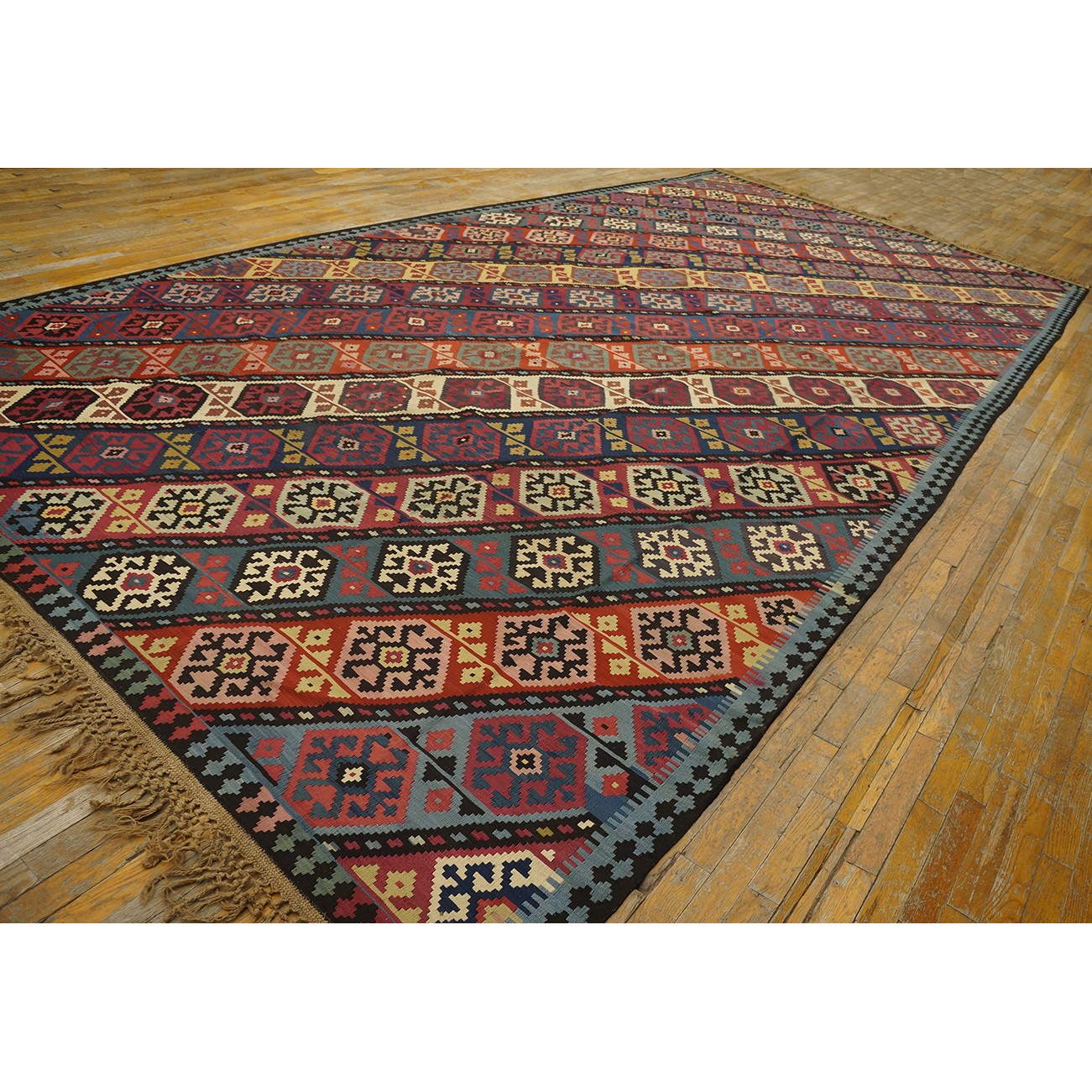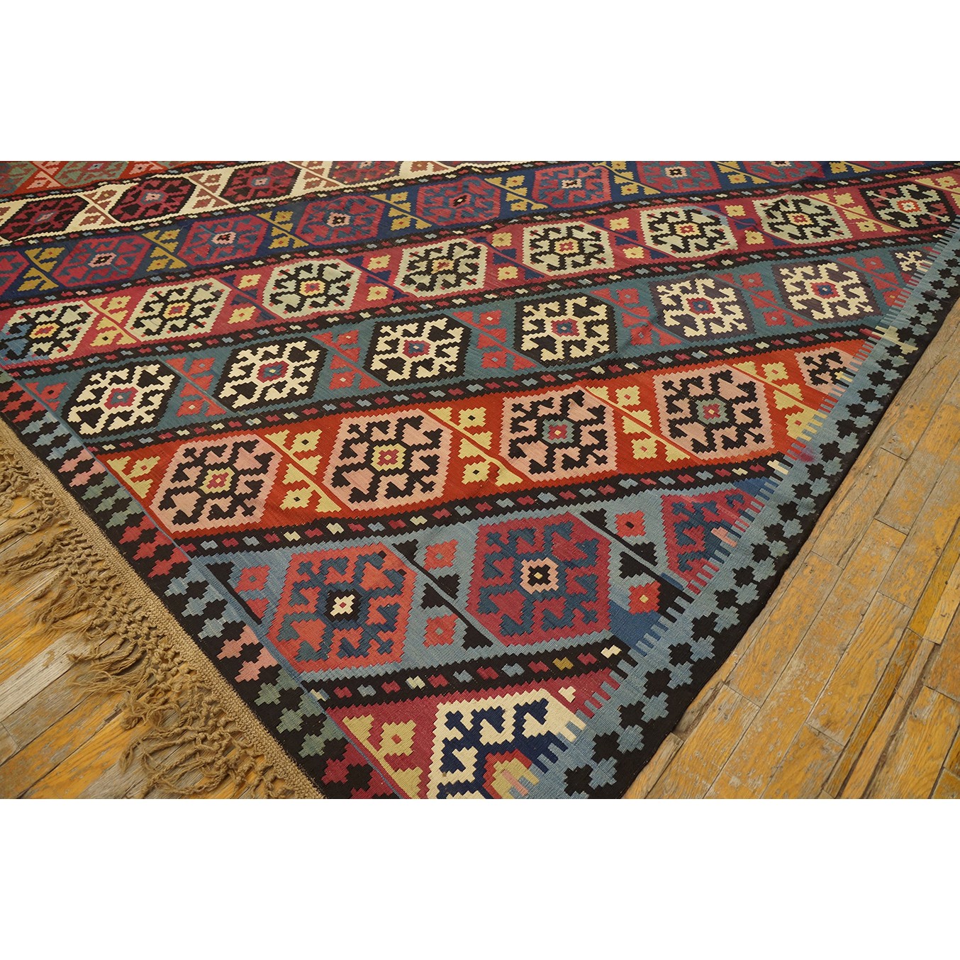 One of the largest known antique Caucasian kilims, the weavers have taken what is usually a horizontal pattern of wide bands of medallions and turned it about 45 degrees, resulting in a dynamic , movemented design instead of the more static layout of most, smaller pieces. The color scheme is much wider than usual, with a striking bright yellow diagonal standing out.This rare c.1890 east Caucasian flat-weave carpet will work in any rustic, folk or tribally-inspired interior.