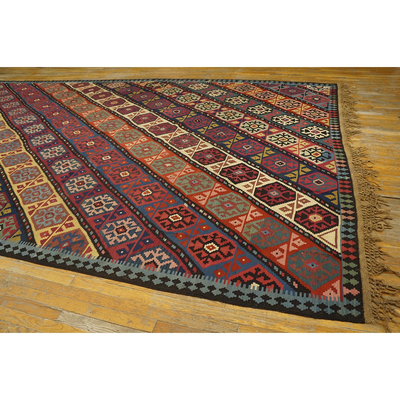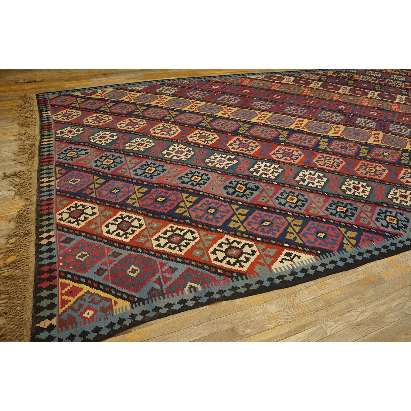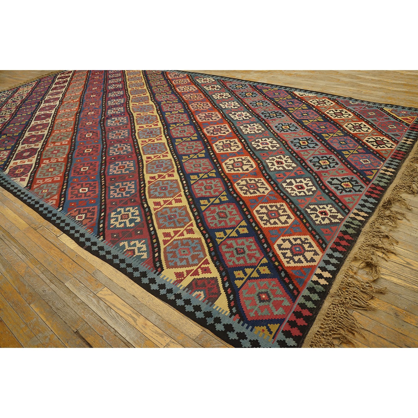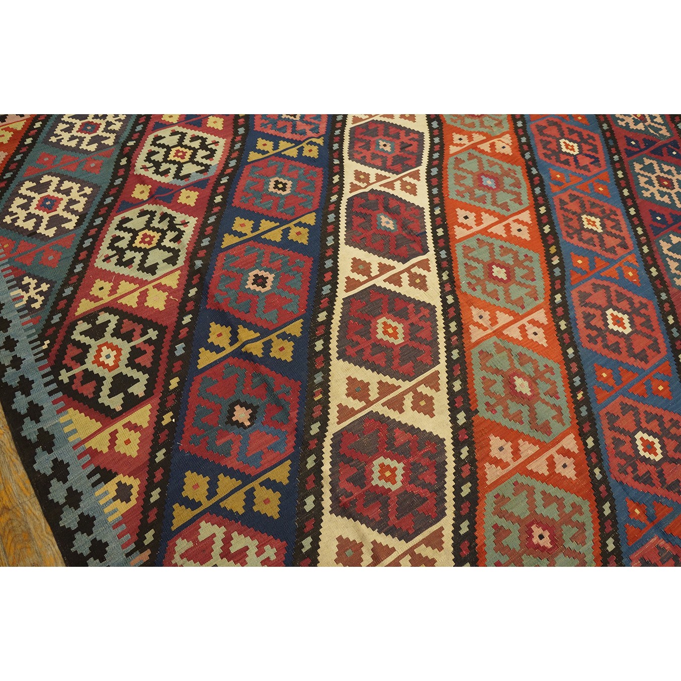 One of the largest known antique Caucasian kilims, the weavers have taken what is usually a horizontal pattern of wide bands of medallions and turned it about 45 degrees, resulting in a dynamic , movemented design instead of the more static layout of most, smaller pieces. The color scheme is much wider than usual, with a striking bright yellow diagonal standing out.This rare c.1890 east Caucasian flat-weave carpet will work in any rustic, folk or tribally-inspired interior.
