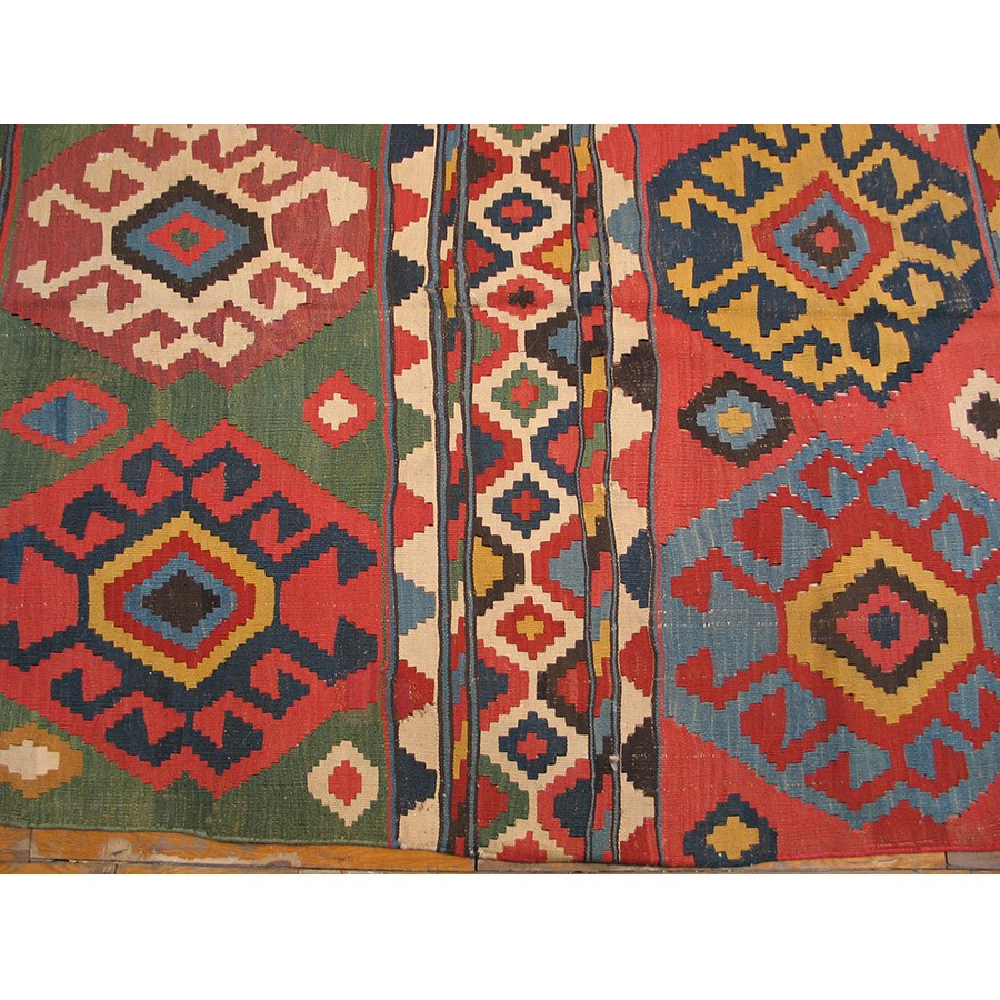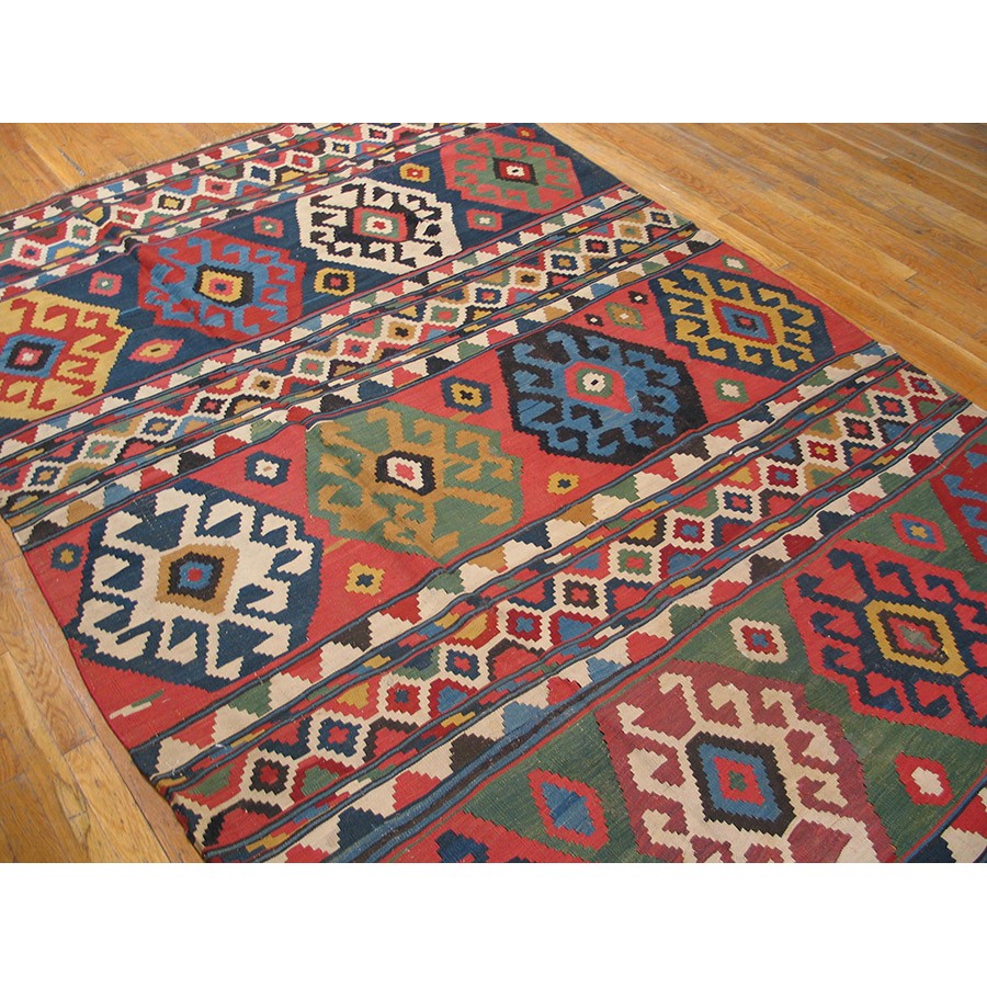 DescriptionCaucasianThis is the general heading for all rugs made in the Caucasus mountains and in the trans-Caucasus areas, north of the Arax River, and between the Black and Caspian Seas. This includes rugs from the Kazak, Karabagh, Gendje, Koghan, Talish, Akstafa, Shirvan, Baku, Kuba and hesghi districts and the variants and subtypes thereof. The rugs are usually in scatter sizes and of all wool construction, with bold colors and geometric patterns, from the 18th through 20th centuries. Prices range widely depending on rarity, color, design and condition. A strong collector market exists for the better examples. | |