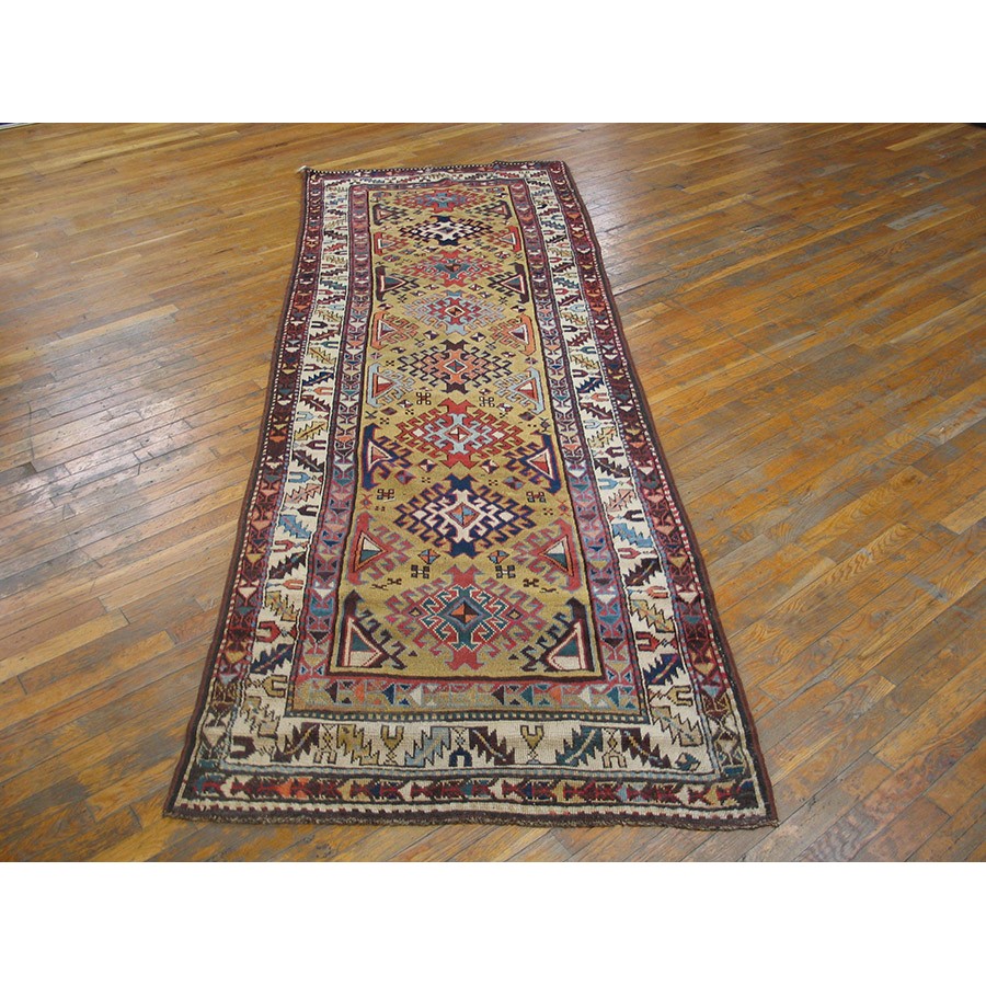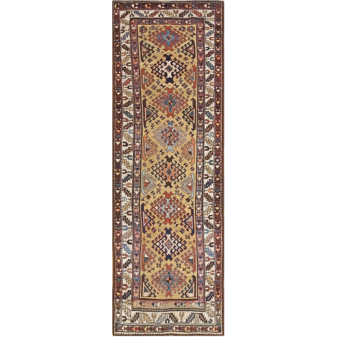 Yellow is a popular field color for eastern Caucasian rugs, and this Kuba displays 8 hooked lozenges with half lozenges on the sides and tiny abstract filler elements scattered about.Red and green are the most prominent detail colors. The ever-popular Caucasian ivory wine cup and slanted leaf border .makes a neat frame within arrowhead guards.