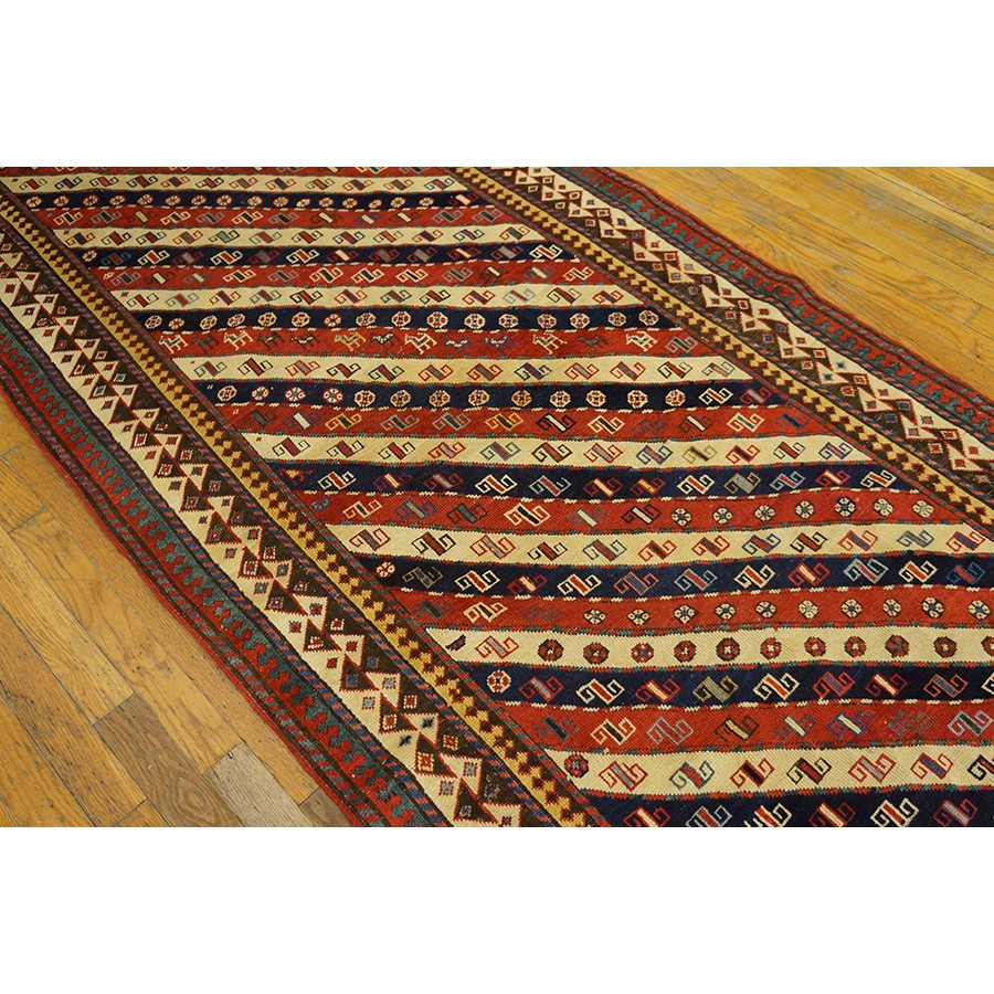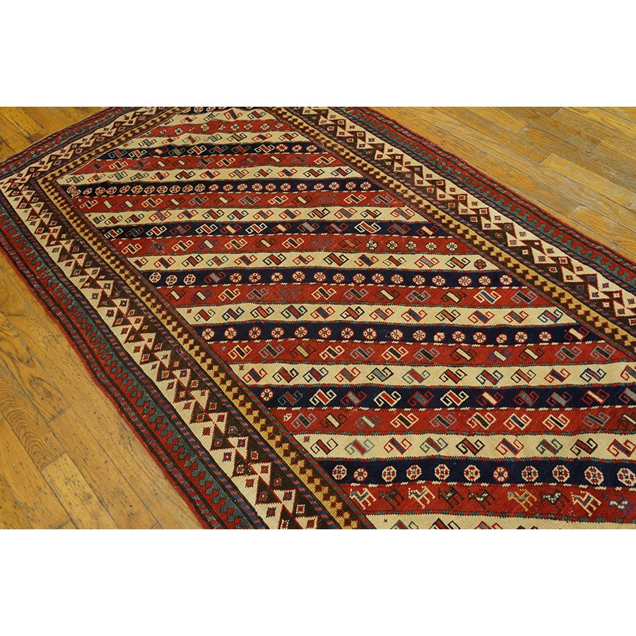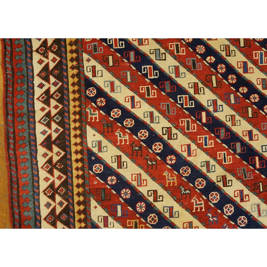 DescriptionCaucasianThis is the general heading for all rugs made in the Caucasus mountains and in the trans-Caucasus areas, north of the Arax River, and between the Black and Caspian Seas. This includes rugs from the Kazak, Karabagh, Gendje, Koghan, Talish, Akstafa, Shirvan, Baku, Kuba and hesghi districts and the variants and subtypes thereof. The rugs are usually in scatter sizes and of all wool construction, with bold colors and geometric patterns, from the 18th through 20th centuries. Prices range widely depending on rarity, color, design and condition. A strong collector market exists for the better examples. Caucasian - ShirvanThe Shirvan district of Caucasian Azerbaijan lies to the west of the Caspian sea, north of Baku. Rugs were made in huge numbers in the 19th century on composite wool and cotton foundations. There are many named subtypes among Shirvan weaves. Geometric motives fill the field, but the designs are smaller and individually less striking than those of the coarser Kazaks. Almost all rugs are scatters and runners. Dye quality varies, but the best rugs have wide, exceptional, natural dye palettes. Many Shirvans are exceptional,natural dy palettes. Many Shirvans are service rugs, but the best, for instance the Manasali prayer rugs are avidly collected and fetch extraordinary prices. | |