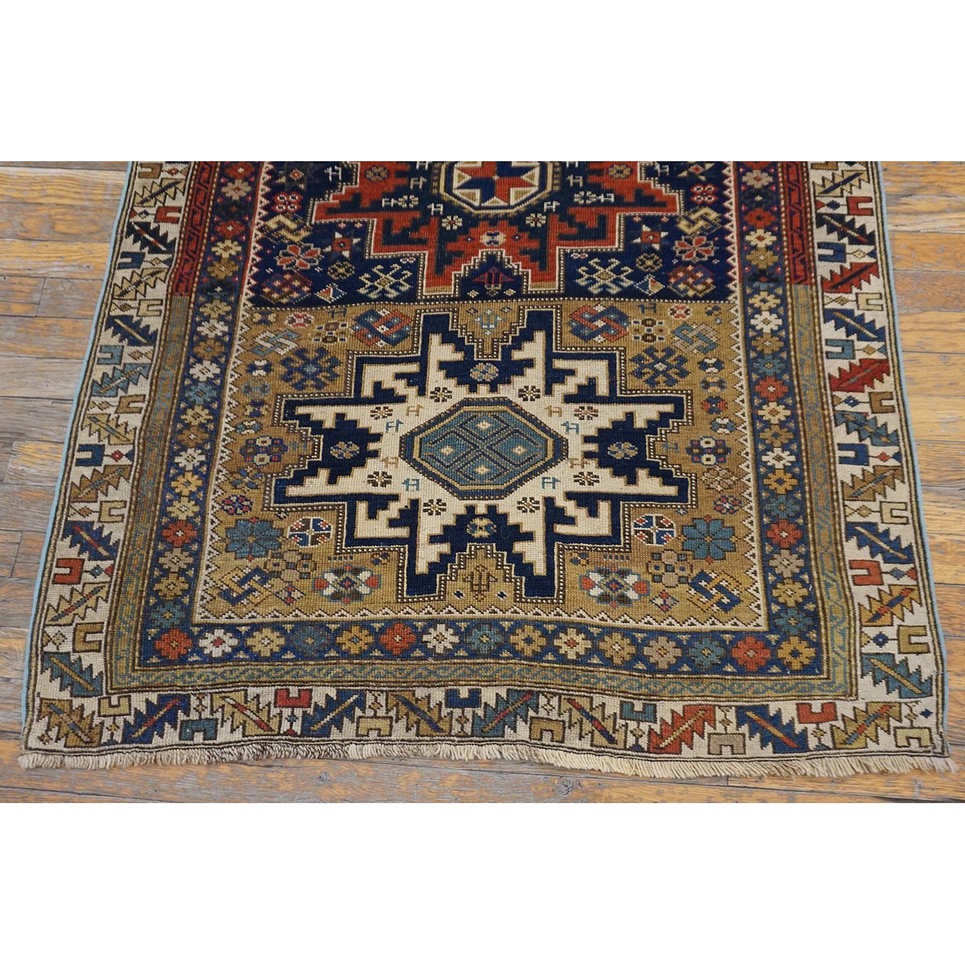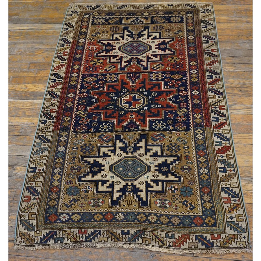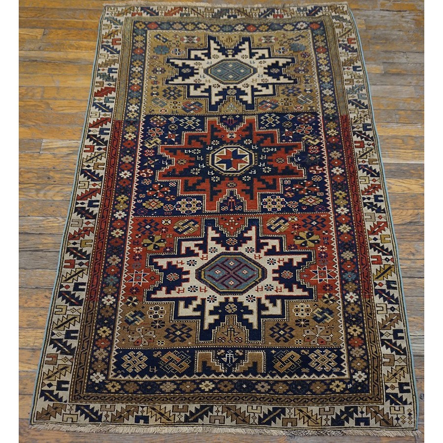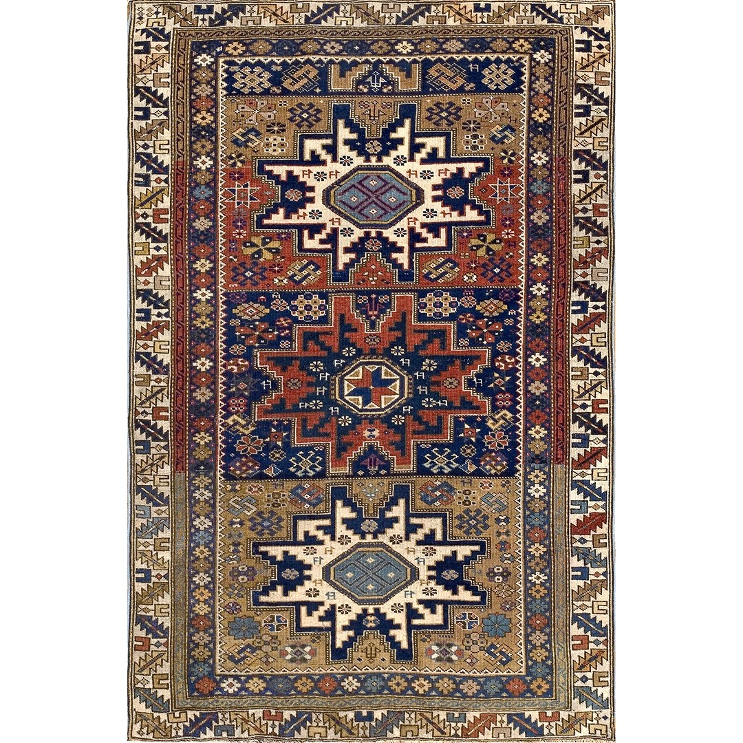 DescriptionCaucasianThis is the general heading for all rugs made in the Caucasus mountains and in the trans-Caucasus areas, north of the Arax River, and between the Black and Caspian Seas. This includes rugs from the Kazak, Karabagh, Gendje, Koghan, Talish, Akstafa, Shirvan, Baku, Kuba and hesghi districts and the variants and subtypes thereof. The rugs are usually in scatter sizes and of all wool construction, with bold colors and geometric patterns, from the 18th through 20th centuries. Prices range widely depending on rarity, color, design and condition. A strong collector market exists for the better examples. Caucasian - ShirvanThe Shirvan district of Caucasian Azerbaijan lies to the west of the Caspian sea, north of Baku. Rugs were made in huge numbers in the 19th century on composite wool and cotton foundations. There are many named subtypes among Shirvan weaves. Geometric motives fill the field, but the designs are smaller and individually less striking than those of the coarser Kazaks. Almost all rugs are scatters and runners. Dye quality varies, but the best rugs have wide, exceptional, natural dye palettes. Many Shirvans are exceptional,natural dy palettes. Many Shirvans are service rugs, but the best, for instance the Manasali prayer rugs are avidly collected and fetch extraordinary prices. | |
