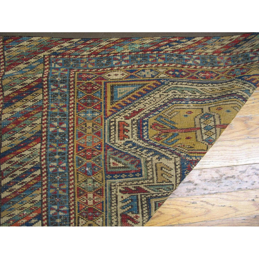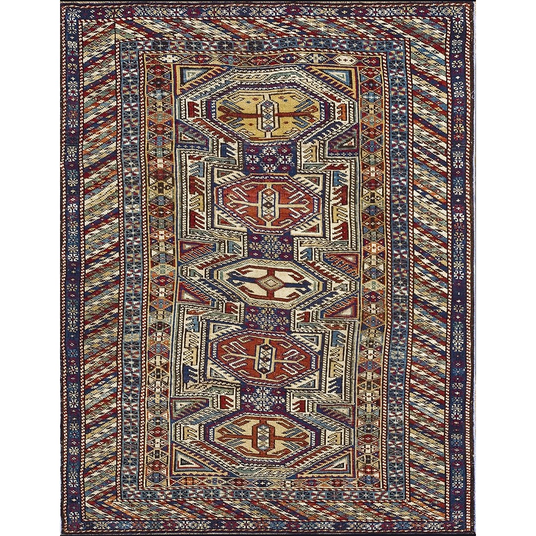 DescriptionCaucasianThis is the general heading for all rugs made in the Caucasus mountains and in the trans-Caucasus areas, north of the Arax River, and between the Black and Caspian Seas. This includes rugs from the Kazak, Karabagh, Gendje, Koghan, Talish, Akstafa, Shirvan, Baku, Kuba and hesghi districts and the variants and subtypes thereof. The rugs are usually in scatter sizes and of all wool construction, with bold colors and geometric patterns, from the 18th through 20th centuries. Prices range widely depending on rarity, color, design and condition. A strong collector market exists for the better examples. Caucasian - ShirvanThe Shirvan district of Caucasian Azerbaijan lies to the west of the Caspian sea, north of Baku. Rugs were made in huge numbers in the 19th century on composite wool and cotton foundations. There are many named subtypes among Shirvan weaves. Geometric motives fill the field, but the designs are smaller and individually less striking than those of the coarser Kazaks. Almost all rugs are scatters and runners. Dye quality varies, but the best rugs have wide, exceptional, natural dye palettes. Many Shirvans are exceptional,natural dy palettes. Many Shirvans are service rugs, but the best, for instance the Manasali prayer rugs are avidly collected and fetch extraordinary prices. | |