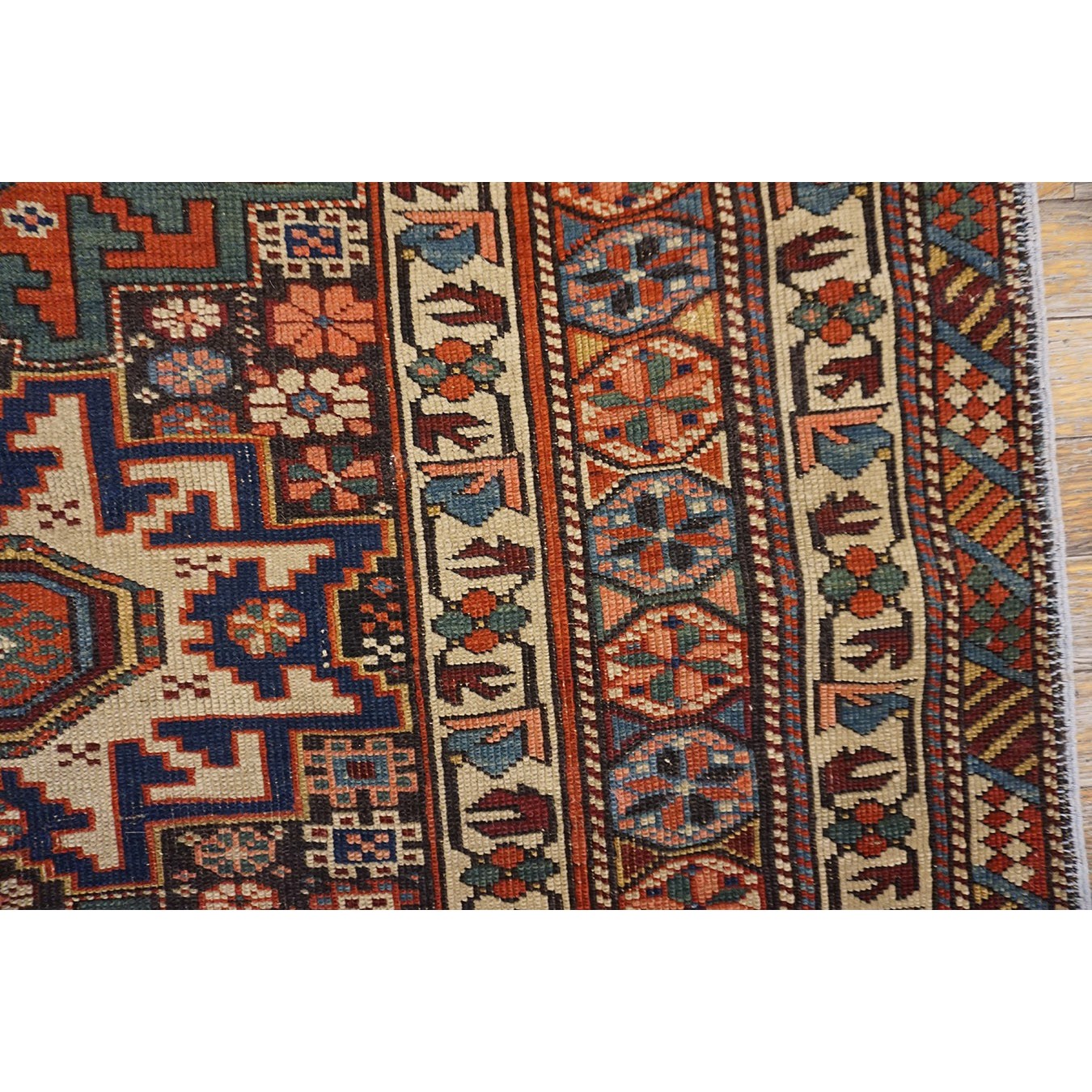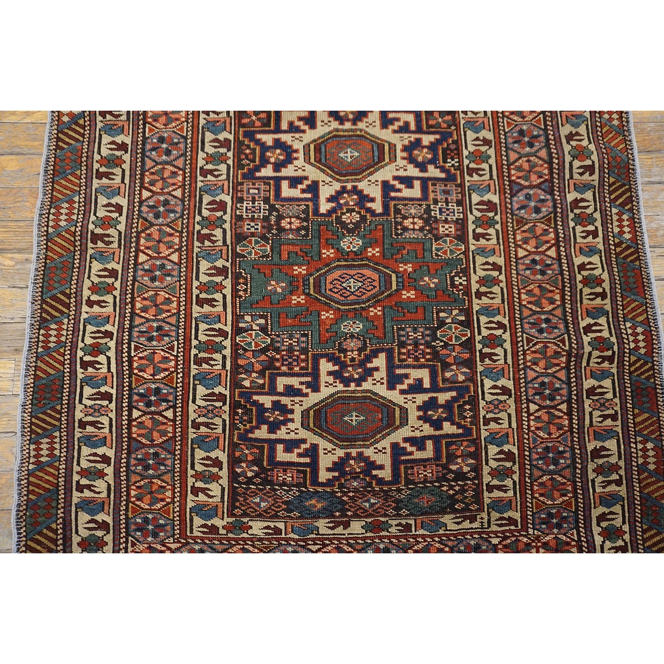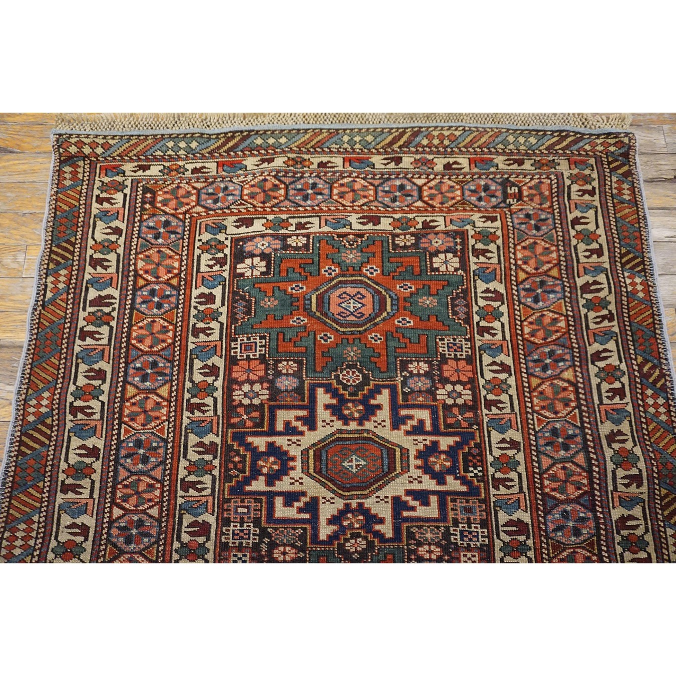 DescriptionCaucasianThis is the general heading for all rugs made in the Caucasus mountains and in the trans-Caucasus areas, north of the Arax River, and between the Black and Caspian Seas. This includes rugs from the Kazak, Karabagh, Gendje, Koghan, Talish, Akstafa, Shirvan, Baku, Kuba and hesghi districts and the variants and subtypes thereof. The rugs are usually in scatter sizes and of all wool construction, with bold colors and geometric patterns, from the 18th through 20th centuries. Prices range widely depending on rarity, color, design and condition. A strong collector market exists for the better examples. Caucasian - ShirvanThe Shirvan district of Caucasian Azerbaijan lies to the west of the Caspian sea, north of Baku. Rugs were made in huge numbers in the 19th century on composite wool and cotton foundations. There are many named subtypes among Shirvan weaves. Geometric motives fill the field, but the designs are smaller and individually less striking than those of the coarser Kazaks. Almost all rugs are scatters and runners. Dye quality varies, but the best rugs have wide, exceptional, natural dye palettes. Many Shirvans are exceptional,natural dy palettes. Many Shirvans are service rugs, but the best, for instance the Manasali prayer rugs are avidly collected and fetch extraordinary prices. | |