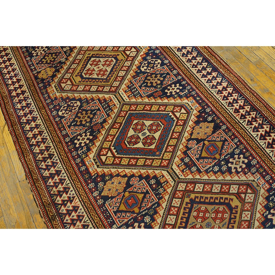 DescriptionCaucasianThis is the general heading for all rugs made in the Caucasus mountains and in the trans-Caucasus areas, north of the Arax River, and between the Black and Caspian Seas. This includes rugs from the Kazak, Karabagh, Gendje, Koghan, Talish, Akstafa, Shirvan, Baku, Kuba and hesghi districts and the variants and subtypes thereof. The rugs are usually in scatter sizes and of all wool construction, with bold colors and geometric patterns, from the 18th through 20th centuries. Prices range widely depending on rarity, color, design and condition. A strong collector market exists for the better examples. Caucasian - ShirvanThe Shirvan district of Caucasian Azerbaijan lies to the west of the Caspian sea, north of Baku. Rugs were made in huge numbers in the 19th century on composite wool and cotton foundations. There are many named subtypes among Shirvan weaves. Geometric motives fill the field, but the designs are smaller and individually less striking than those of the coarser Kazaks. Almost all rugs are scatters and runners. Dye quality varies, but the best rugs have wide, exceptional, natural dye palettes. Many Shirvans are exceptional,natural dy palettes. Many Shirvans are service rugs, but the best, for instance the Manasali prayer rugs are avidly collected and fetch extraordinary prices. | |