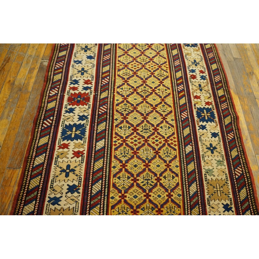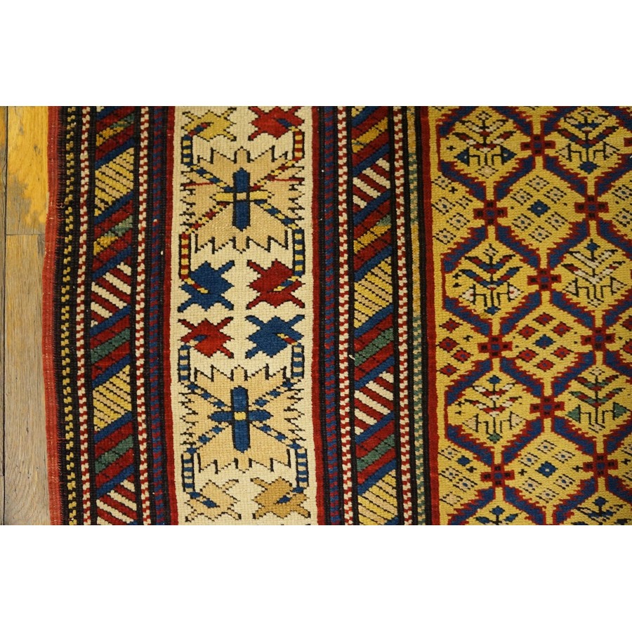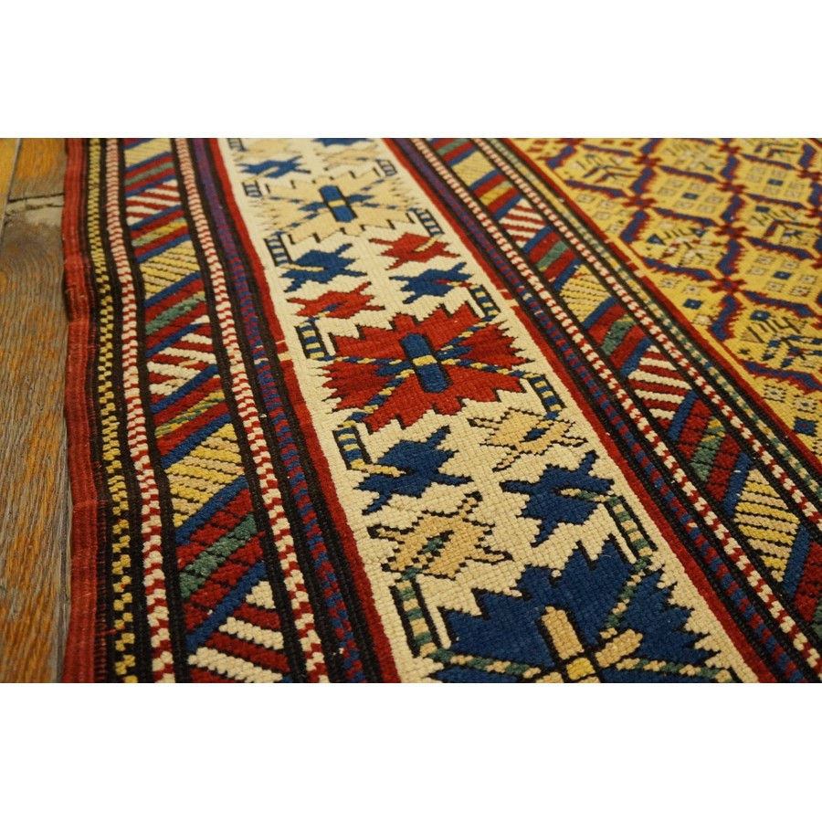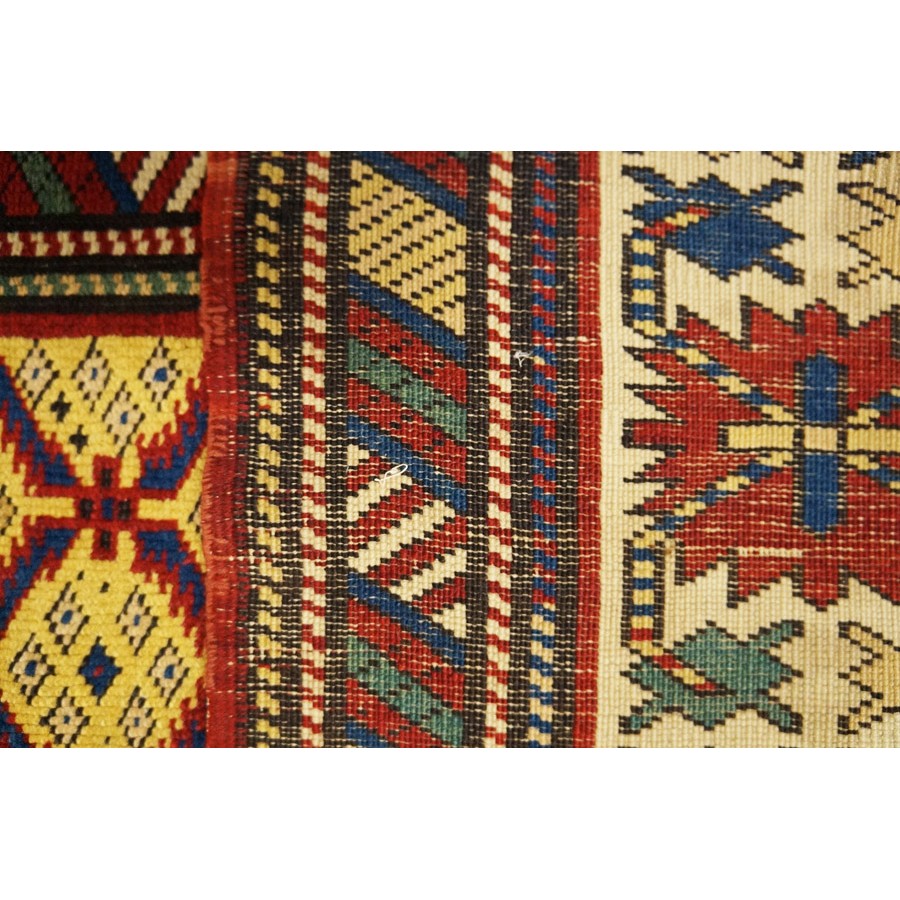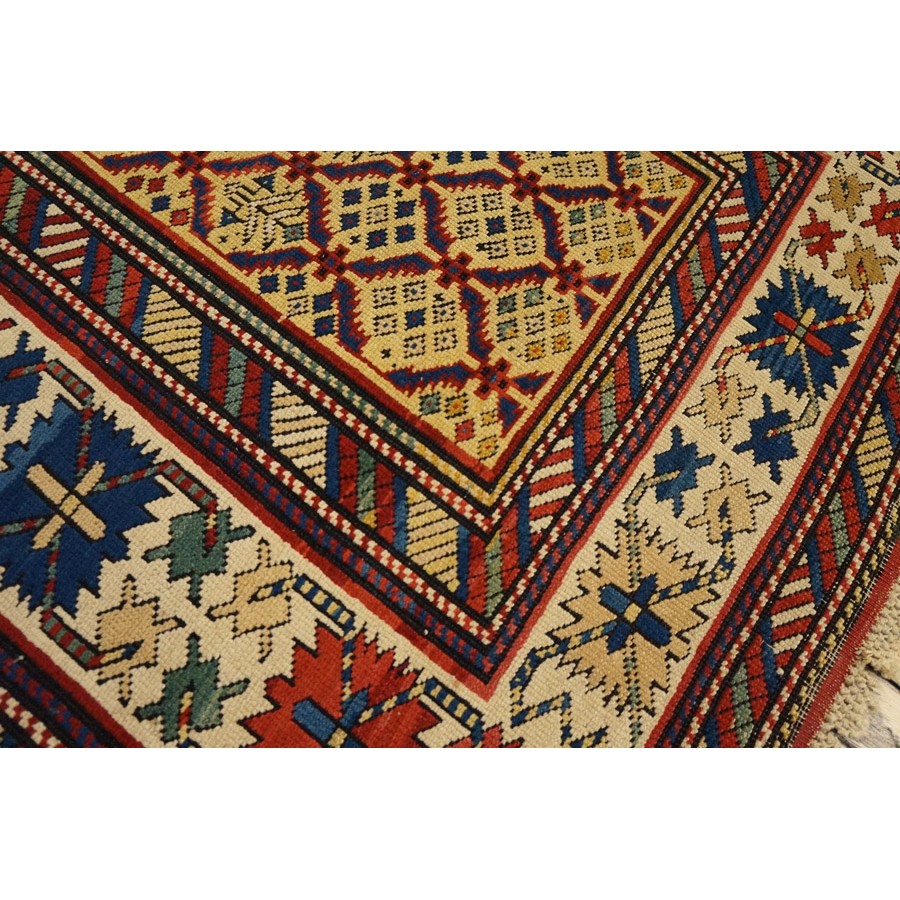 DescriptionCaucasianThis is the general heading for all rugs made in the Caucasus mountains and in the trans-Caucasus areas, north of the Arax River, and between the Black and Caspian Seas. This includes rugs from the Kazak, Karabagh, Gendje, Koghan, Talish, Akstafa, Shirvan, Baku, Kuba and hesghi districts and the variants and subtypes thereof. The rugs are usually in scatter sizes and of all wool construction, with bold colors and geometric patterns, from the 18th through 20th centuries. Prices range widely depending on rarity, color, design and condition. A strong collector market exists for the better examples. Caucasian - ShirvanThe Shirvan district of Caucasian Azerbaijan lies to the west of the Caspian sea, north of Baku. Rugs were made in huge numbers in the 19th century on composite wool and cotton foundations. There are many named subtypes among Shirvan weaves. Geometric motives fill the field, but the designs are smaller and individually less striking than those of the coarser Kazaks. Almost all rugs are scatters and runners. Dye quality varies, but the best rugs have wide, exceptional, natural dye palettes. Many Shirvans are exceptional,natural dy palettes. Many Shirvans are service rugs, but the best, for instance the Manasali prayer rugs are avidly collected and fetch extraordinary prices. | |