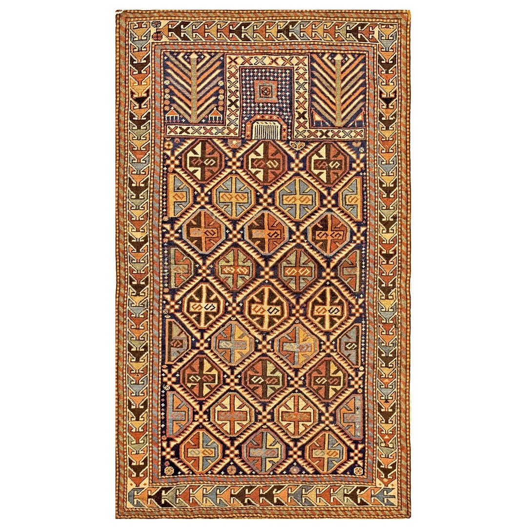 DescriptionCaucasianThis is the general heading for all rugs made in the Caucasus mountains and in the trans-Caucasus areas, north of the Arax River, and between the Black and Caspian Seas. This includes rugs from the Kazak, Karabagh, Gendje, Koghan, Talish, Akstafa, Shirvan, Baku, Kuba and hesghi districts and the variants and subtypes thereof. The rugs are usually in scatter sizes and of all wool construction, with bold colors and geometric patterns, from the 18th through 20th centuries. Prices range widely depending on rarity, color, design and condition. A strong collector market exists for the better examples. CaucasianThis is the general heading for all rugs made in the Caucasus mountains and in the trans-Caucasus areas, north of the Arax River, and between the Black and Caspian Seas. This includes rugs from the Kazak, Karabagh, Gendje, Koghan, Talish, Akstafa, Shirvan, Baku, Kuba and hesghi districts and the variants and subtypes thereof. The rugs are usually in scatter sizes and of all wool construction, with bold colors and geometric patterns, from the 18th through 20th centuries. Prices range widely depending on rarity, color, design and condition. A strong collector market exists for the better examples. | |