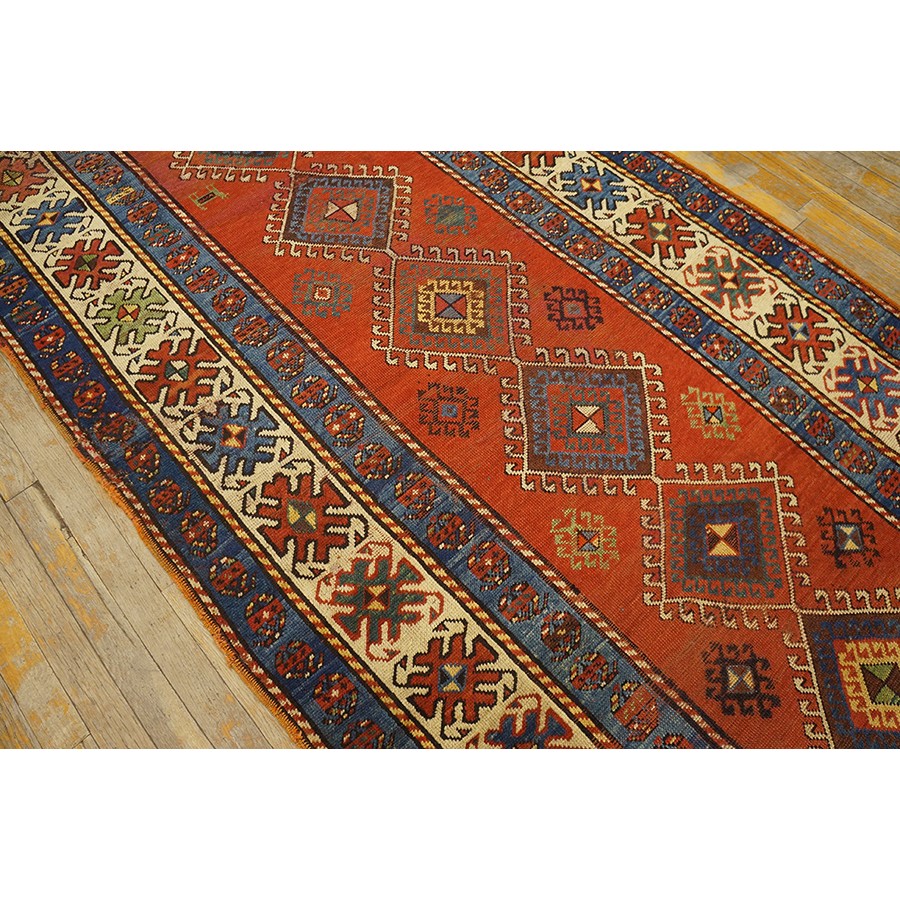 DescriptionCaucasianThis is the general heading for all rugs made in the Caucasus mountains and in the trans-Caucasus areas, north of the Arax River, and between the Black and Caspian Seas. This includes rugs from the Kazak, Karabagh, Gendje, Koghan, Talish, Akstafa, Shirvan, Baku, Kuba and hesghi districts and the variants and subtypes thereof. The rugs are usually in scatter sizes and of all wool construction, with bold colors and geometric patterns, from the 18th through 20th centuries. Prices range widely depending on rarity, color, design and condition. A strong collector market exists for the better examples. CaucasianThis is the general heading for all rugs made in the Caucasus mountains and in the trans-Caucasus areas, north of the Arax River, and between the Black and Caspian Seas. This includes rugs from the Kazak, Karabagh, Gendje, Koghan, Talish, Akstafa, Shirvan, Baku, Kuba and hesghi districts and the variants and subtypes thereof. The rugs are usually in scatter sizes and of all wool construction, with bold colors and geometric patterns, from the 18th through 20th centuries. Prices range widely depending on rarity, color, design and condition. A strong collector market exists for the better examples. | |