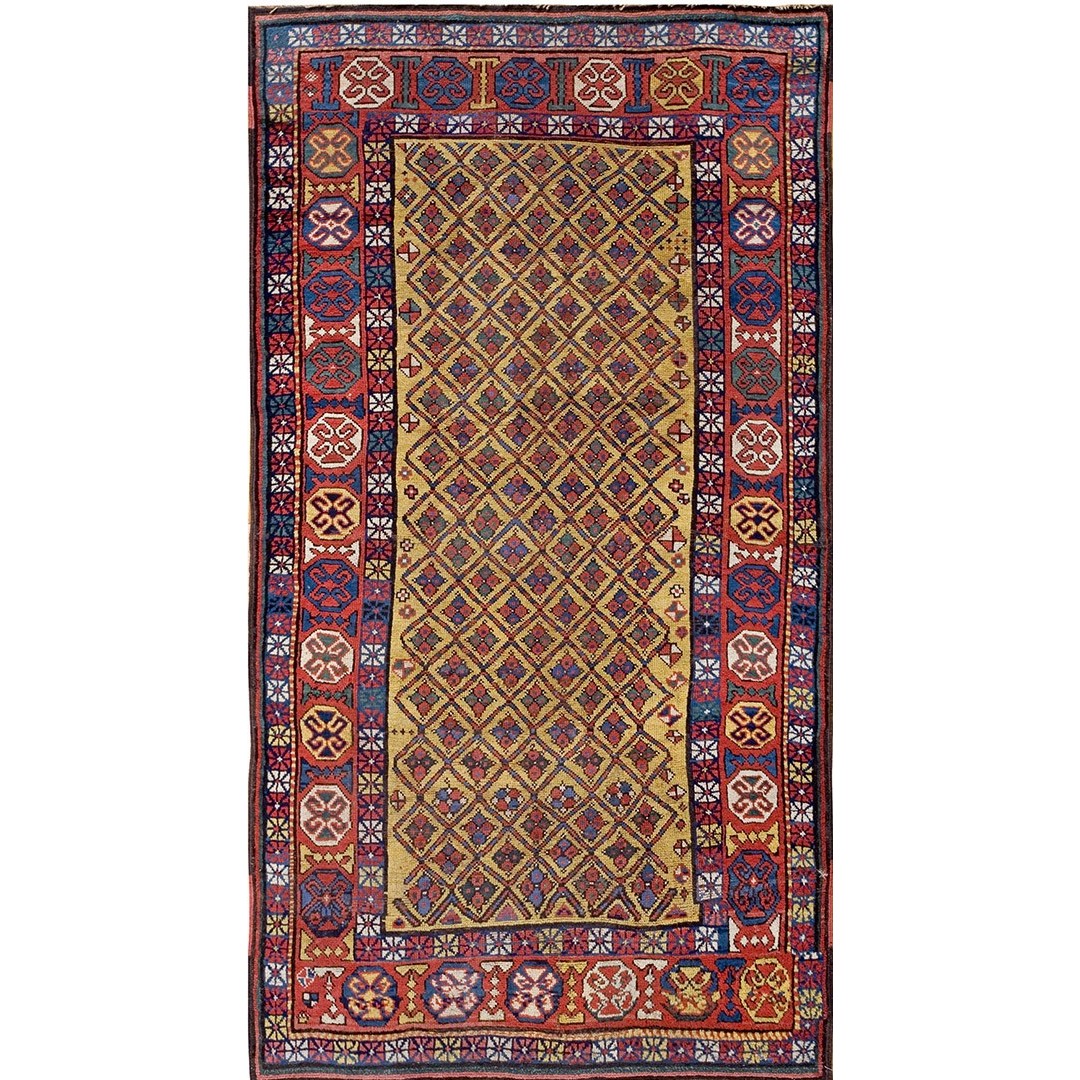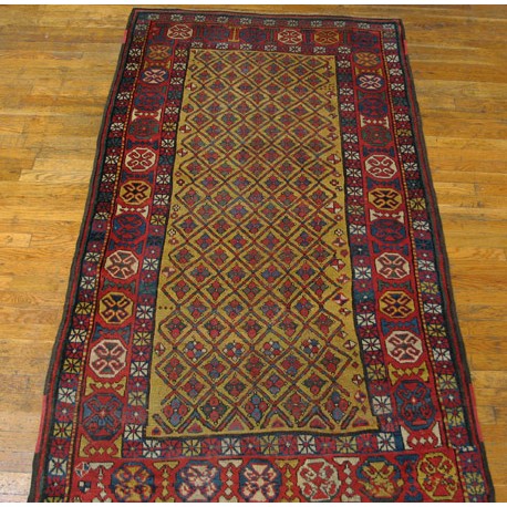 DescriptionCaucasianThis is the general heading for all rugs made in the Caucasus mountains and in the trans-Caucasus areas, north of the Arax River, and between the Black and Caspian Seas. This includes rugs from the Kazak, Karabagh, Gendje, Koghan, Talish, Akstafa, Shirvan, Baku, Kuba and hesghi districts and the variants and subtypes thereof. The rugs are usually in scatter sizes and of all wool construction, with bold colors and geometric patterns, from the 18th through 20th centuries. Prices range widely depending on rarity, color, design and condition. A strong collector market exists for the better examples. CaucasianThis is the general heading for all rugs made in the Caucasus mountains and in the trans-Caucasus areas, north of the Arax River, and between the Black and Caspian Seas. This includes rugs from the Kazak, Karabagh, Gendje, Koghan, Talish, Akstafa, Shirvan, Baku, Kuba and hesghi districts and the variants and subtypes thereof. The rugs are usually in scatter sizes and of all wool construction, with bold colors and geometric patterns, from the 18th through 20th centuries. Prices range widely depending on rarity, color, design and condition. A strong collector market exists for the better examples. | |