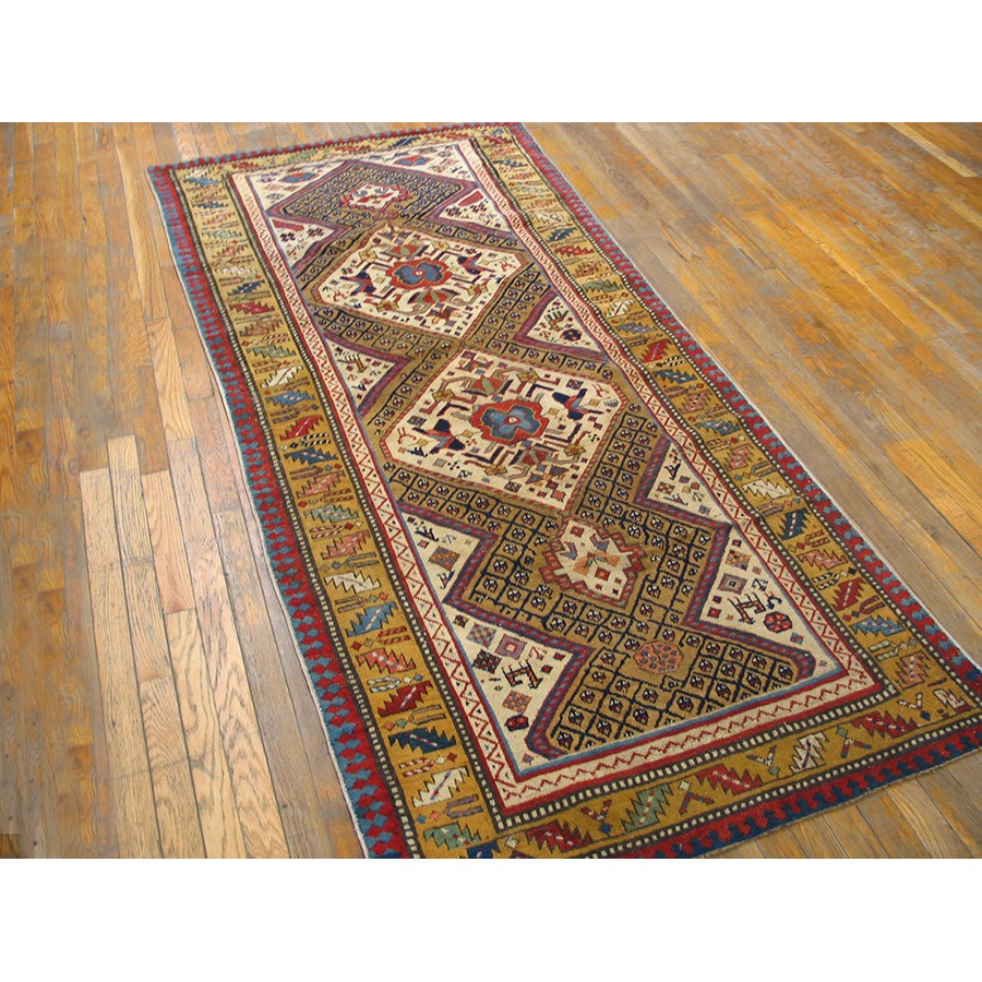 DescriptionCaucasianThis is the general heading for all rugs made in the Caucasus mountains and in the trans-Caucasus areas, north of the Arax River, and between the Black and Caspian Seas. This includes rugs from the Kazak, Karabagh, Gendje, Koghan, Talish, Akstafa, Shirvan, Baku, Kuba and hesghi districts and the variants and subtypes thereof. The rugs are usually in scatter sizes and of all wool construction, with bold colors and geometric patterns, from the 18th through 20th centuries. Prices range widely depending on rarity, color, design and condition. A strong collector market exists for the better examples. CaucasianThis is the general heading for all rugs made in the Caucasus mountains and in the trans-Caucasus areas, north of the Arax River, and between the Black and Caspian Seas. This includes rugs from the Kazak, Karabagh, Gendje, Koghan, Talish, Akstafa, Shirvan, Baku, Kuba and hesghi districts and the variants and subtypes thereof. The rugs are usually in scatter sizes and of all wool construction, with bold colors and geometric patterns, from the 18th through 20th centuries. Prices range widely depending on rarity, color, design and condition. A strong collector market exists for the better examples. | |