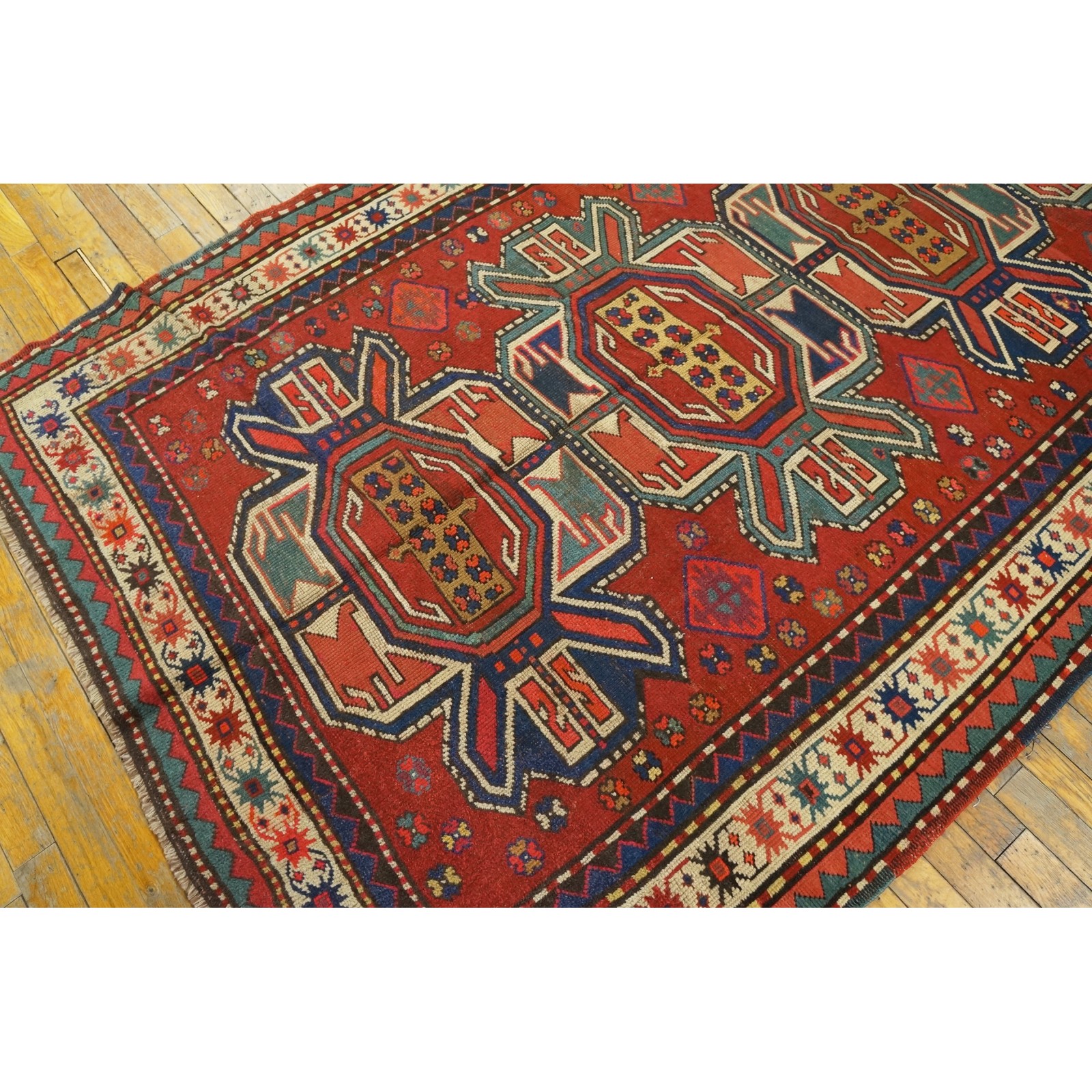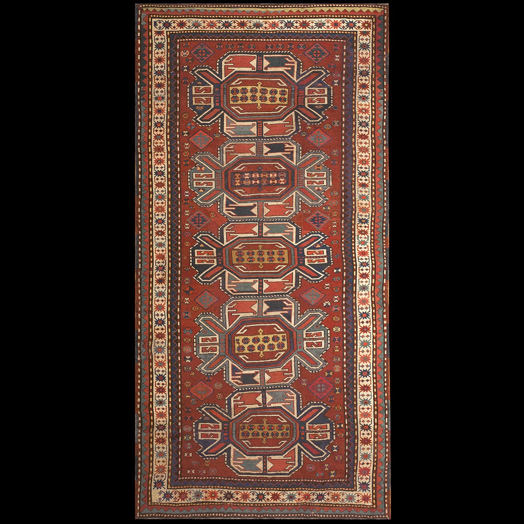 DescriptionCaucasianThis is the general heading for all rugs made in the Caucasus mountains and in the trans-Caucasus areas, north of the Arax River, and between the Black and Caspian Seas. This includes rugs from the Kazak, Karabagh, Gendje, Koghan, Talish, Akstafa, Shirvan, Baku, Kuba and hesghi districts and the variants and subtypes thereof. The rugs are usually in scatter sizes and of all wool construction, with bold colors and geometric patterns, from the 18th through 20th centuries. Prices range widely depending on rarity, color, design and condition. A strong collector market exists for the better examples. CaucasianThis is the general heading for all rugs made in the Caucasus mountains and in the trans-Caucasus areas, north of the Arax River, and between the Black and Caspian Seas. This includes rugs from the Kazak, Karabagh, Gendje, Koghan, Talish, Akstafa, Shirvan, Baku, Kuba and hesghi districts and the variants and subtypes thereof. The rugs are usually in scatter sizes and of all wool construction, with bold colors and geometric patterns, from the 18th through 20th centuries. Prices range widely depending on rarity, color, design and condition. A strong collector market exists for the better examples. | |