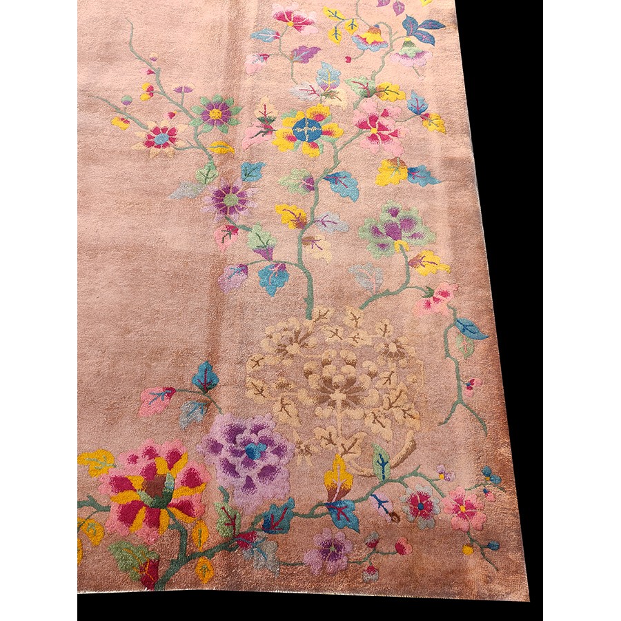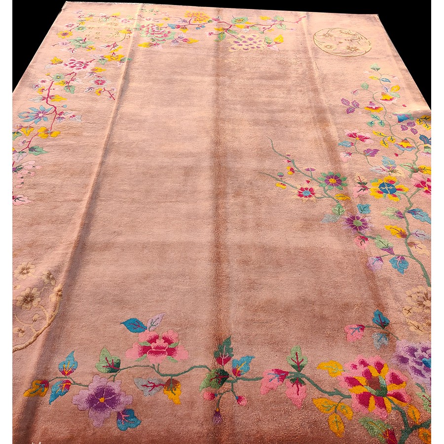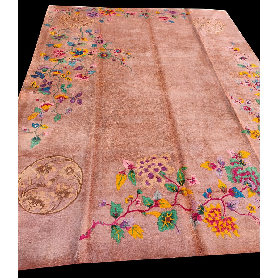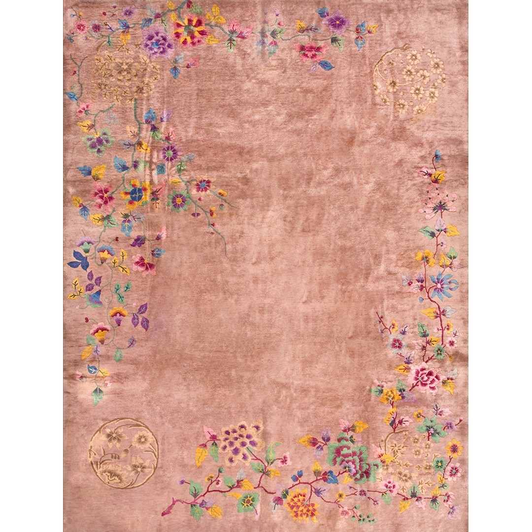 DescriptionChineseCarpets made in China proper. See entries Ningshia, Peking, Art Deco. Chinese - Art DecoAs the name implies, pieces woven between the wars for the Western market by mostly American owned firms especially Nichols and Fette, in thick heavy weaves using strong colors, asymmetric patterns and downplaying the Chinese-ness of the carpet. Nichols rugs are more strong toned than the pastel Fette. Most were woven in the coastal port city of Tientsin. Other lesser known workshops were also active. Some pieces are ultra-geometric and haute-Deco moderne in character: these are very rare. More frequent are pieces with bits of Chinese ornament: vases or other precious objects, paeonies, vines, fences, etc. Most common is the 9 x 12 size, in colors never found in mainstream Chinese rugs: backgrounds in black, mauve, purple, hot pink, orange, olive, employing the best synthetic chrome dyes of the period. Prices are still reasonable and carpets in top condition are available. | |