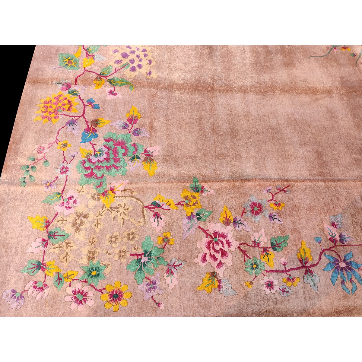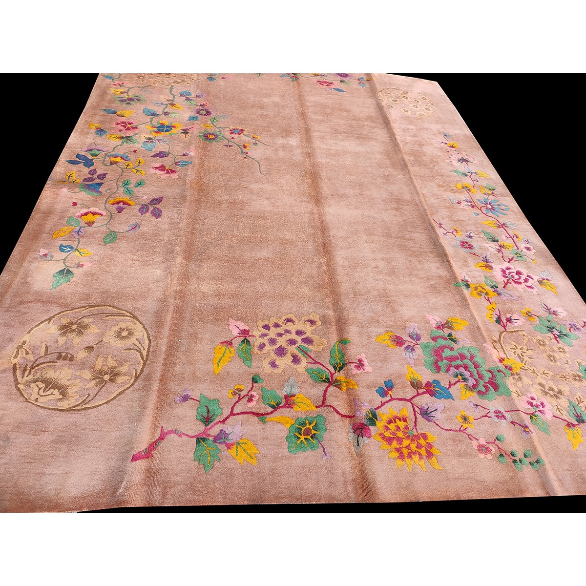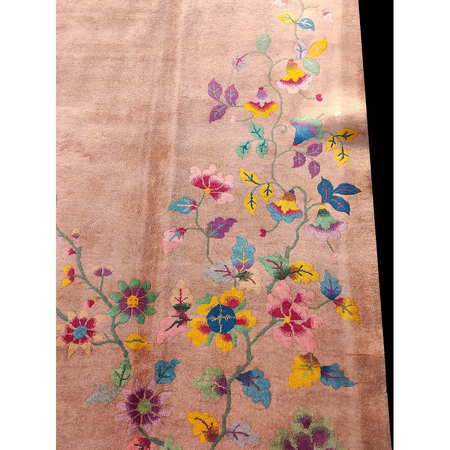 DescriptionChineseCarpets made in China proper. See entries Ningshia, Peking, Art Deco. Chinese - Art DecoAs the name implies, pieces woven between the wars for the Western market by mostly American owned firms especially Nichols and Fette, in thick heavy weaves using strong colors, asymmetric patterns and downplaying the Chinese-ness of the carpet. Nichols rugs are more strong toned than the pastel Fette. Most were woven in the coastal port city of Tientsin. Other lesser known workshops were also active. Some pieces are ultra-geometric and haute-Deco moderne in character: these are very rare. More frequent are pieces with bits of Chinese ornament: vases or other precious objects, paeonies, vines, fences, etc. Most common is the 9 x 12 size, in colors never found in mainstream Chinese rugs: backgrounds in black, mauve, purple, hot pink, orange, olive, employing the best synthetic chrome dyes of the period. Prices are still reasonable and carpets in top condition are available. | |