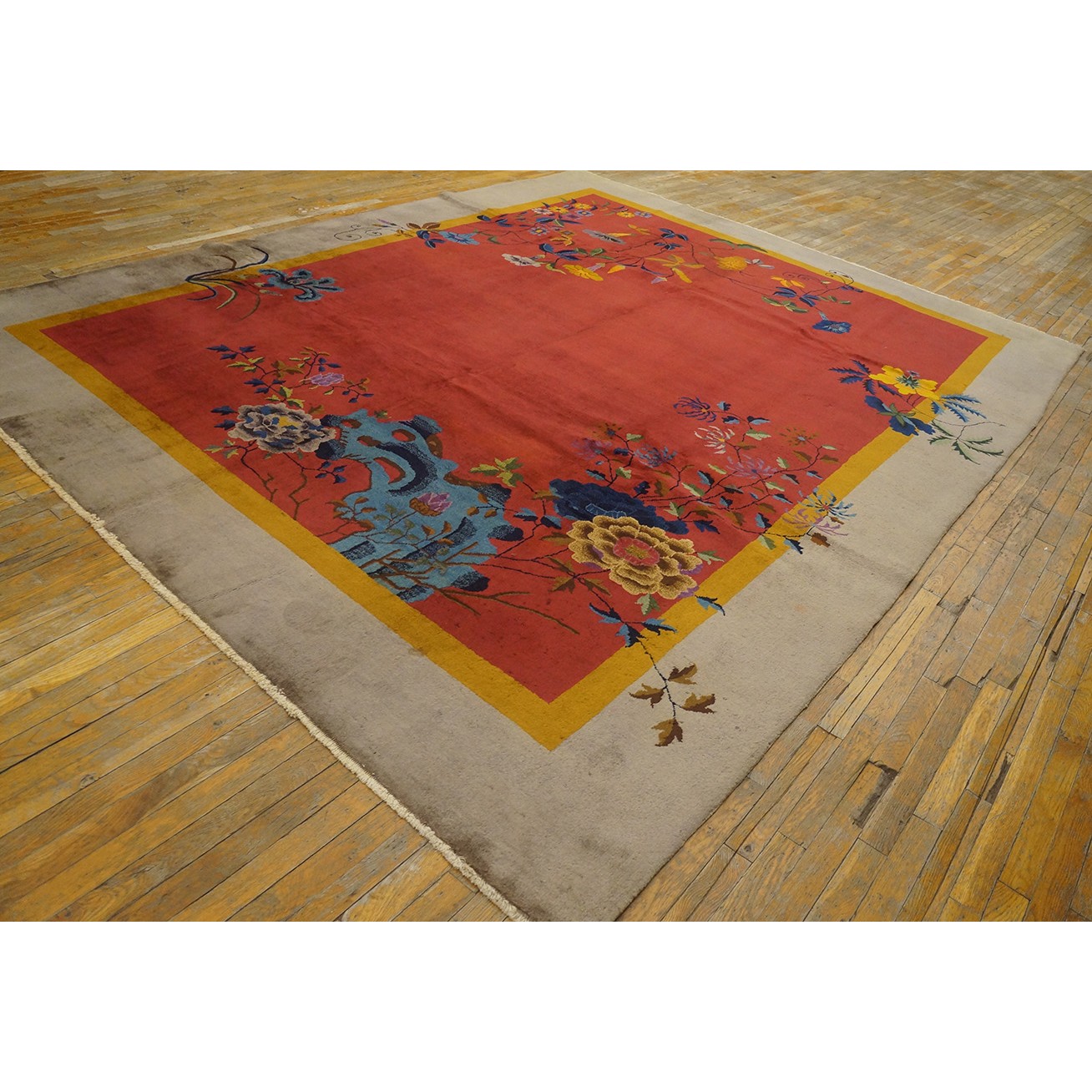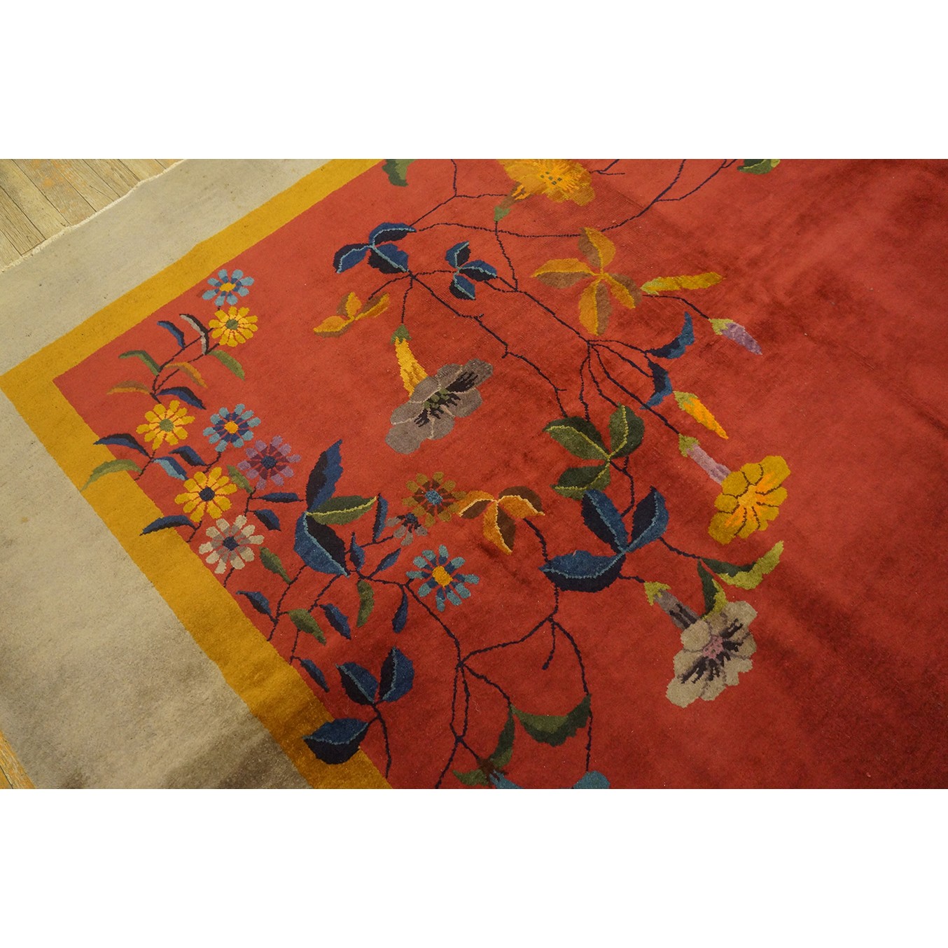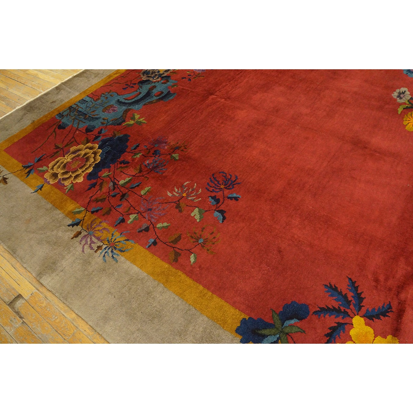 DescriptionChineseCarpets made in China proper. See entries Ningshia, Peking, Art Deco. Chinese - Art DecoAs the name implies, pieces woven between the wars for the Western market by mostly American owned firms especially Nichols and Fette, in thick heavy weaves using strong colors, asymmetric patterns and downplaying the Chinese-ness of the carpet. Nichols rugs are more strong toned than the pastel Fette. Most were woven in the coastal port city of Tientsin. Other lesser known workshops were also active. Some pieces are ultra-geometric and haute-Deco moderne in character: these are very rare. More frequent are pieces with bits of Chinese ornament: vases or other precious objects, paeonies, vines, fences, etc. Most common is the 9 x 12 size, in colors never found in mainstream Chinese rugs: backgrounds in black, mauve, purple, hot pink, orange, olive, employing the best synthetic chrome dyes of the period. Prices are still reasonable and carpets in top condition are available. | |
