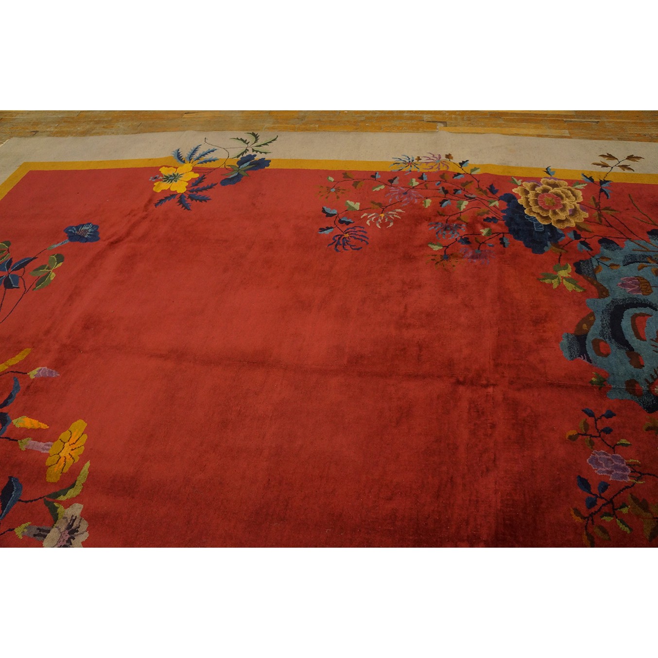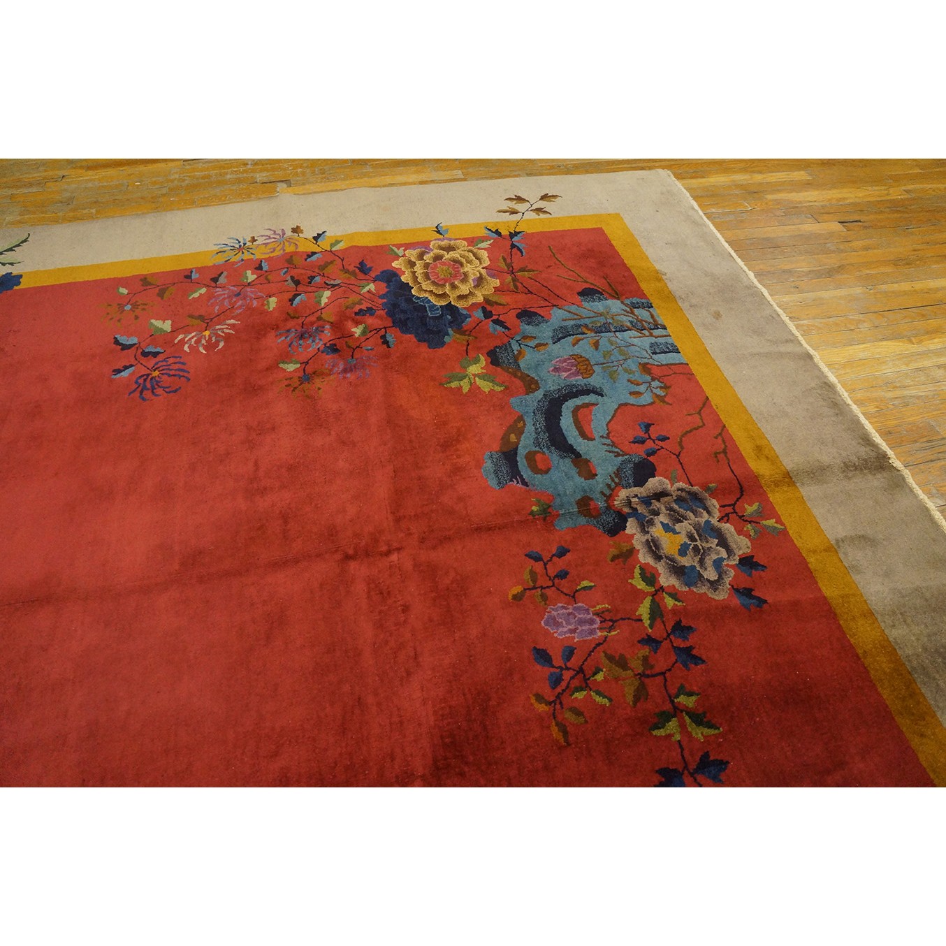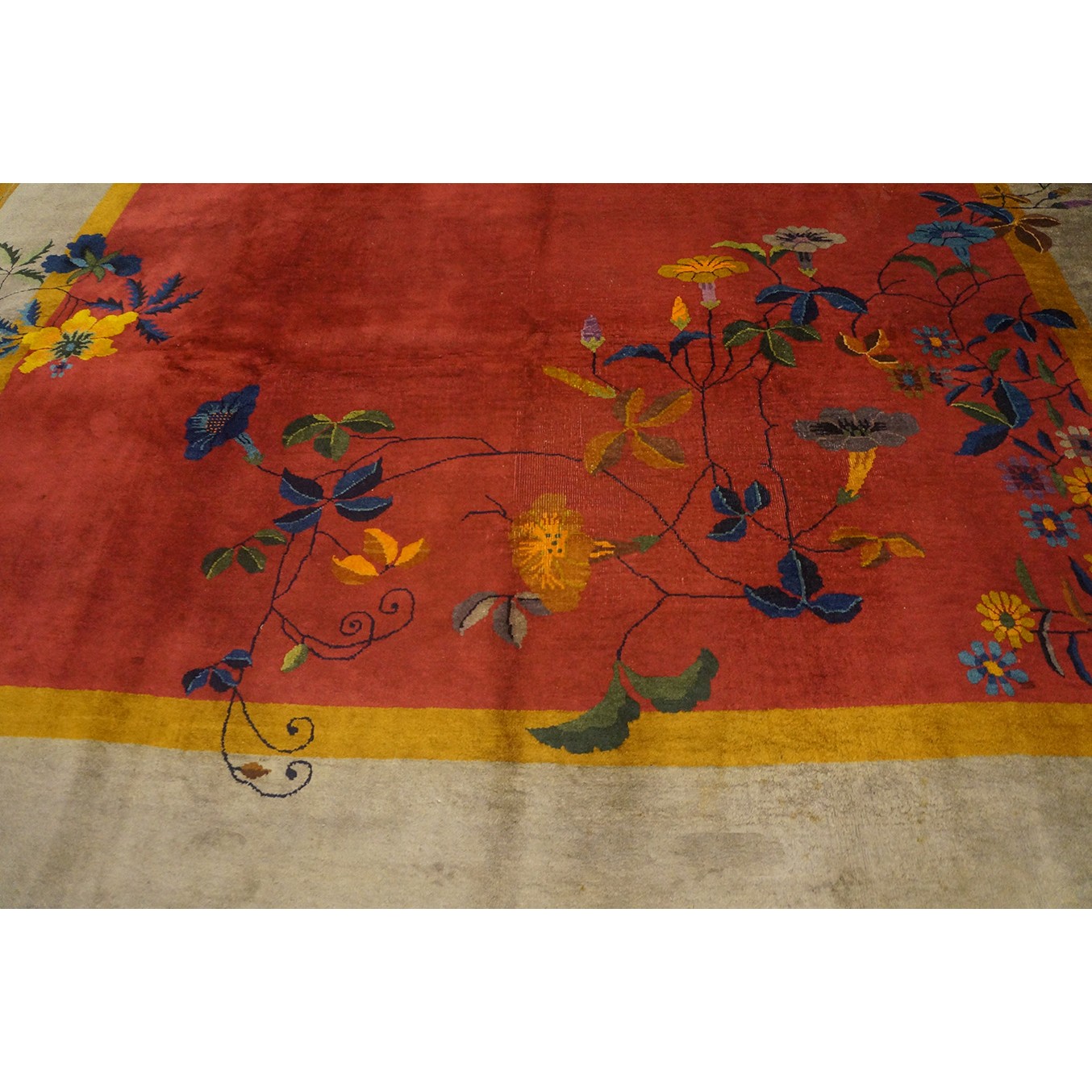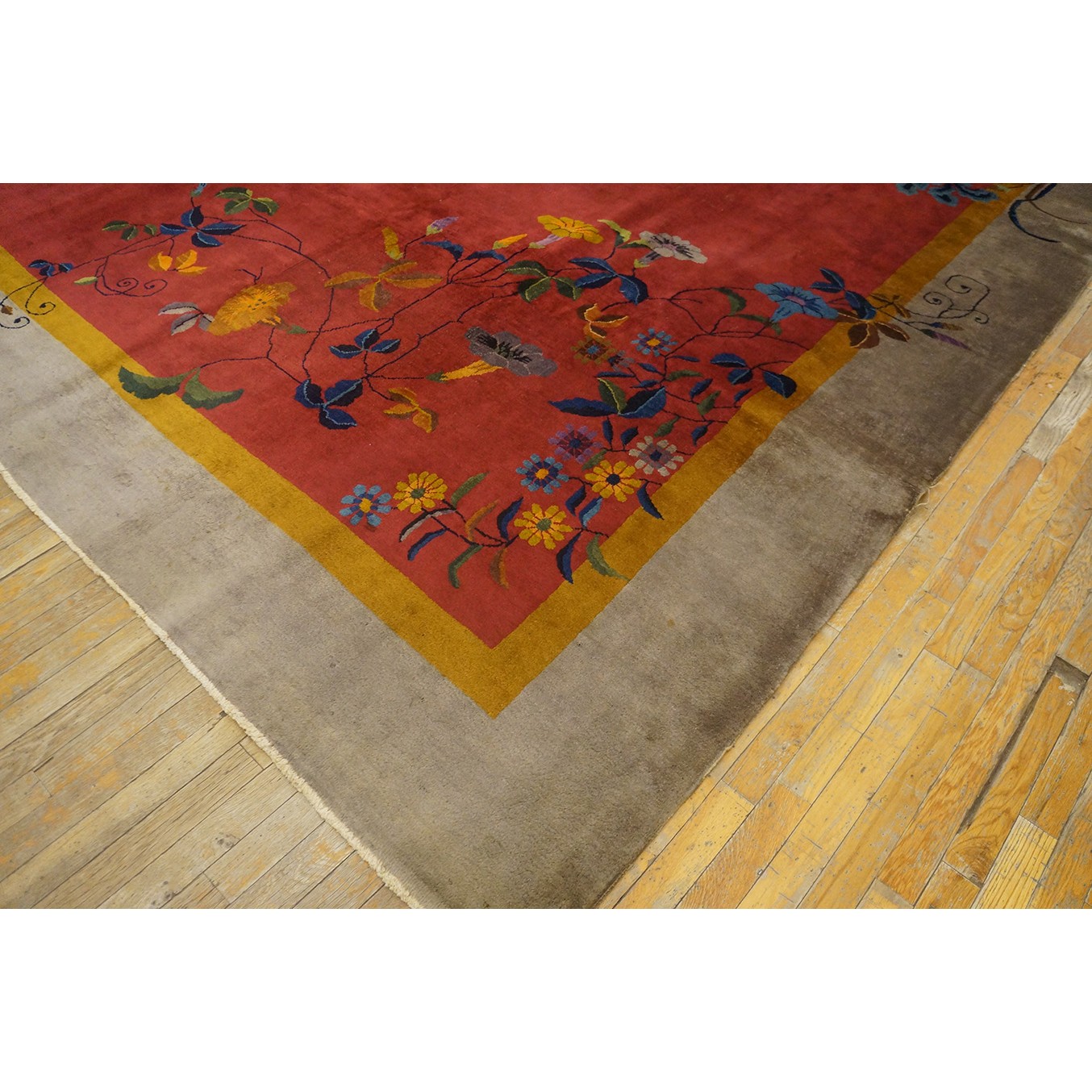 DescriptionChineseCarpets made in China proper. See entries Ningshia, Peking, Art Deco. Chinese - Art DecoAs the name implies, pieces woven between the wars for the Western market by mostly American owned firms especially Nichols and Fette, in thick heavy weaves using strong colors, asymmetric patterns and downplaying the Chinese-ness of the carpet. Nichols rugs are more strong toned than the pastel Fette. Most were woven in the coastal port city of Tientsin. Other lesser known workshops were also active. Some pieces are ultra-geometric and haute-Deco moderne in character: these are very rare. More frequent are pieces with bits of Chinese ornament: vases or other precious objects, paeonies, vines, fences, etc. Most common is the 9 x 12 size, in colors never found in mainstream Chinese rugs: backgrounds in black, mauve, purple, hot pink, orange, olive, employing the best synthetic chrome dyes of the period. Prices are still reasonable and carpets in top condition are available. | |