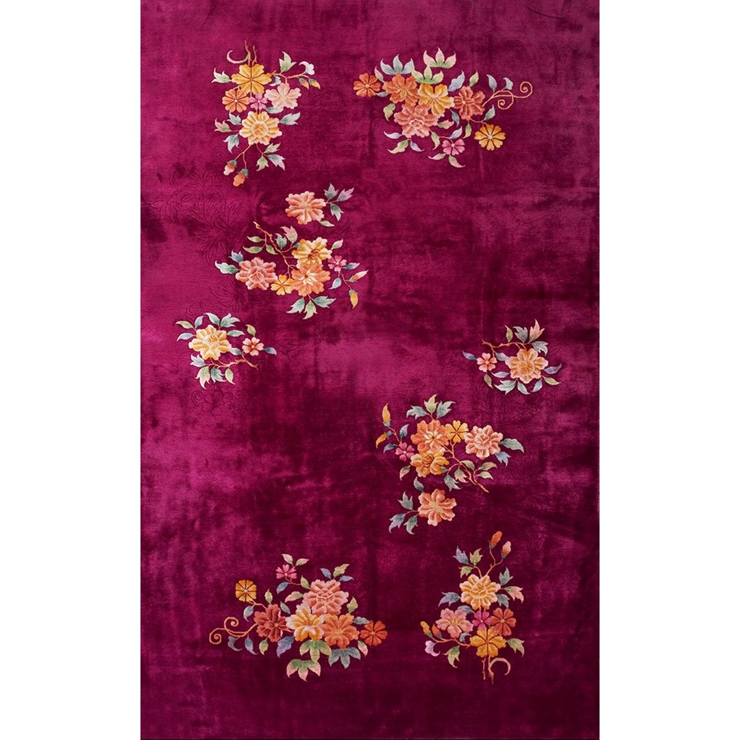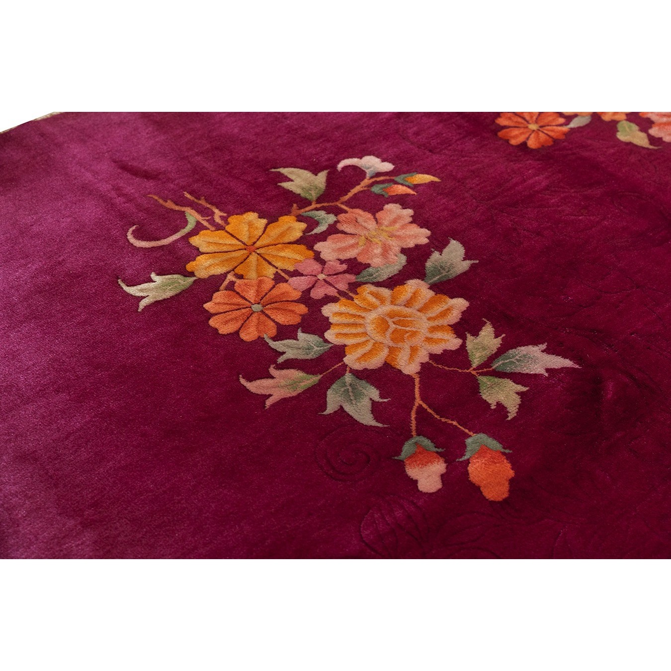 DescriptionChineseCarpets made in China proper. See entries Ningshia, Peking, Art Deco. Chinese - Art DecoAs the name implies, pieces woven between the wars for the Western market by mostly American owned firms especially Nichols and Fette, in thick heavy weaves using strong colors, asymmetric patterns and downplaying the Chinese-ness of the carpet. Nichols rugs are more strong toned than the pastel Fette. Most were woven in the coastal port city of Tientsin. Other lesser known workshops were also active. Some pieces are ultra-geometric and haute-Deco moderne in character: these are very rare. More frequent are pieces with bits of Chinese ornament: vases or other precious objects, paeonies, vines, fences, etc. Most common is the 9 x 12 size, in colors never found in mainstream Chinese rugs: backgrounds in black, mauve, purple, hot pink, orange, olive, employing the best synthetic chrome dyes of the period. Prices are still reasonable and carpets in top condition are available. | |
