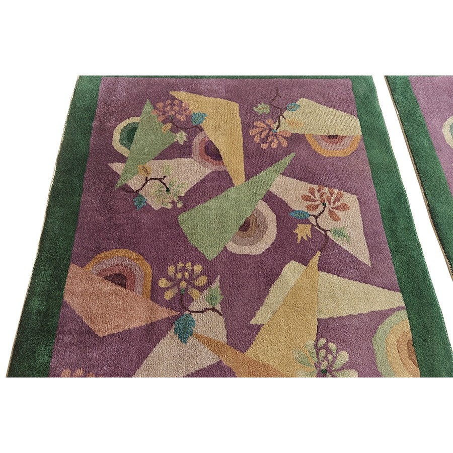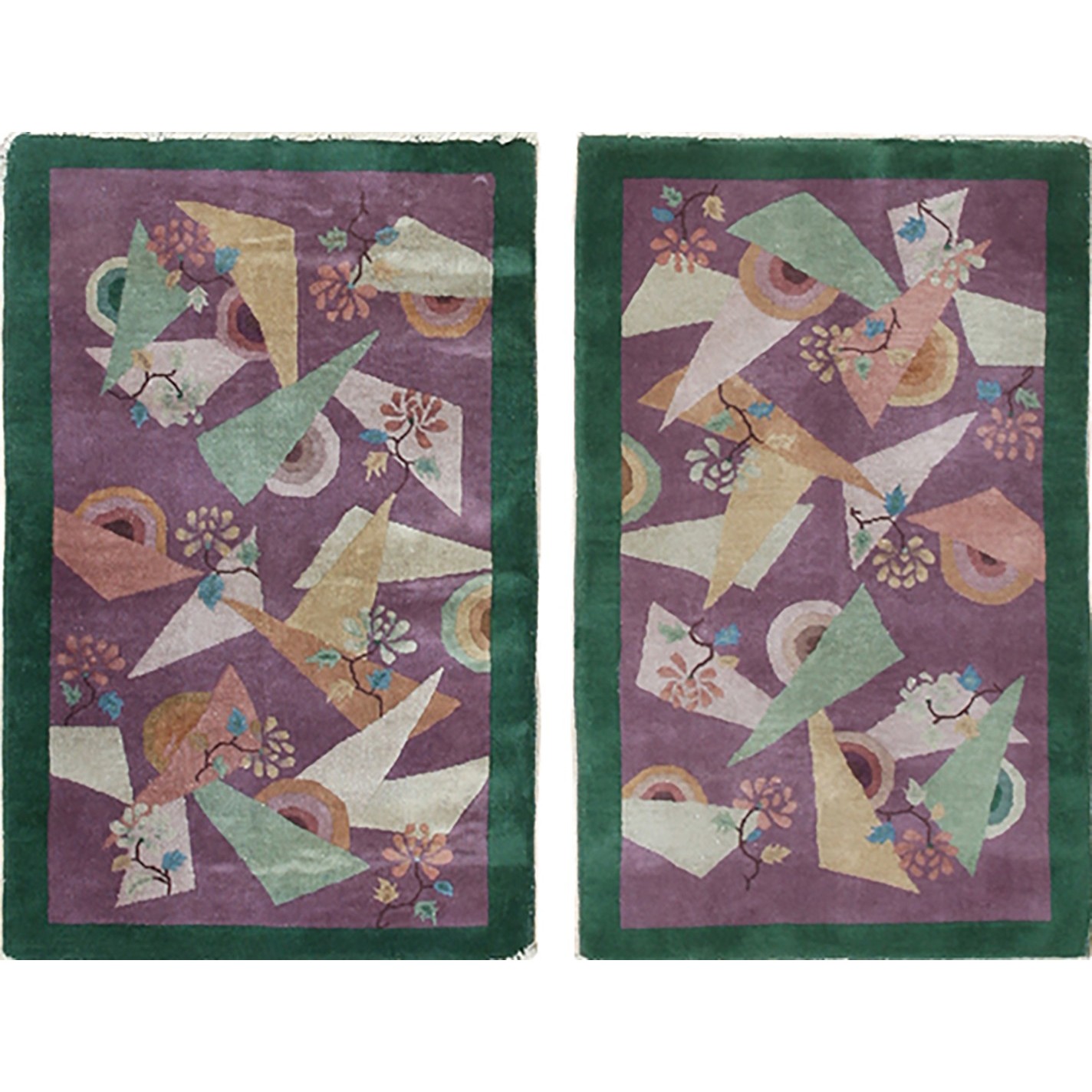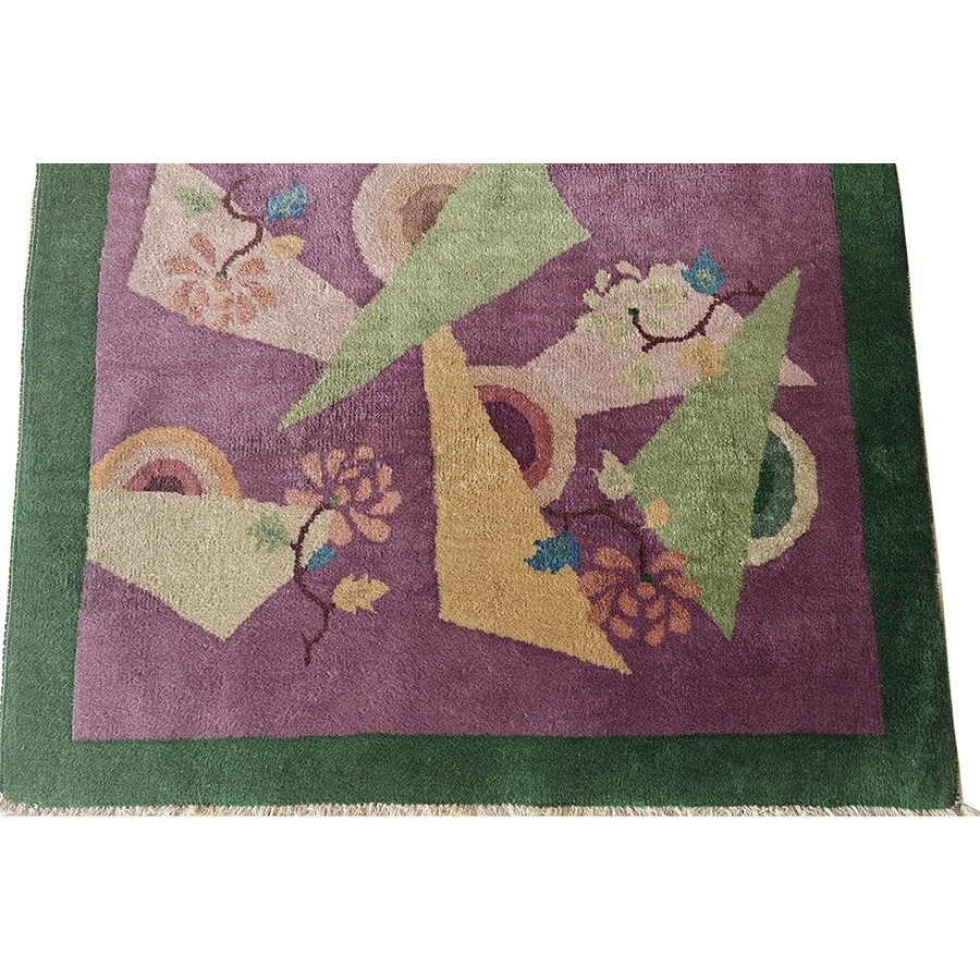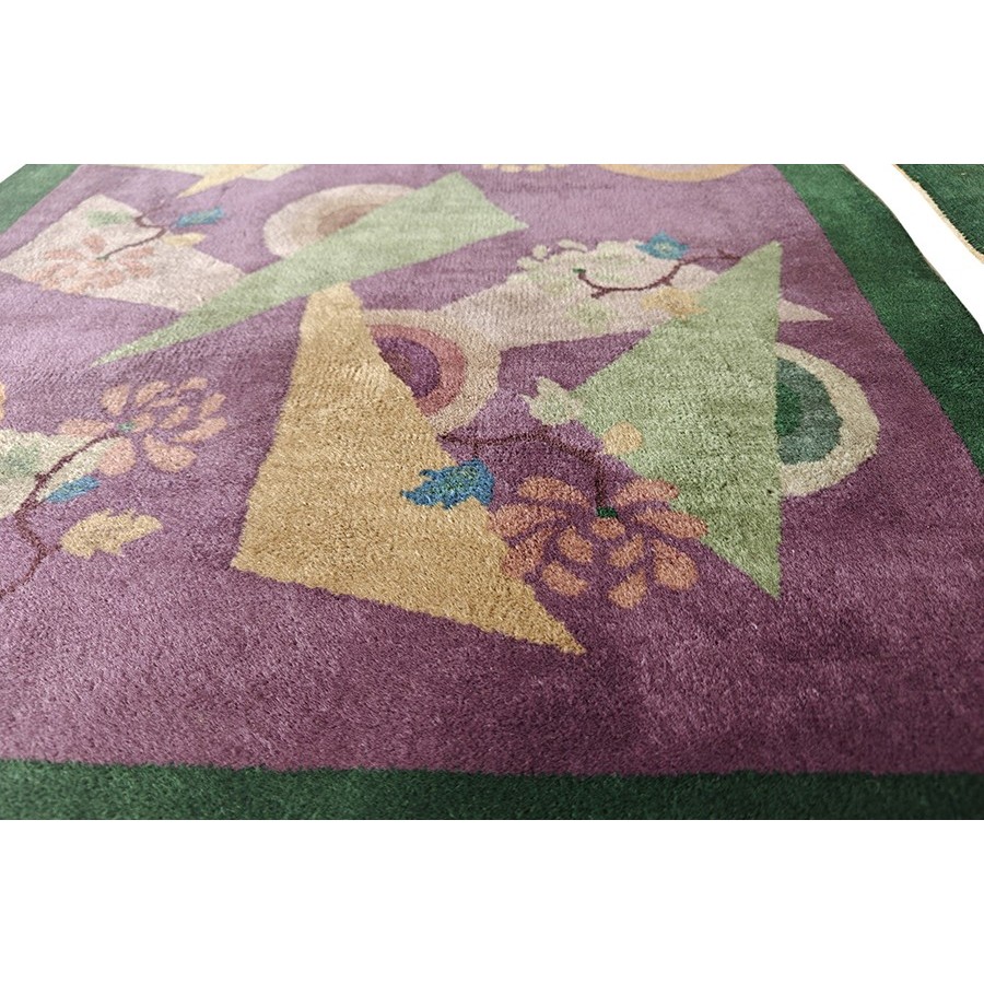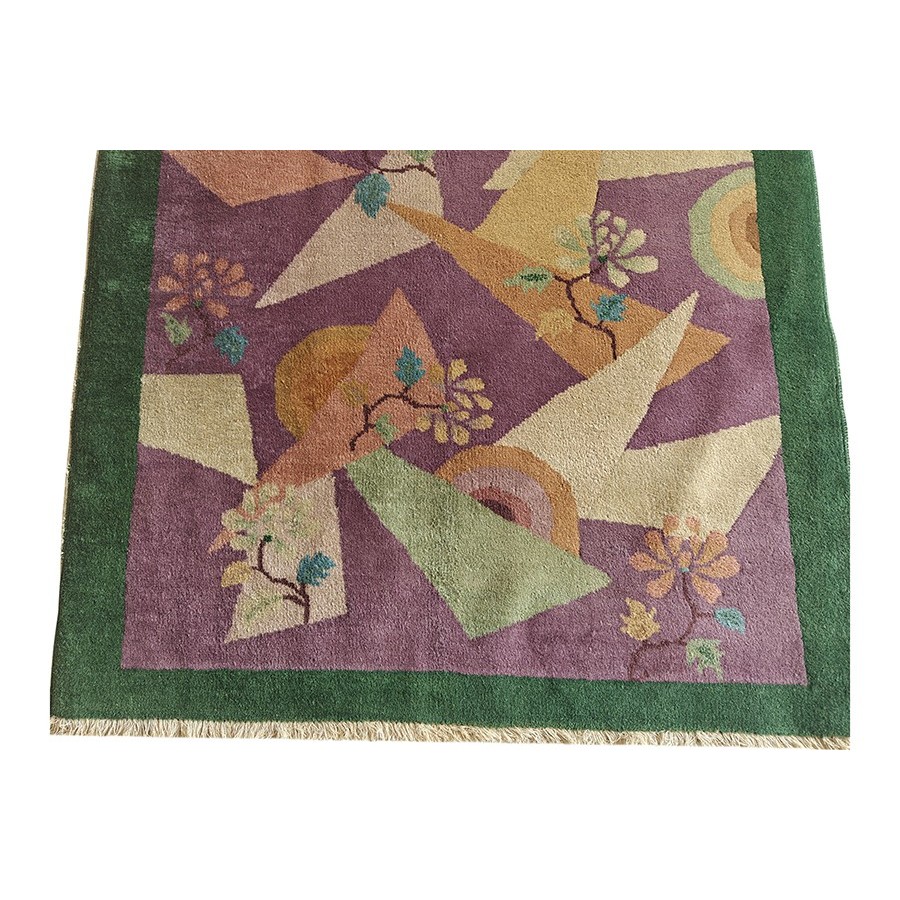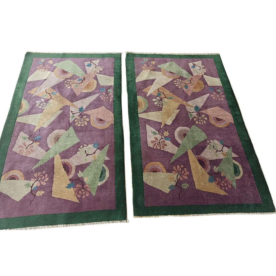 DescriptionChineseCarpets made in China proper. See entries Ningshia, Peking, Art Deco. Chinese - Art DecoAs the name implies, pieces woven between the wars for the Western market by mostly American owned firms especially Nichols and Fette, in thick heavy weaves using strong colors, asymmetric patterns and downplaying the Chinese-ness of the carpet. Nichols rugs are more strong toned than the pastel Fette. Most were woven in the coastal port city of Tientsin. Other lesser known workshops were also active. Some pieces are ultra-geometric and haute-Deco moderne in character: these are very rare. More frequent are pieces with bits of Chinese ornament: vases or other precious objects, paeonies, vines, fences, etc. Most common is the 9 x 12 size, in colors never found in mainstream Chinese rugs: backgrounds in black, mauve, purple, hot pink, orange, olive, employing the best synthetic chrome dyes of the period. Prices are still reasonable and carpets in top condition are available. | |