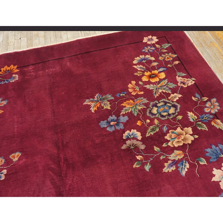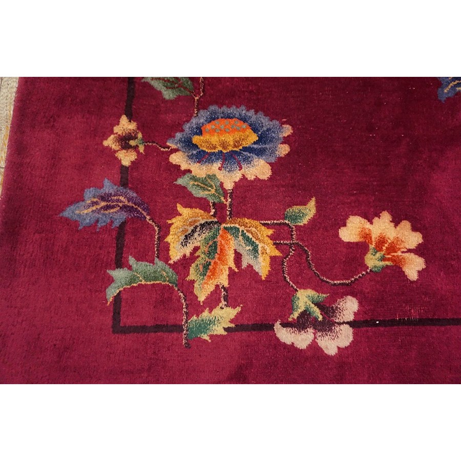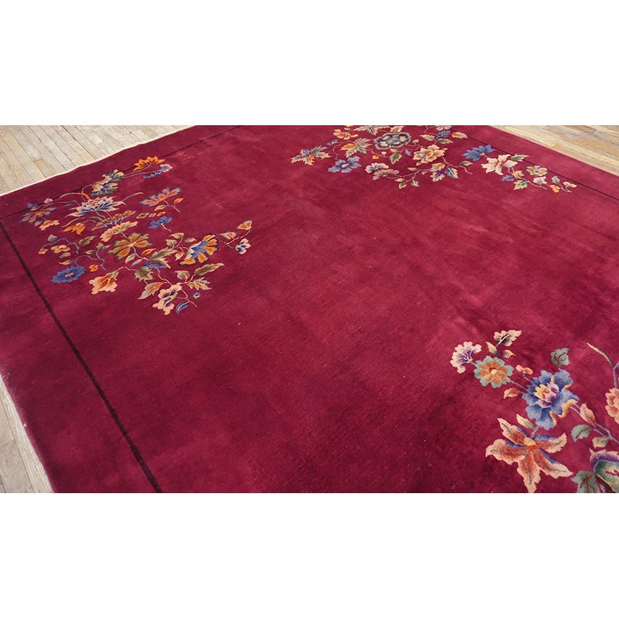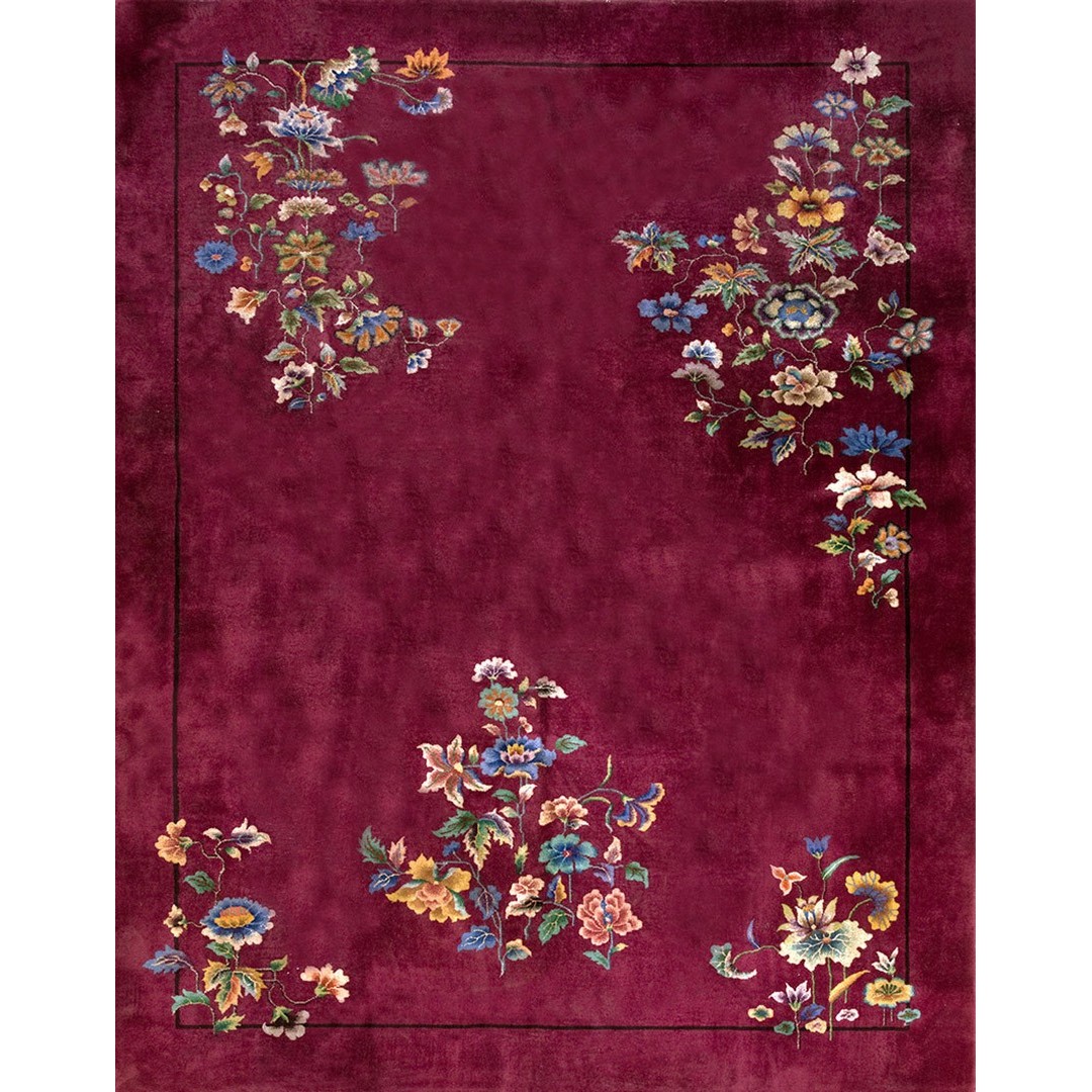 DescriptionChineseCarpets made in China proper. See entries Ningshia, Peking, Art Deco. Chinese - Art DecoAs the name implies, pieces woven between the wars for the Western market by mostly American owned firms especially Nichols and Fette, in thick heavy weaves using strong colors, asymmetric patterns and downplaying the Chinese-ness of the carpet. Nichols rugs are more strong toned than the pastel Fette. Most were woven in the coastal port city of Tientsin. Other lesser known workshops were also active. Some pieces are ultra-geometric and haute-Deco moderne in character: these are very rare. More frequent are pieces with bits of Chinese ornament: vases or other precious objects, paeonies, vines, fences, etc. Most common is the 9 x 12 size, in colors never found in mainstream Chinese rugs: backgrounds in black, mauve, purple, hot pink, orange, olive, employing the best synthetic chrome dyes of the period. Prices are still reasonable and carpets in top condition are available. | |