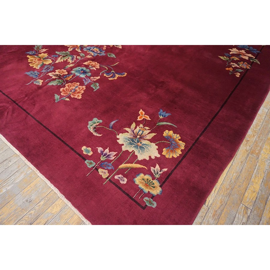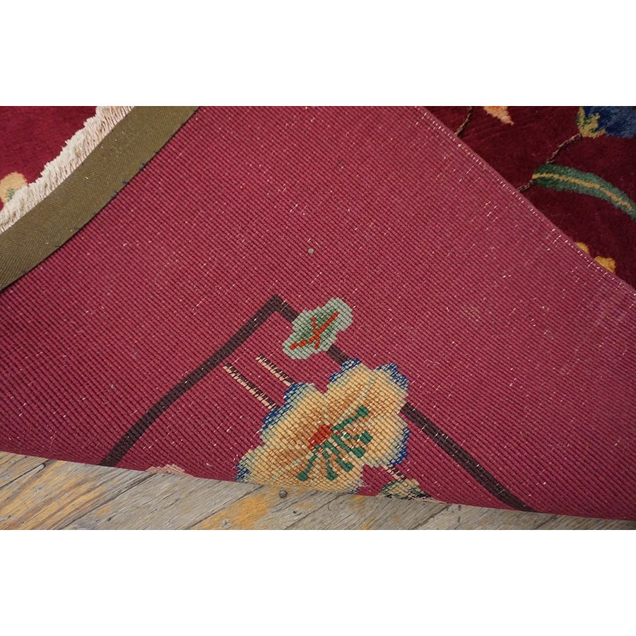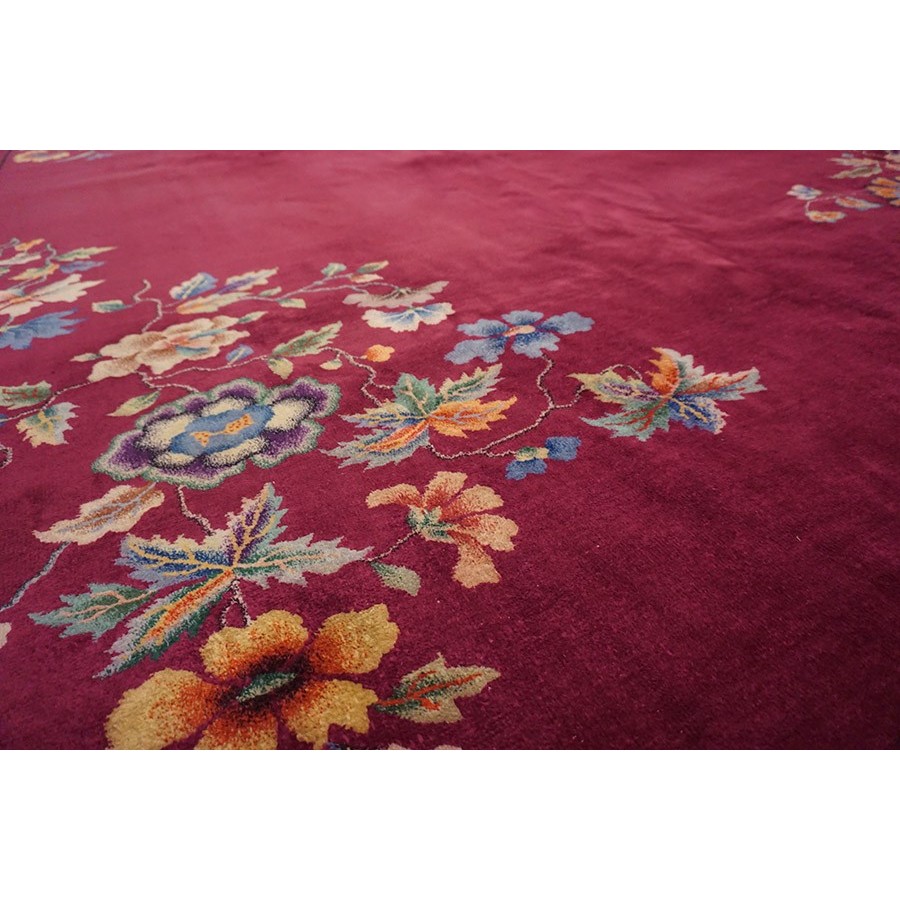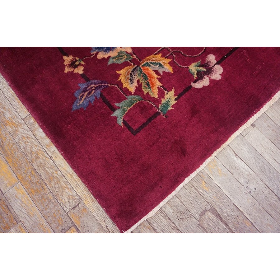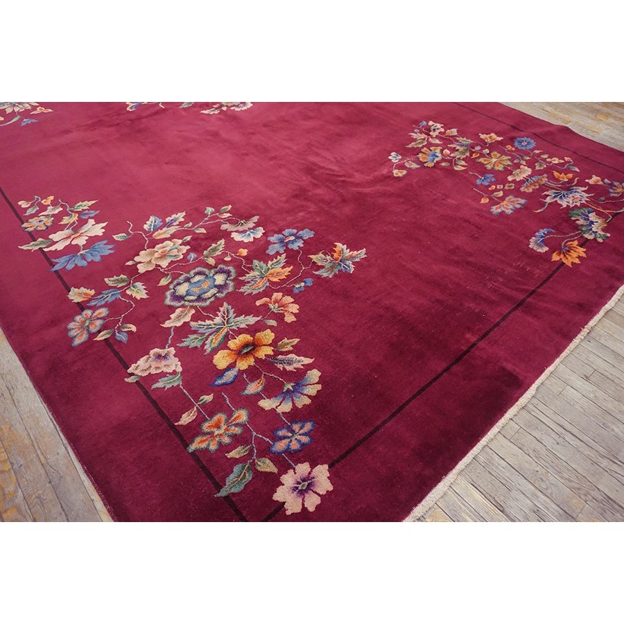 DescriptionChineseCarpets made in China proper. See entries Ningshia, Peking, Art Deco. Chinese - Art DecoAs the name implies, pieces woven between the wars for the Western market by mostly American owned firms especially Nichols and Fette, in thick heavy weaves using strong colors, asymmetric patterns and downplaying the Chinese-ness of the carpet. Nichols rugs are more strong toned than the pastel Fette. Most were woven in the coastal port city of Tientsin. Other lesser known workshops were also active. Some pieces are ultra-geometric and haute-Deco moderne in character: these are very rare. More frequent are pieces with bits of Chinese ornament: vases or other precious objects, paeonies, vines, fences, etc. Most common is the 9 x 12 size, in colors never found in mainstream Chinese rugs: backgrounds in black, mauve, purple, hot pink, orange, olive, employing the best synthetic chrome dyes of the period. Prices are still reasonable and carpets in top condition are available. | |