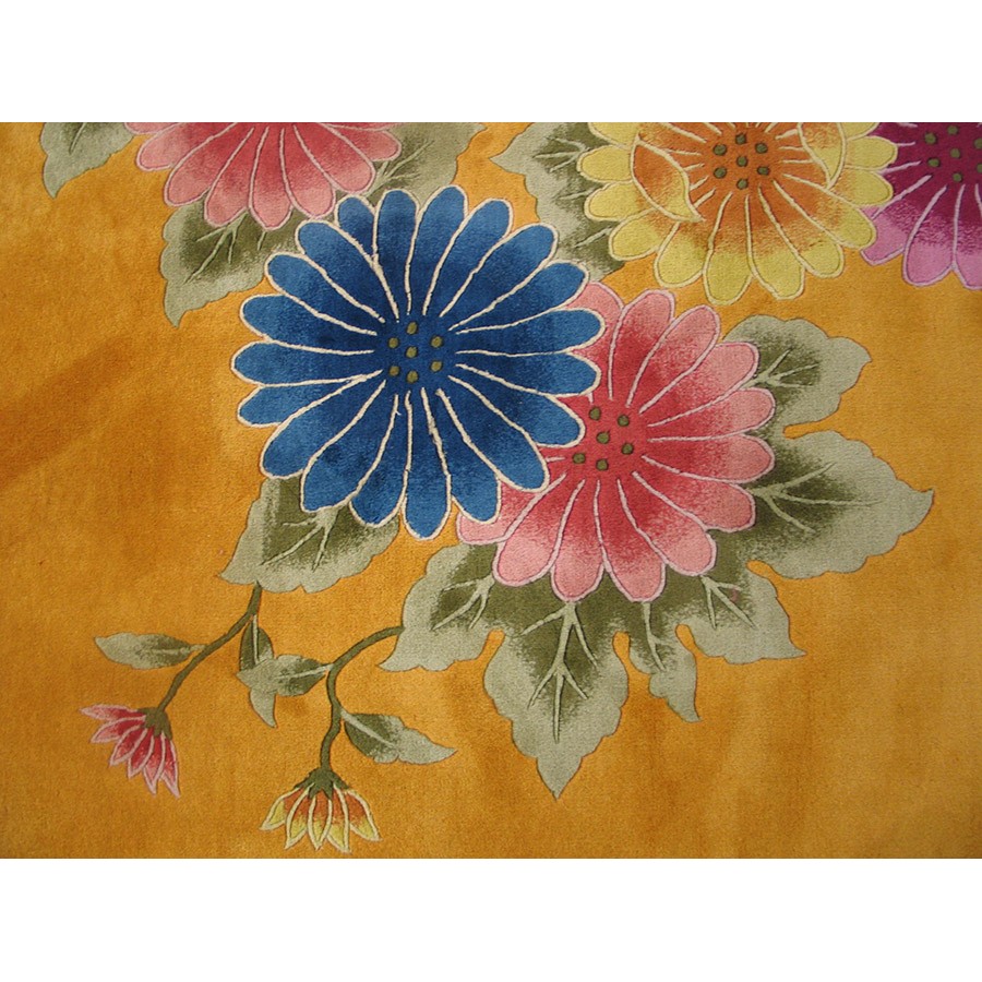 DescriptionChineseCarpets made in China proper. See entries Ningshia, Peking, Art Deco. Chinese - Art DecoAs the name implies, pieces woven between the wars for the Western market by mostly American owned firms especially Nichols and Fette, in thick heavy weaves using strong colors, asymmetric patterns and downplaying the Chinese-ness of the carpet. Nichols rugs are more strong toned than the pastel Fette. Most were woven in the coastal port city of Tientsin. Other lesser known workshops were also active. Some pieces are ultra-geometric and haute-Deco moderne in character: these are very rare. More frequent are pieces with bits of Chinese ornament: vases or other precious objects, paeonies, vines, fences, etc. Most common is the 9 x 12 size, in colors never found in mainstream Chinese rugs: backgrounds in black, mauve, purple, hot pink, orange, olive, employing the best synthetic chrome dyes of the period. Prices are still reasonable and carpets in top condition are available. | |