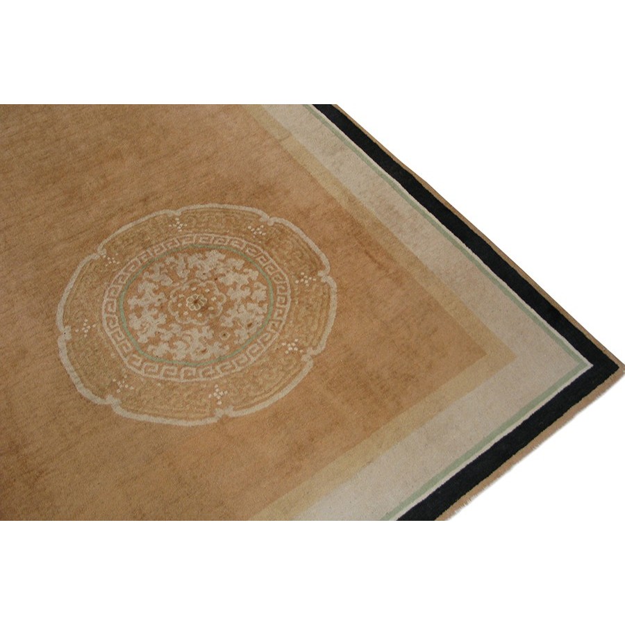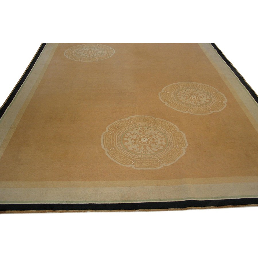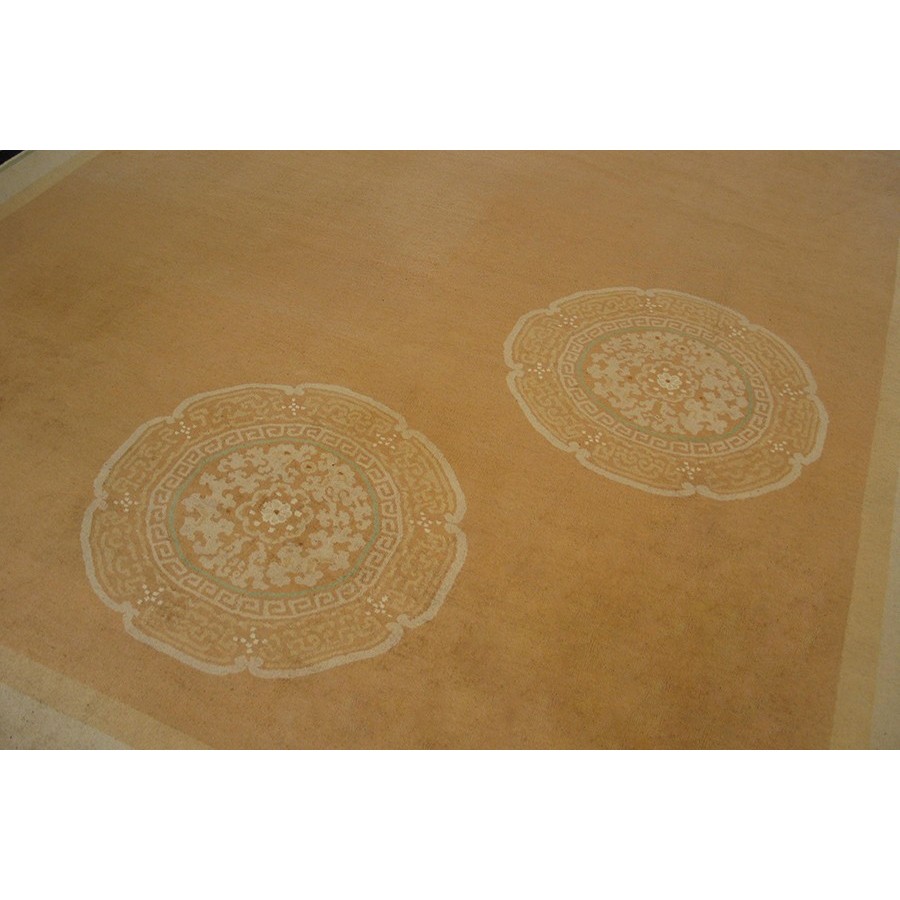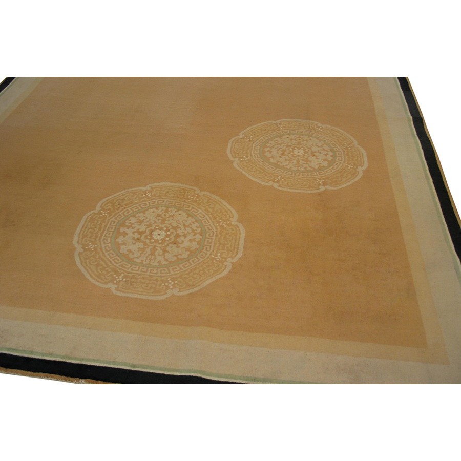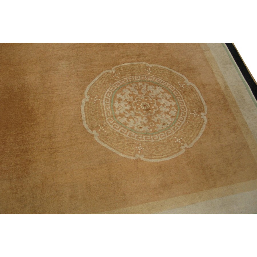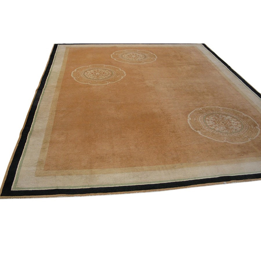 DescriptionChineseCarpets made in China proper. See entries Ningshia, Peking, Art Deco. Chinese - Art DecoAs the name implies, pieces woven between the wars for the Western market by mostly American owned firms especially Nichols and Fette, in thick heavy weaves using strong colors, asymmetric patterns and downplaying the Chinese-ness of the carpet. Nichols rugs are more strong toned than the pastel Fette. Most were woven in the coastal port city of Tientsin. Other lesser known workshops were also active. Some pieces are ultra-geometric and haute-Deco moderne in character: these are very rare. More frequent are pieces with bits of Chinese ornament: vases or other precious objects, paeonies, vines, fences, etc. Most common is the 9 x 12 size, in colors never found in mainstream Chinese rugs: backgrounds in black, mauve, purple, hot pink, orange, olive, employing the best synthetic chrome dyes of the period. Prices are still reasonable and carpets in top condition are available. | |