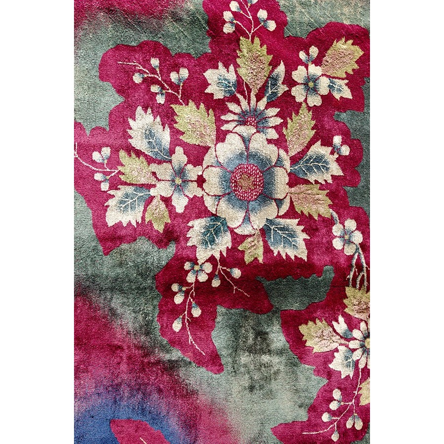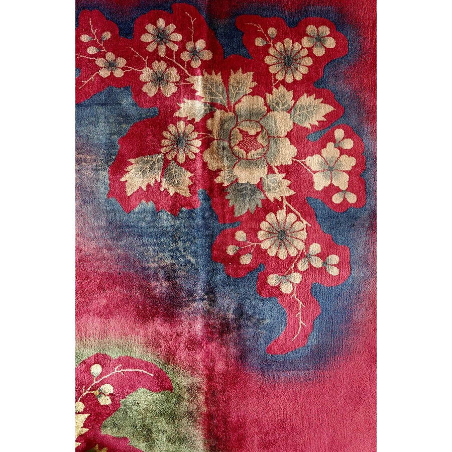 DescriptionChineseCarpets made in China proper. See entries Ningshia, Peking, Art Deco. Chinese - Art DecoAs the name implies, pieces woven between the wars for the Western market by mostly American owned firms especially Nichols and Fette, in thick heavy weaves using strong colors, asymmetric patterns and downplaying the Chinese-ness of the carpet. Nichols rugs are more strong toned than the pastel Fette. Most were woven in the coastal port city of Tientsin. Other lesser known workshops were also active. Some pieces are ultra-geometric and haute-Deco moderne in character: these are very rare. More frequent are pieces with bits of Chinese ornament: vases or other precious objects, paeonies, vines, fences, etc. Most common is the 9 x 12 size, in colors never found in mainstream Chinese rugs: backgrounds in black, mauve, purple, hot pink, orange, olive, employing the best synthetic chrome dyes of the period. Prices are still reasonable and carpets in top condition are available. | |