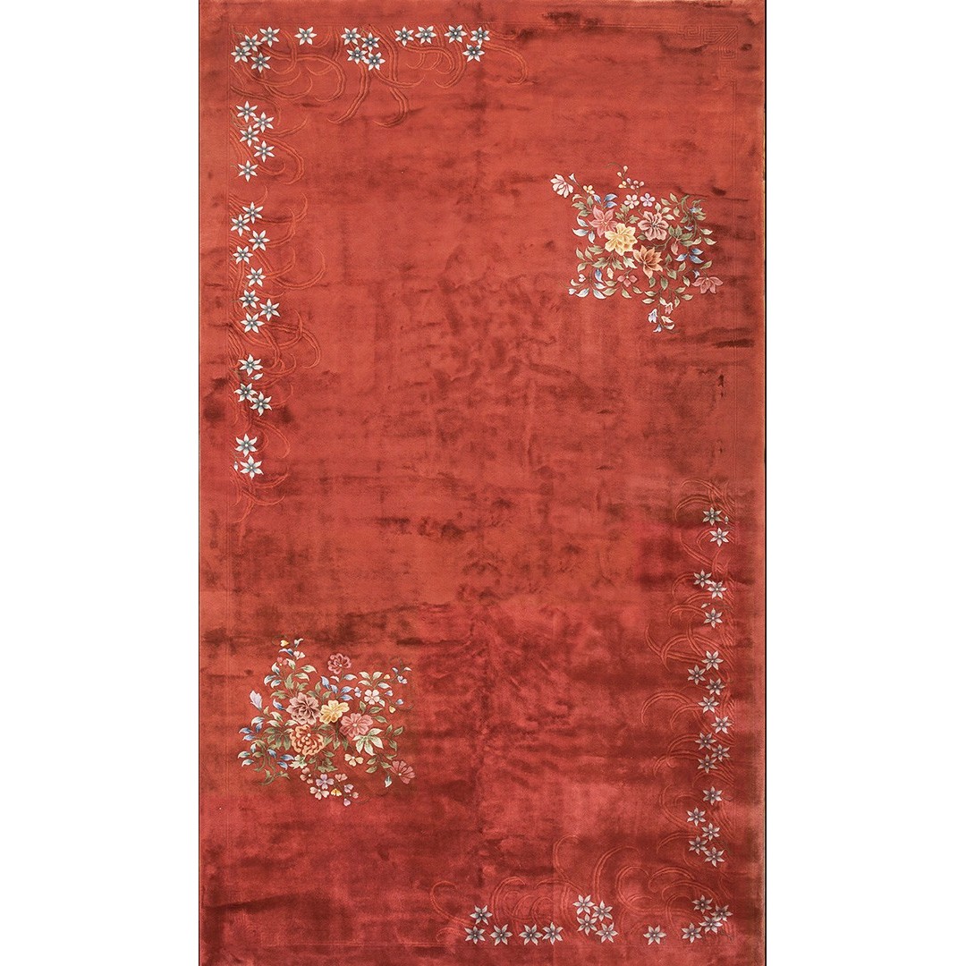 DescriptionChineseCarpets made in China proper. See entries Ningshia, Peking, Art Deco. Chinese - Art DecoAs the name implies, pieces woven between the wars for the Western market by mostly American owned firms especially Nichols and Fette, in thick heavy weaves using strong colors, asymmetric patterns and downplaying the Chinese-ness of the carpet. Nichols rugs are more strong toned than the pastel Fette. Most were woven in the coastal port city of Tientsin. Other lesser known workshops were also active. Some pieces are ultra-geometric and haute-Deco moderne in character: these are very rare. More frequent are pieces with bits of Chinese ornament: vases or other precious objects, paeonies, vines, fences, etc. Most common is the 9 x 12 size, in colors never found in mainstream Chinese rugs: backgrounds in black, mauve, purple, hot pink, orange, olive, employing the best synthetic chrome dyes of the period. Prices are still reasonable and carpets in top condition are available. | |