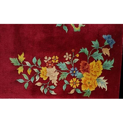 DescriptionChineseCarpets made in China proper. See entries Ningshia, Peking, Art Deco. Chinese - Art DecoAs the name implies, pieces woven between the wars for the Western market by mostly American owned firms especially Nichols and Fette, in thick heavy weaves using strong colors, asymmetric patterns and downplaying the Chinese-ness of the carpet. Nichols rugs are more strong toned than the pastel Fette. Most were woven in the coastal port city of Tientsin. Other lesser known workshops were also active. Some pieces are ultra-geometric and haute-Deco moderne in character: these are very rare. More frequent are pieces with bits of Chinese ornament: vases or other precious objects, paeonies, vines, fences, etc. Most common is the 9 x 12 size, in colors never found in mainstream Chinese rugs: backgrounds in black, mauve, purple, hot pink, orange, olive, employing the best synthetic chrome dyes of the period. Prices are still reasonable and carpets in top condition are available. | |
