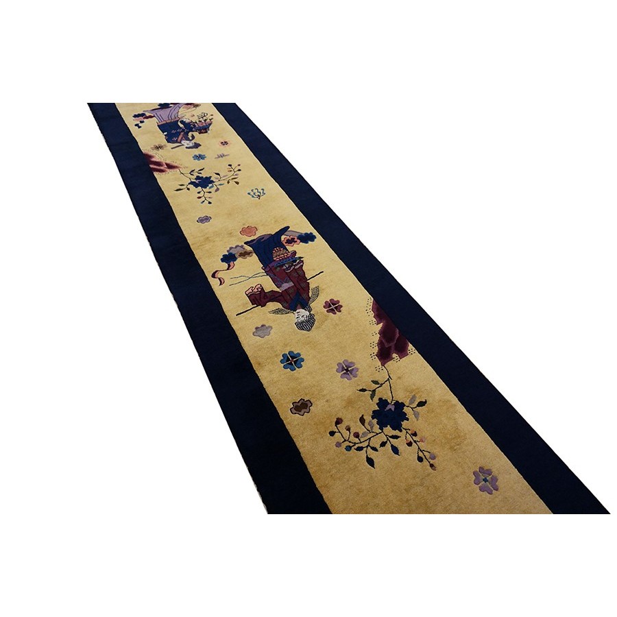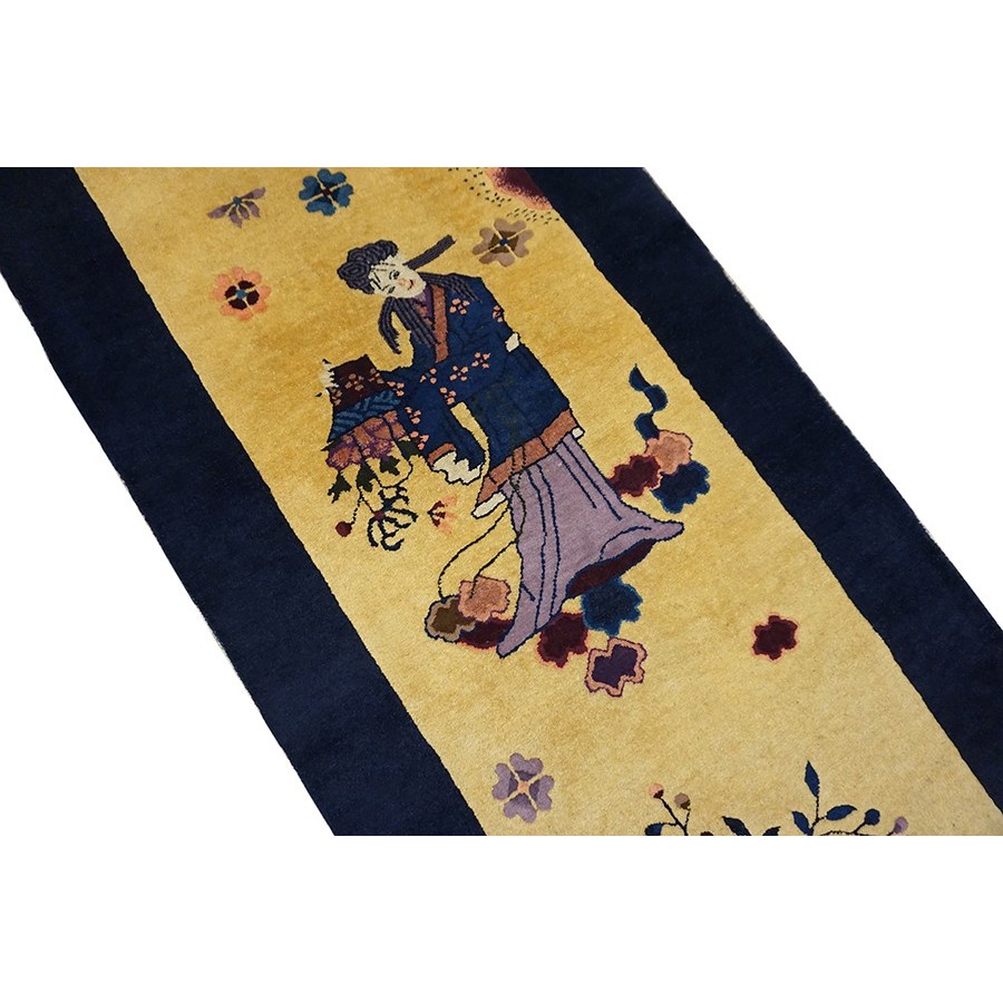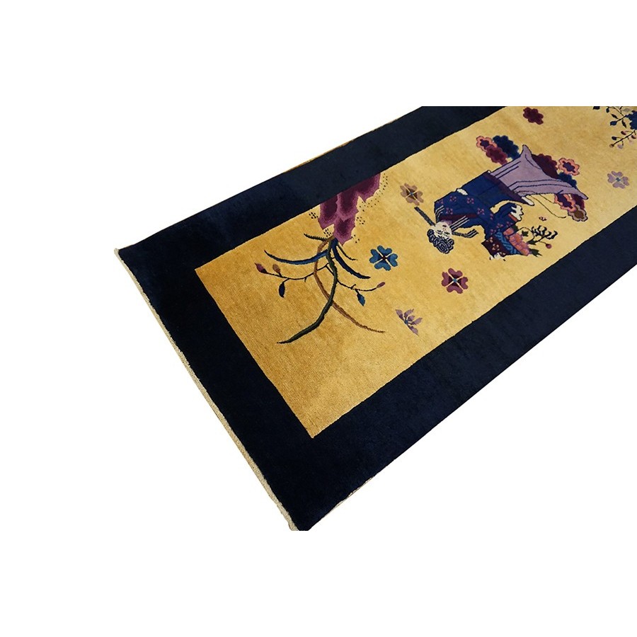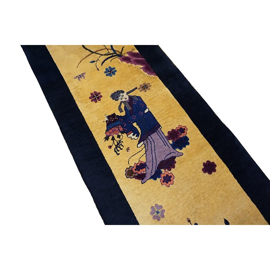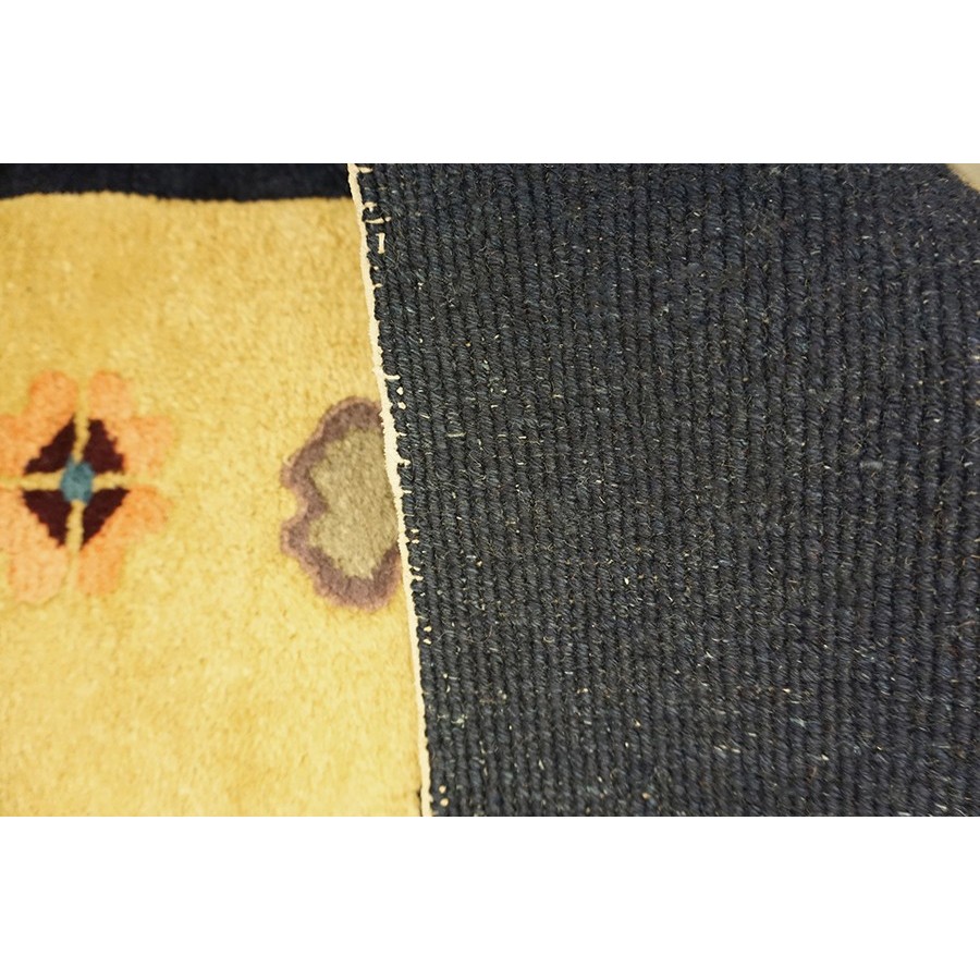 DescriptionChineseCarpets made in China proper. See entries Ningshia, Peking, Art Deco. Chinese - Art DecoAs the name implies, pieces woven between the wars for the Western market by mostly American owned firms especially Nichols and Fette, in thick heavy weaves using strong colors, asymmetric patterns and downplaying the Chinese-ness of the carpet. Nichols rugs are more strong toned than the pastel Fette. Most were woven in the coastal port city of Tientsin. Other lesser known workshops were also active. Some pieces are ultra-geometric and haute-Deco moderne in character: these are very rare. More frequent are pieces with bits of Chinese ornament: vases or other precious objects, paeonies, vines, fences, etc. Most common is the 9 x 12 size, in colors never found in mainstream Chinese rugs: backgrounds in black, mauve, purple, hot pink, orange, olive, employing the best synthetic chrome dyes of the period. Prices are still reasonable and carpets in top condition are available. | |