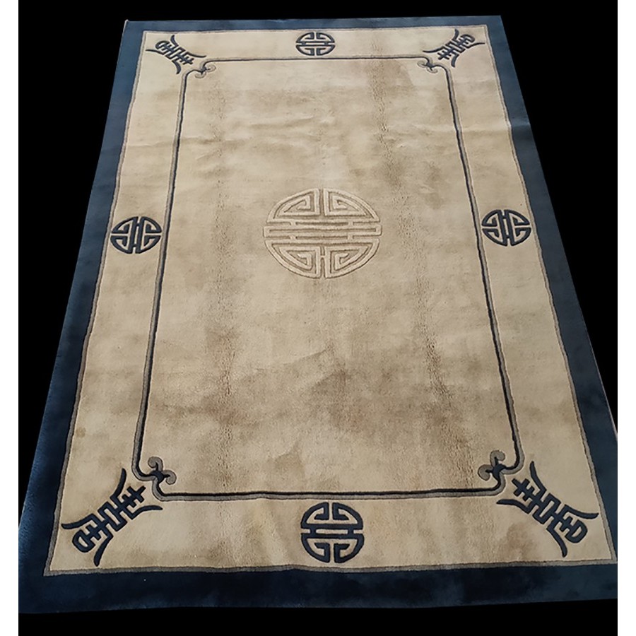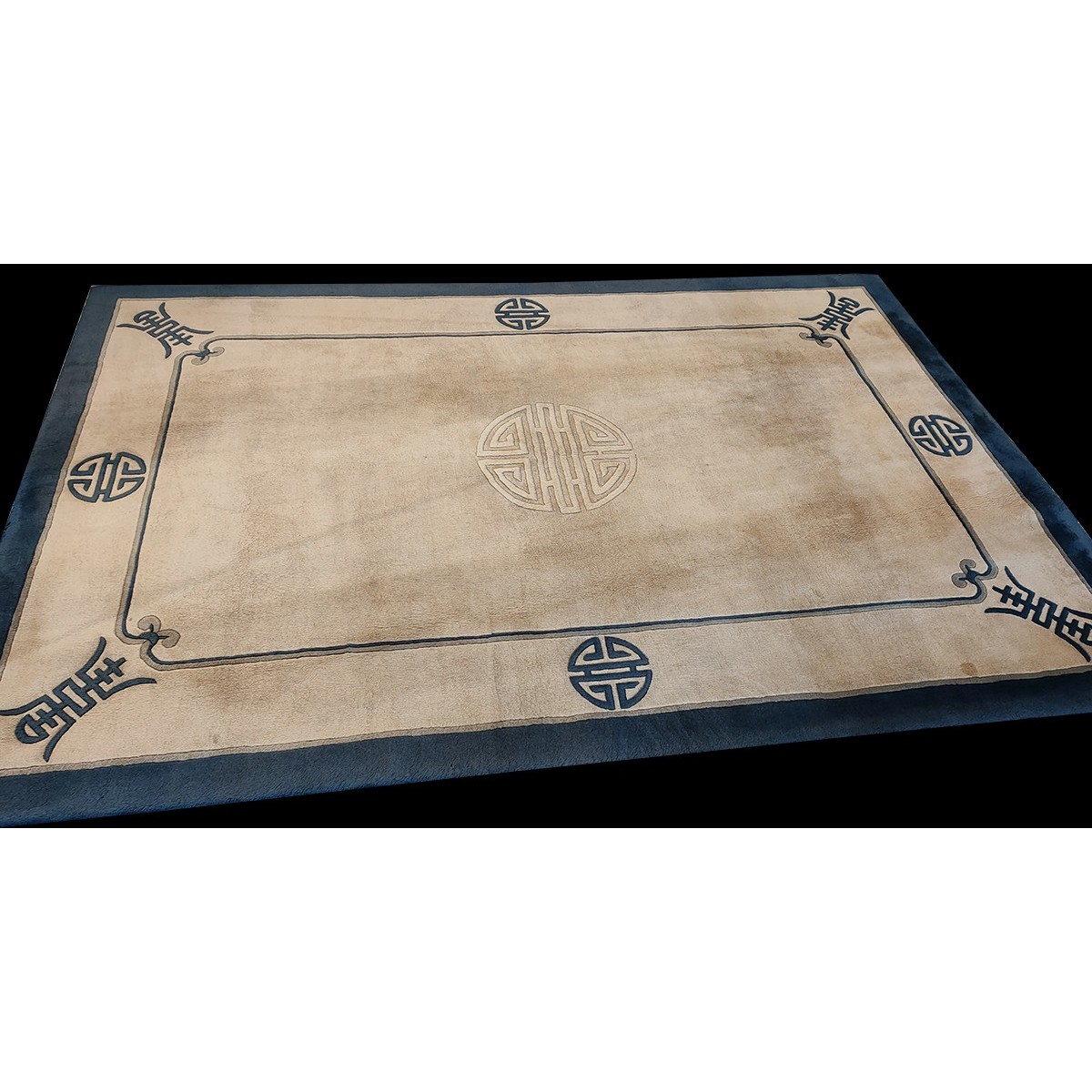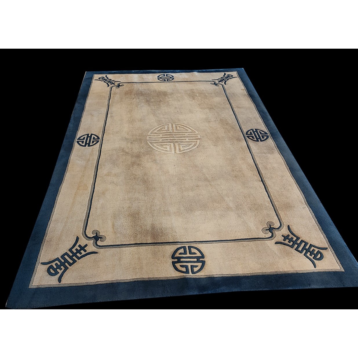 DescriptionChineseCarpets made in China proper. See entries Ningshia, Peking, Art Deco. Chinese - Art DecoAs the name implies, pieces woven between the wars for the Western market by mostly American owned firms especially Nichols and Fette, in thick heavy weaves using strong colors, asymmetric patterns and downplaying the Chinese-ness of the carpet. Nichols rugs are more strong toned than the pastel Fette. Most were woven in the coastal port city of Tientsin. Other lesser known workshops were also active. Some pieces are ultra-geometric and haute-Deco moderne in character: these are very rare. More frequent are pieces with bits of Chinese ornament: vases or other precious objects, paeonies, vines, fences, etc. Most common is the 9 x 12 size, in colors never found in mainstream Chinese rugs: backgrounds in black, mauve, purple, hot pink, orange, olive, employing the best synthetic chrome dyes of the period. Prices are still reasonable and carpets in top condition are available. | |