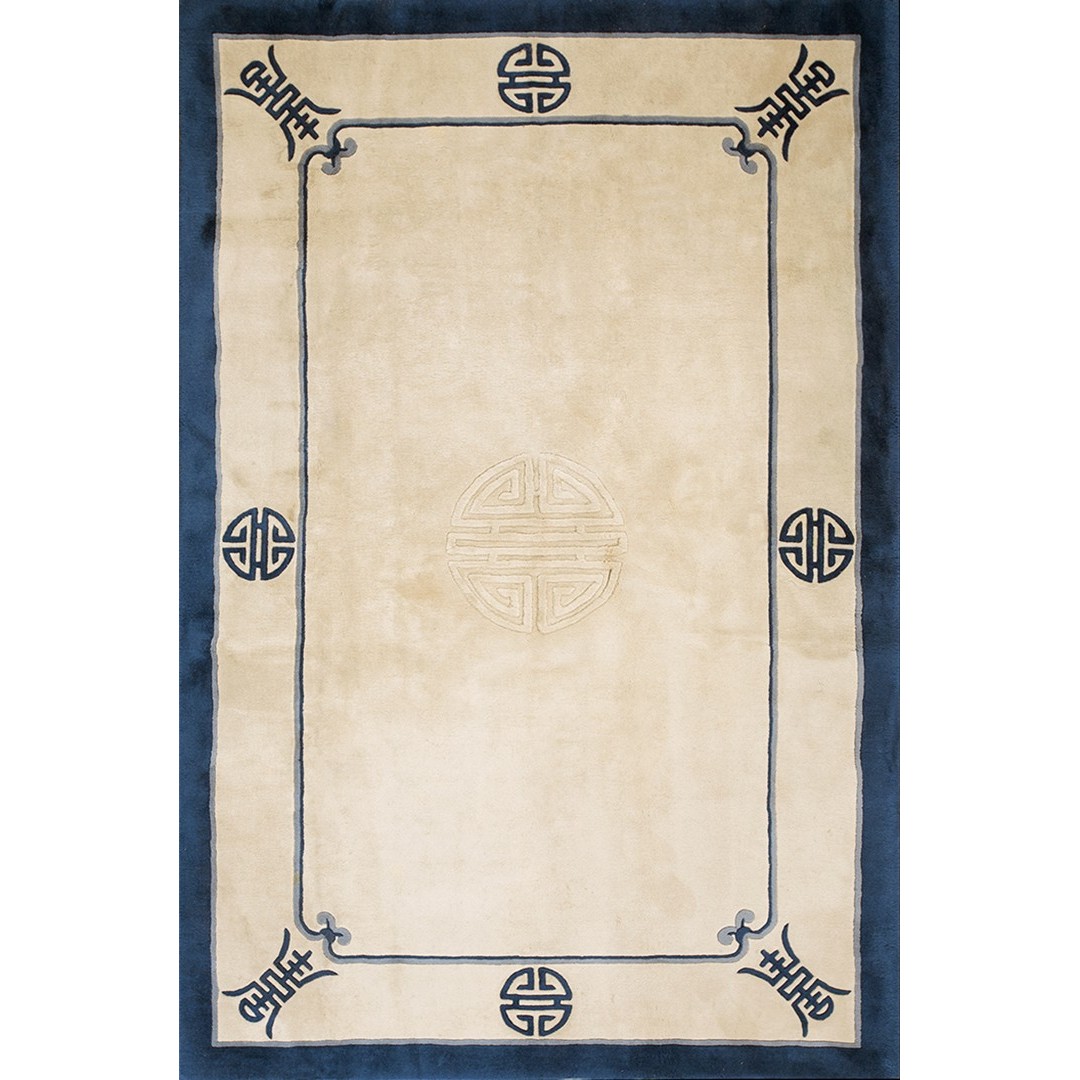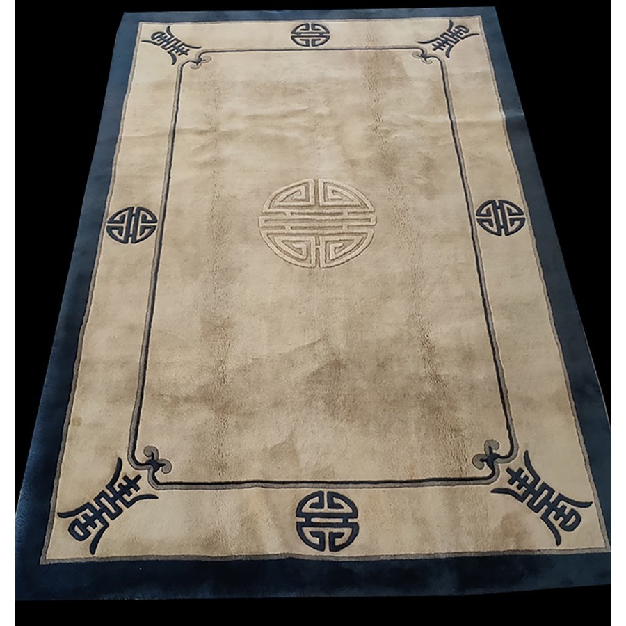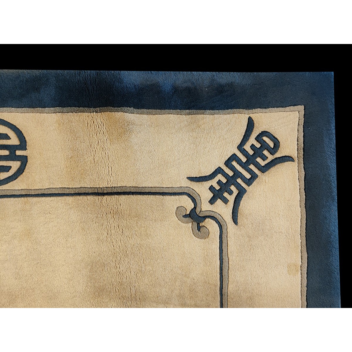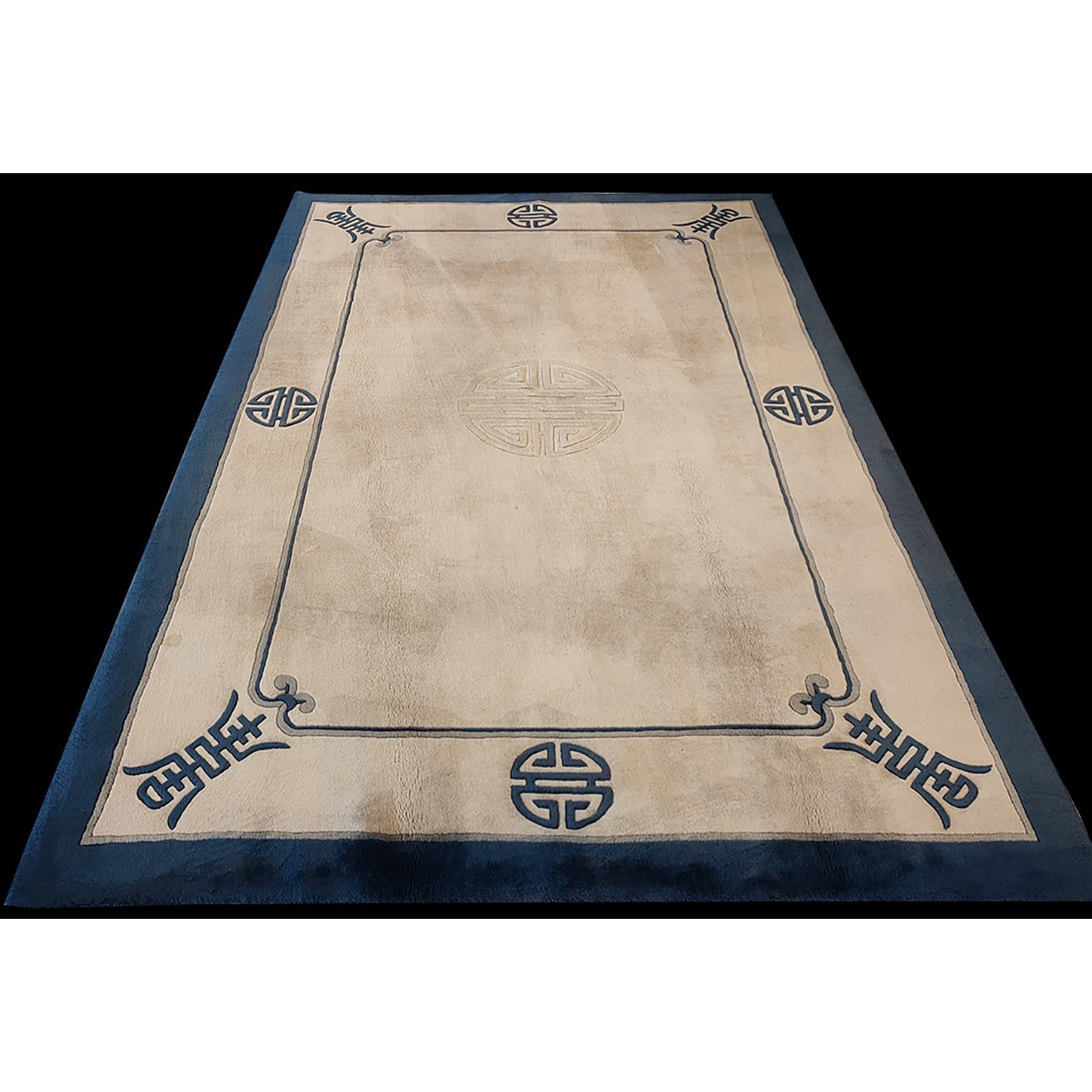 DescriptionChineseCarpets made in China proper. See entries Ningshia, Peking, Art Deco. Chinese - Art DecoAs the name implies, pieces woven between the wars for the Western market by mostly American owned firms especially Nichols and Fette, in thick heavy weaves using strong colors, asymmetric patterns and downplaying the Chinese-ness of the carpet. Nichols rugs are more strong toned than the pastel Fette. Most were woven in the coastal port city of Tientsin. Other lesser known workshops were also active. Some pieces are ultra-geometric and haute-Deco moderne in character: these are very rare. More frequent are pieces with bits of Chinese ornament: vases or other precious objects, paeonies, vines, fences, etc. Most common is the 9 x 12 size, in colors never found in mainstream Chinese rugs: backgrounds in black, mauve, purple, hot pink, orange, olive, employing the best synthetic chrome dyes of the period. Prices are still reasonable and carpets in top condition are available. | |