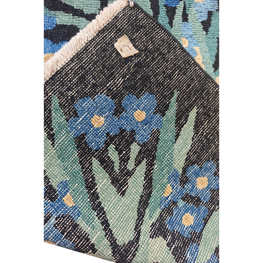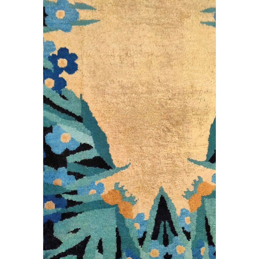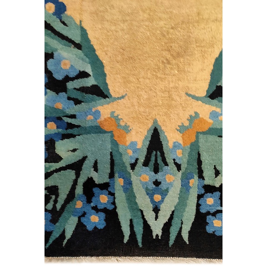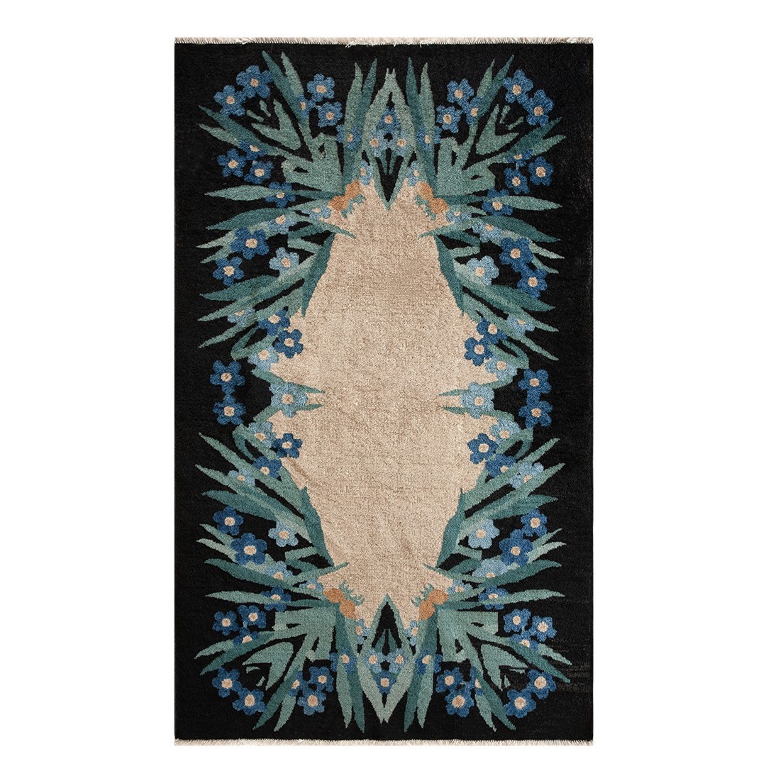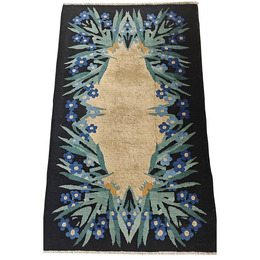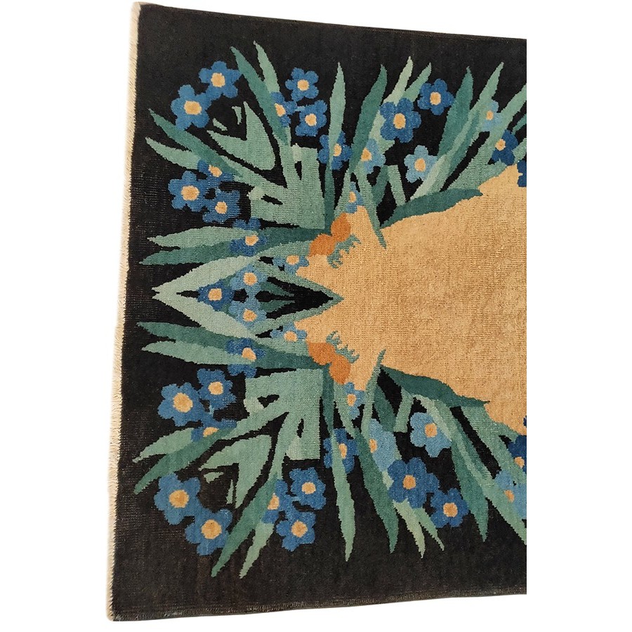 DescriptionChineseCarpets made in China proper. See entries Ningshia, Peking, Art Deco. Chinese - Art DecoAs the name implies, pieces woven between the wars for the Western market by mostly American owned firms especially Nichols and Fette, in thick heavy weaves using strong colors, asymmetric patterns and downplaying the Chinese-ness of the carpet. Nichols rugs are more strong toned than the pastel Fette. Most were woven in the coastal port city of Tientsin. Other lesser known workshops were also active. Some pieces are ultra-geometric and haute-Deco moderne in character: these are very rare. More frequent are pieces with bits of Chinese ornament: vases or other precious objects, paeonies, vines, fences, etc. Most common is the 9 x 12 size, in colors never found in mainstream Chinese rugs: backgrounds in black, mauve, purple, hot pink, orange, olive, employing the best synthetic chrome dyes of the period. Prices are still reasonable and carpets in top condition are available. | |