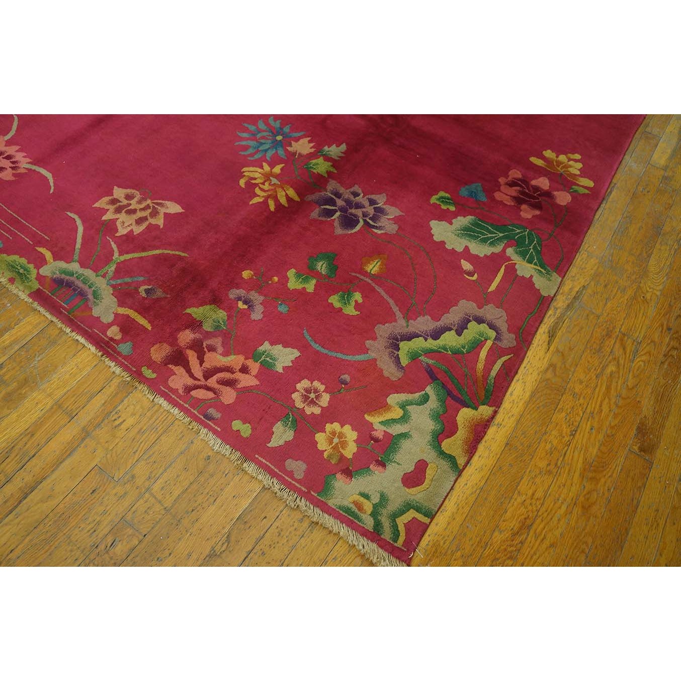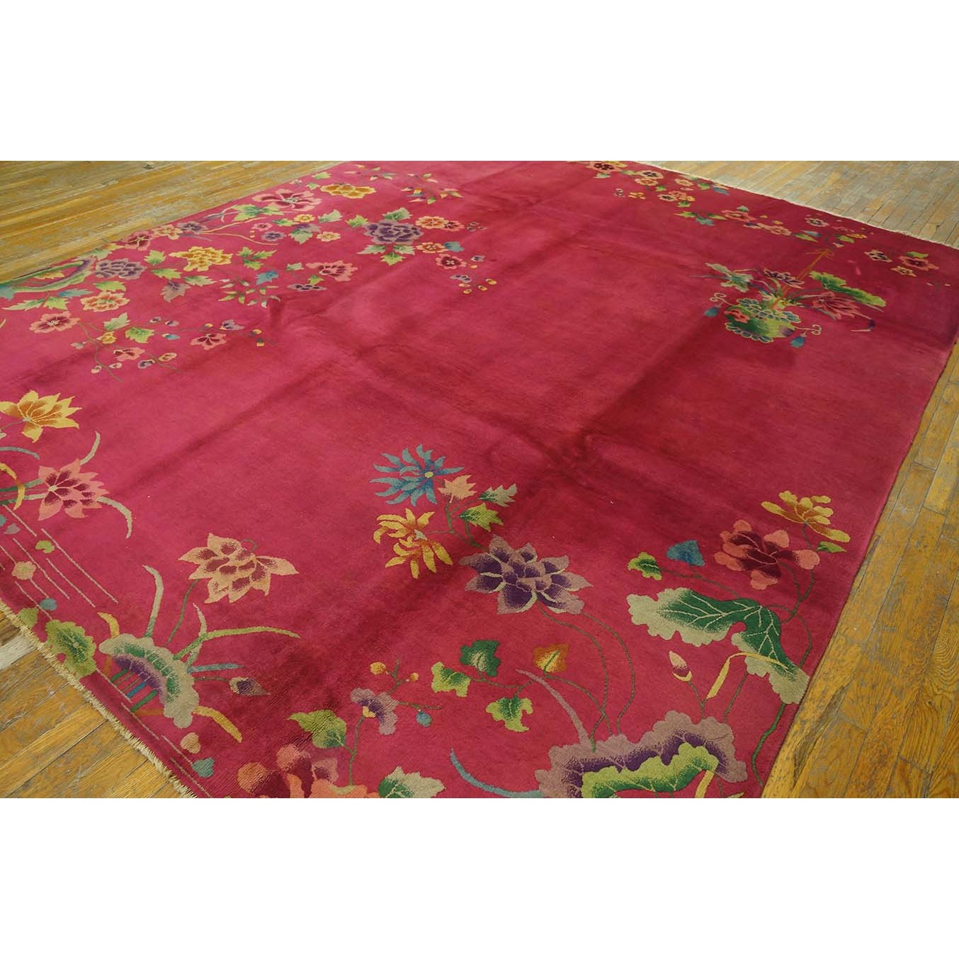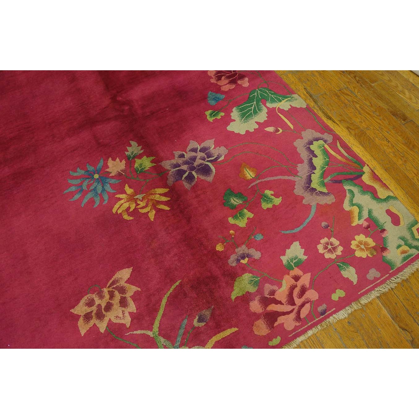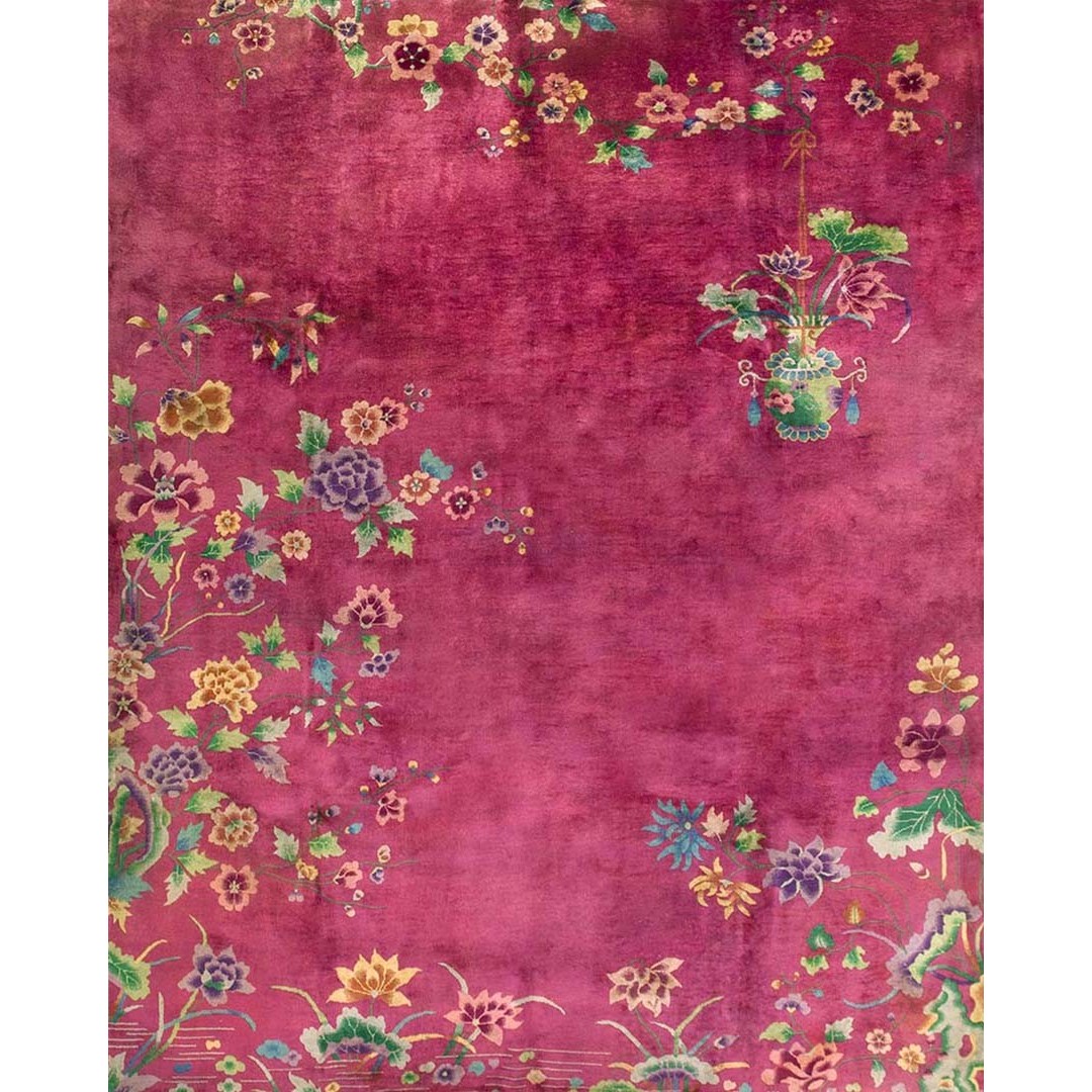 DescriptionChineseCarpets made in China proper. See entries Ningshia, Peking, Art Deco. Chinese - Art DecoAs the name implies, pieces woven between the wars for the Western market by mostly American owned firms especially Nichols and Fette, in thick heavy weaves using strong colors, asymmetric patterns and downplaying the Chinese-ness of the carpet. Nichols rugs are more strong toned than the pastel Fette. Most were woven in the coastal port city of Tientsin. Other lesser known workshops were also active. Some pieces are ultra-geometric and haute-Deco moderne in character: these are very rare. More frequent are pieces with bits of Chinese ornament: vases or other precious objects, paeonies, vines, fences, etc. Most common is the 9 x 12 size, in colors never found in mainstream Chinese rugs: backgrounds in black, mauve, purple, hot pink, orange, olive, employing the best synthetic chrome dyes of the period. Prices are still reasonable and carpets in top condition are available. | |