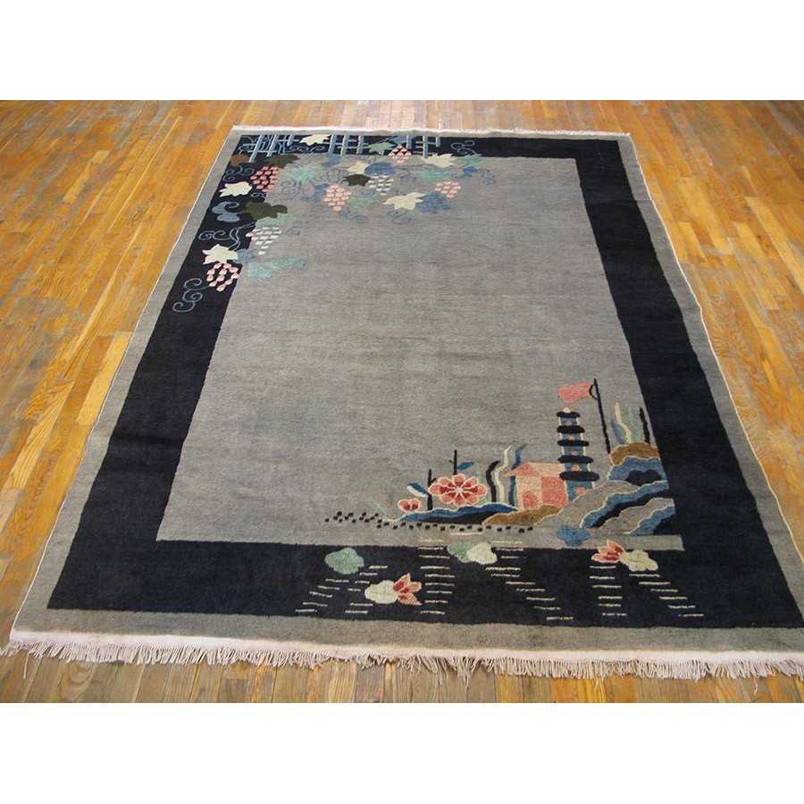 DescriptionChineseCarpets made in China proper. See entries Ningshia, Peking, Art Deco. Chinese - Art DecoAs the name implies, pieces woven between the wars for the Western market by mostly American owned firms especially Nichols and Fette, in thick heavy weaves using strong colors, asymmetric patterns and downplaying the Chinese-ness of the carpet. Nichols rugs are more strong toned than the pastel Fette. Most were woven in the coastal port city of Tientsin. Other lesser known workshops were also active. Some pieces are ultra-geometric and haute-Deco moderne in character: these are very rare. More frequent are pieces with bits of Chinese ornament: vases or other precious objects, paeonies, vines, fences, etc. Most common is the 9 x 12 size, in colors never found in mainstream Chinese rugs: backgrounds in black, mauve, purple, hot pink, orange, olive, employing the best synthetic chrome dyes of the period. Prices are still reasonable and carpets in top condition are available. | |