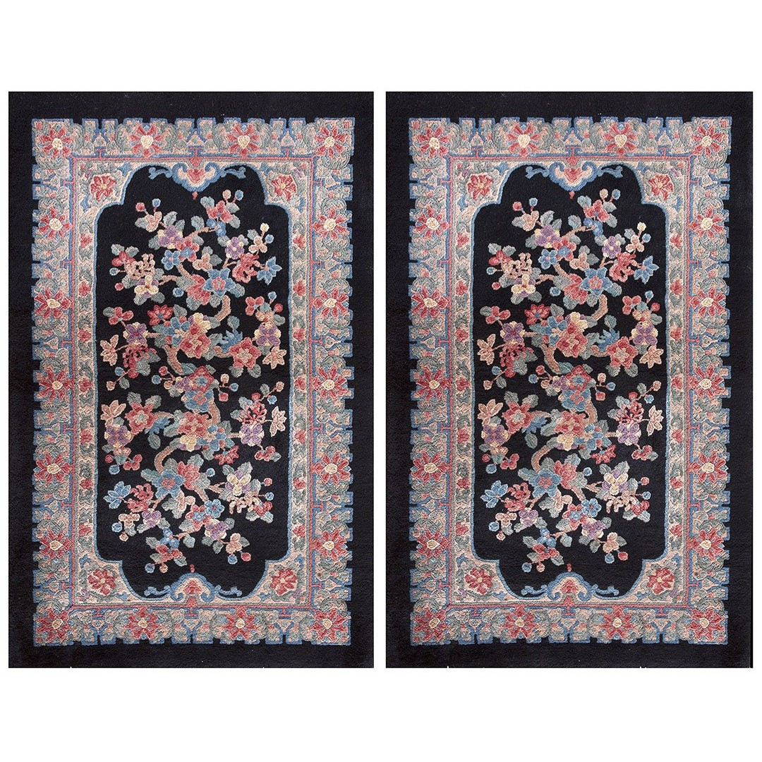 DescriptionChineseCarpets made in China proper. See entries Ningshia, Peking, Art Deco. Chinese - Art DecoAs the name implies, pieces woven between the wars for the Western market by mostly American owned firms especially Nichols and Fette, in thick heavy weaves using strong colors, asymmetric patterns and downplaying the Chinese-ness of the carpet. Nichols rugs are more strong toned than the pastel Fette. Most were woven in the coastal port city of Tientsin. Other lesser known workshops were also active. Some pieces are ultra-geometric and haute-Deco moderne in character: these are very rare. More frequent are pieces with bits of Chinese ornament: vases or other precious objects, paeonies, vines, fences, etc. Most common is the 9 x 12 size, in colors never found in mainstream Chinese rugs: backgrounds in black, mauve, purple, hot pink, orange, olive, employing the best synthetic chrome dyes of the period. Prices are still reasonable and carpets in top condition are available. | |