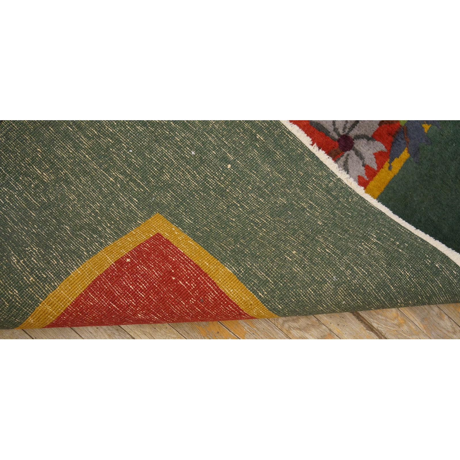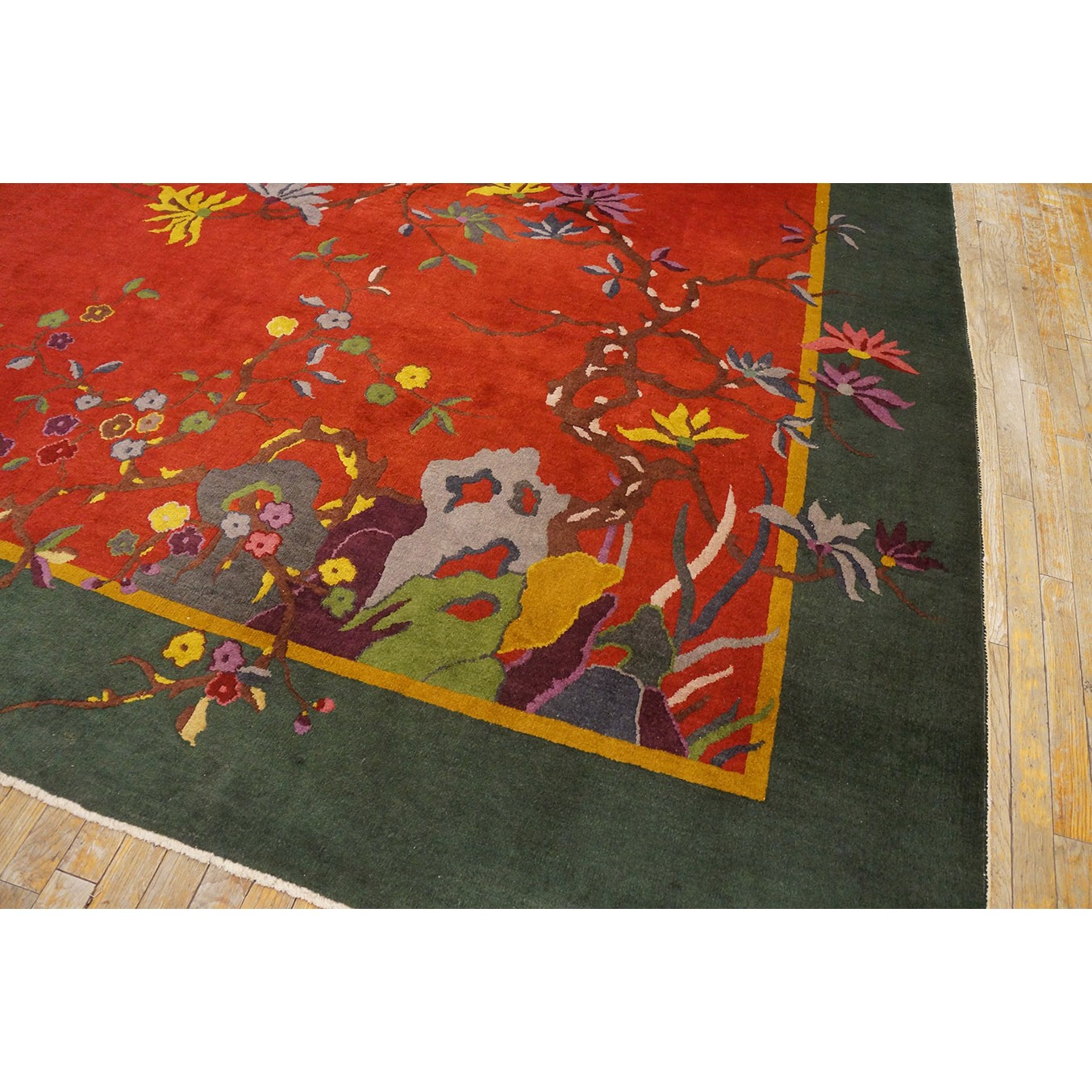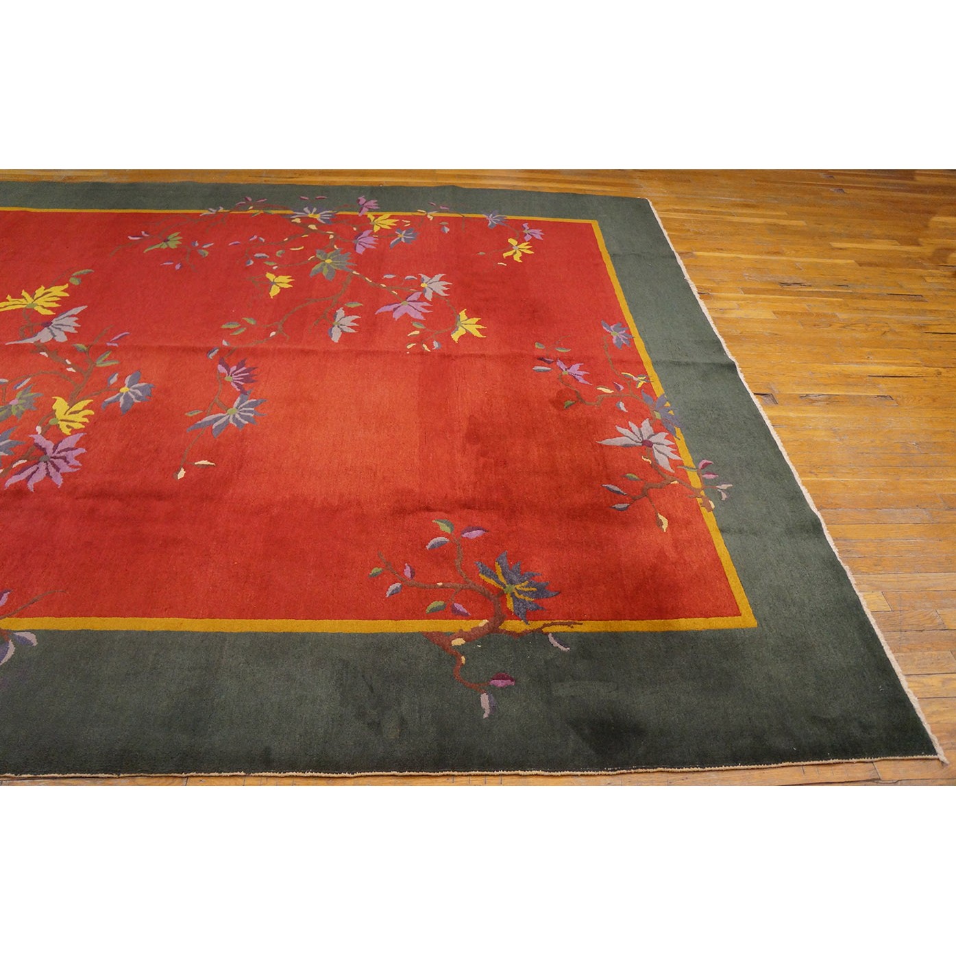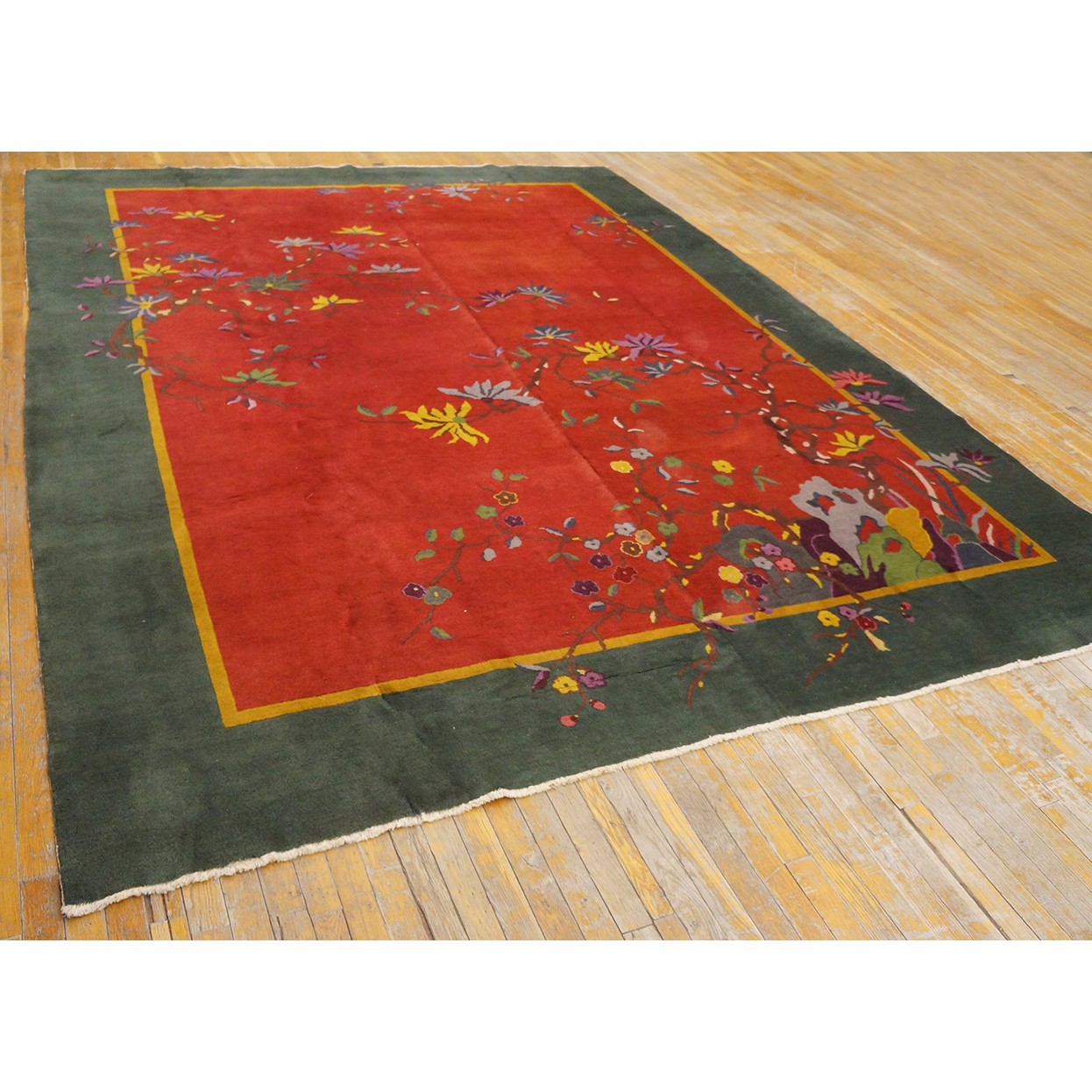 DescriptionChineseCarpets made in China proper. See entries Ningshia, Peking, Art Deco. Chinese - Art DecoAs the name implies, pieces woven between the wars for the Western market by mostly American owned firms especially Nichols and Fette, in thick heavy weaves using strong colors, asymmetric patterns and downplaying the Chinese-ness of the carpet. Nichols rugs are more strong toned than the pastel Fette. Most were woven in the coastal port city of Tientsin. Other lesser known workshops were also active. Some pieces are ultra-geometric and haute-Deco moderne in character: these are very rare. More frequent are pieces with bits of Chinese ornament: vases or other precious objects, paeonies, vines, fences, etc. Most common is the 9 x 12 size, in colors never found in mainstream Chinese rugs: backgrounds in black, mauve, purple, hot pink, orange, olive, employing the best synthetic chrome dyes of the period. Prices are still reasonable and carpets in top condition are available. | |