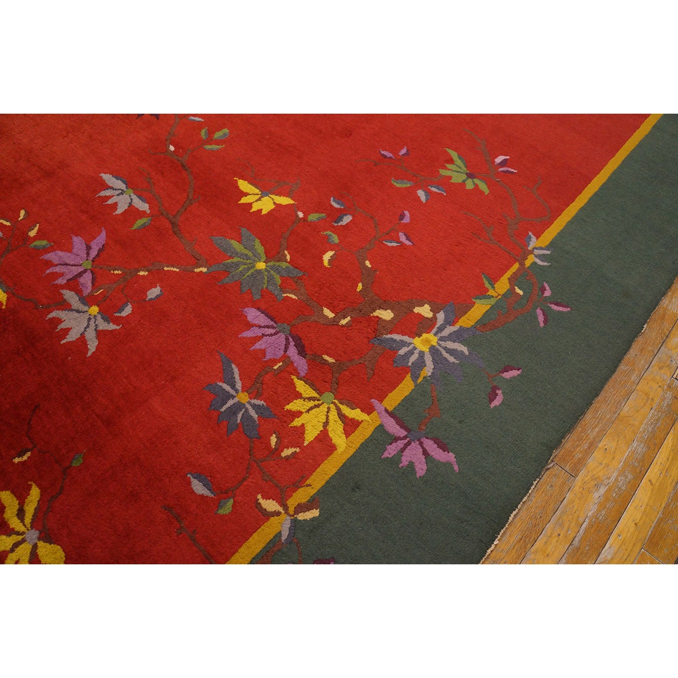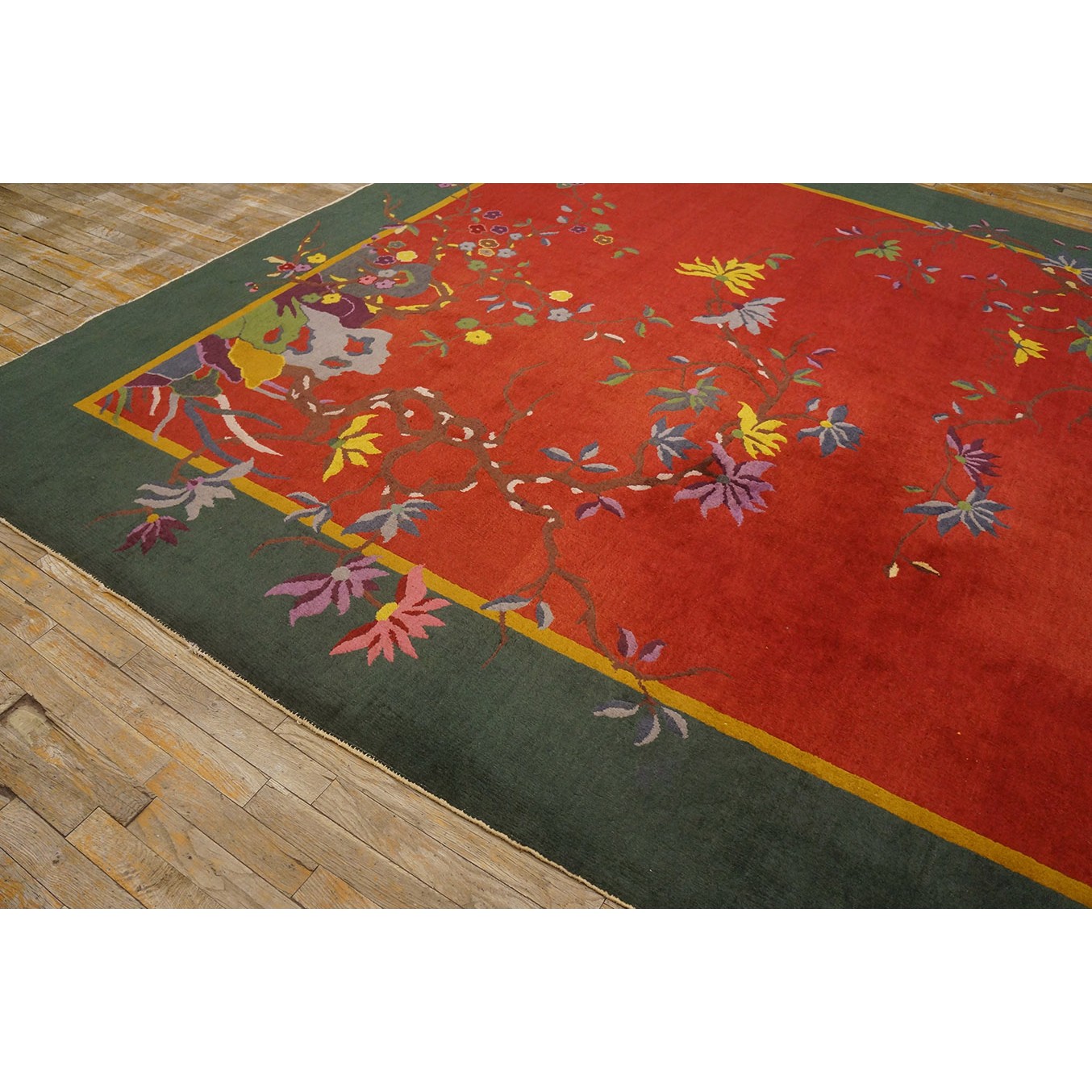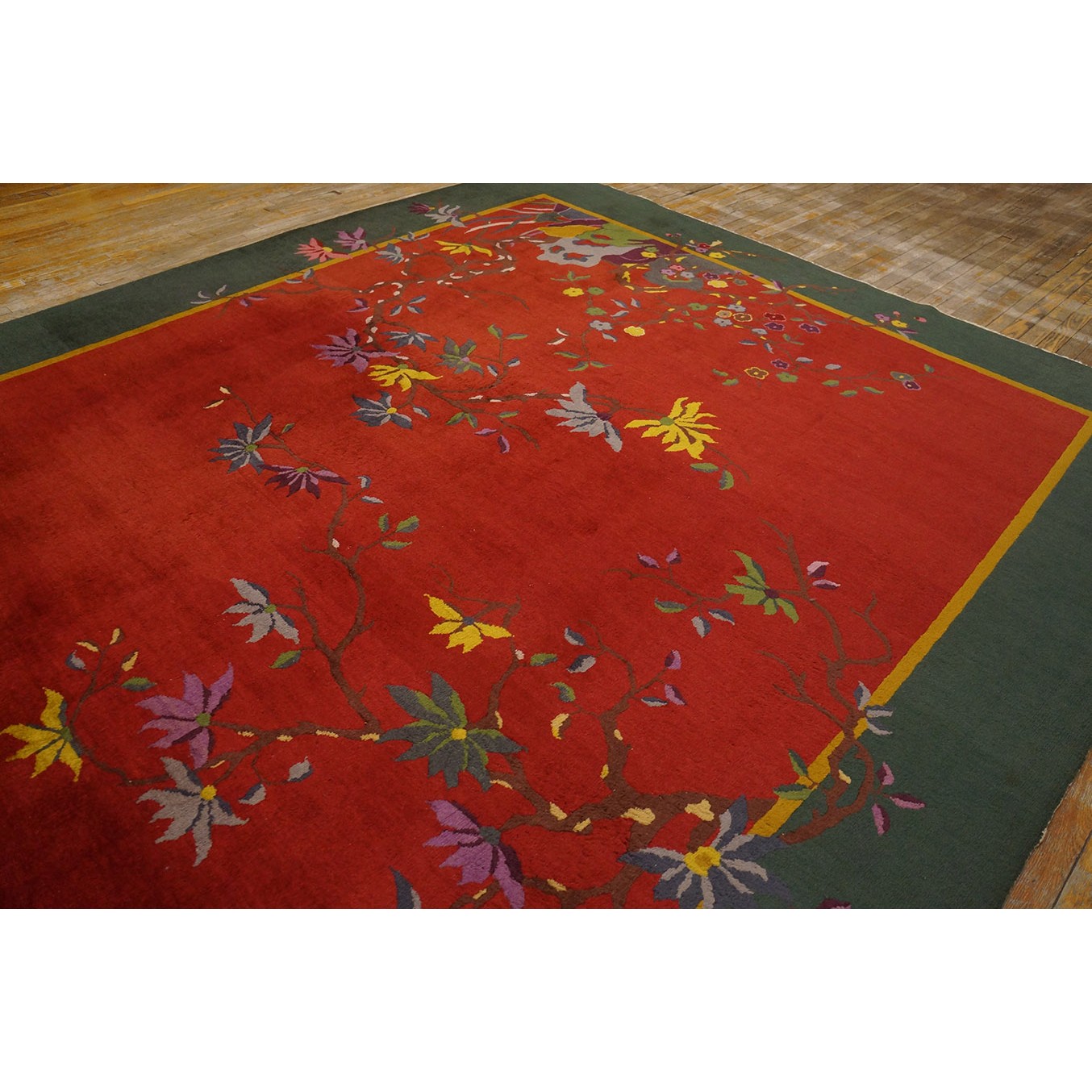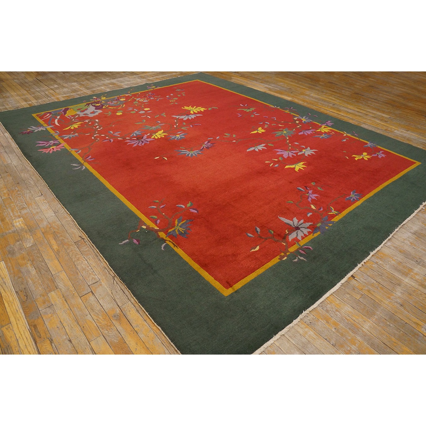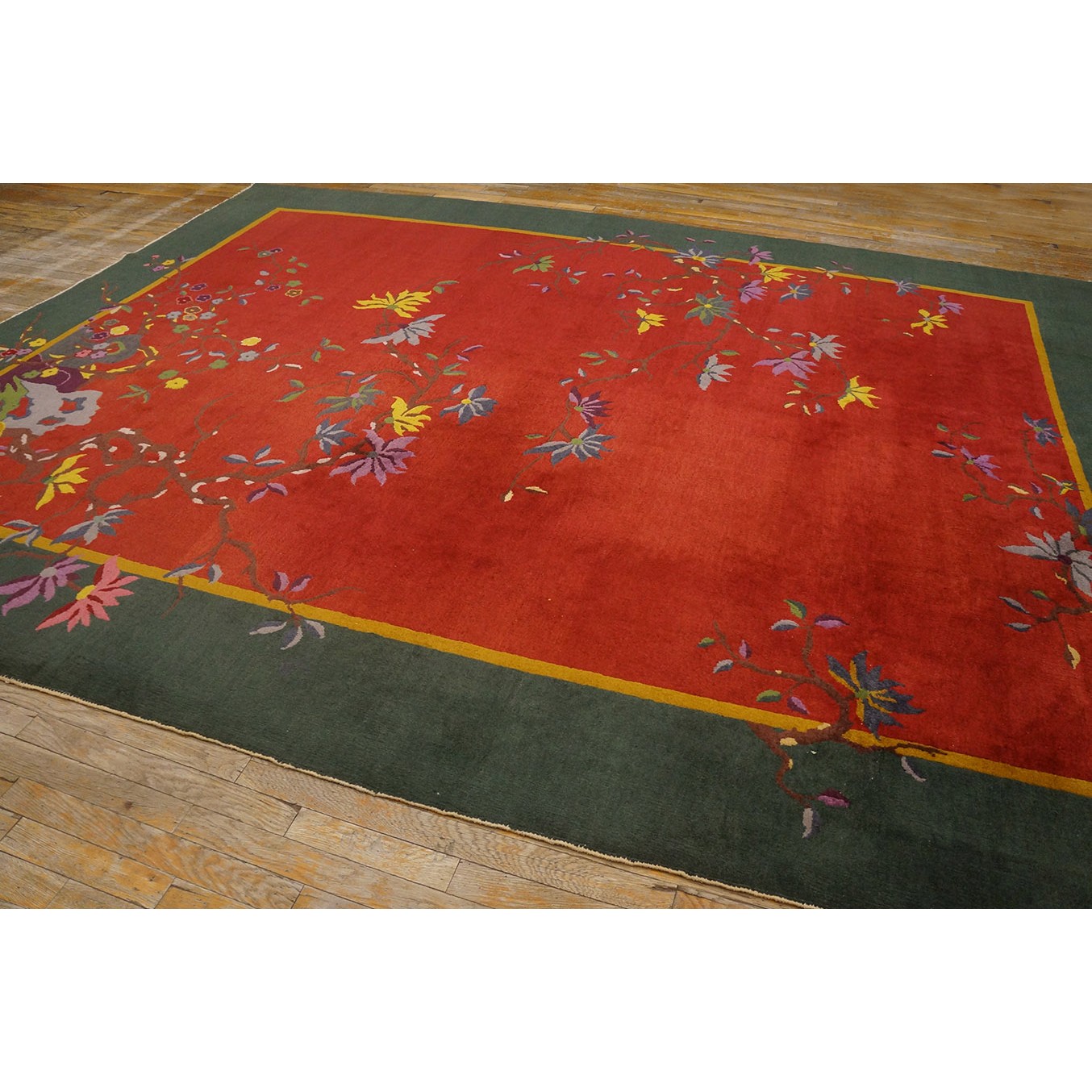 DescriptionChineseCarpets made in China proper. See entries Ningshia, Peking, Art Deco. Chinese - Art DecoAs the name implies, pieces woven between the wars for the Western market by mostly American owned firms especially Nichols and Fette, in thick heavy weaves using strong colors, asymmetric patterns and downplaying the Chinese-ness of the carpet. Nichols rugs are more strong toned than the pastel Fette. Most were woven in the coastal port city of Tientsin. Other lesser known workshops were also active. Some pieces are ultra-geometric and haute-Deco moderne in character: these are very rare. More frequent are pieces with bits of Chinese ornament: vases or other precious objects, paeonies, vines, fences, etc. Most common is the 9 x 12 size, in colors never found in mainstream Chinese rugs: backgrounds in black, mauve, purple, hot pink, orange, olive, employing the best synthetic chrome dyes of the period. Prices are still reasonable and carpets in top condition are available. | |
