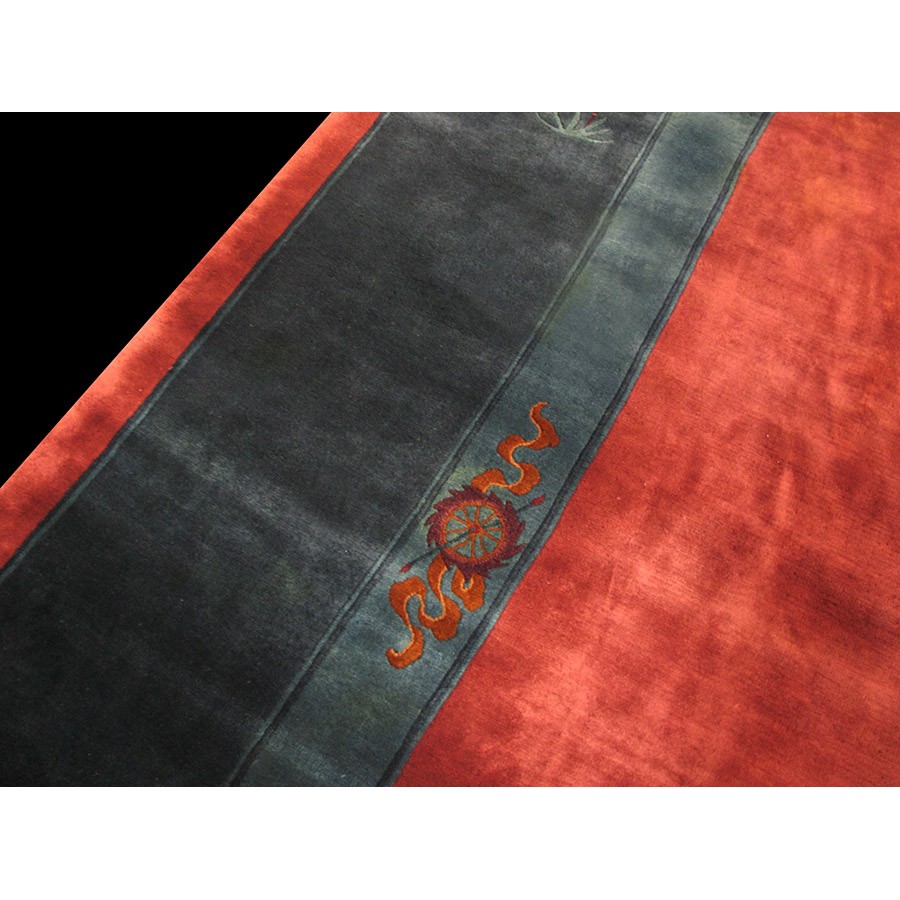 DescriptionChineseCarpets made in China proper. See entries Ningshia, Peking, Art Deco. Chinese - Art DecoAs the name implies, pieces woven between the wars for the Western market by mostly American owned firms especially Nichols and Fette, in thick heavy weaves using strong colors, asymmetric patterns and downplaying the Chinese-ness of the carpet. Nichols rugs are more strong toned than the pastel Fette. Most were woven in the coastal port city of Tientsin. Other lesser known workshops were also active. Some pieces are ultra-geometric and haute-Deco moderne in character: these are very rare. More frequent are pieces with bits of Chinese ornament: vases or other precious objects, paeonies, vines, fences, etc. Most common is the 9 x 12 size, in colors never found in mainstream Chinese rugs: backgrounds in black, mauve, purple, hot pink, orange, olive, employing the best synthetic chrome dyes of the period. Prices are still reasonable and carpets in top condition are available. | |