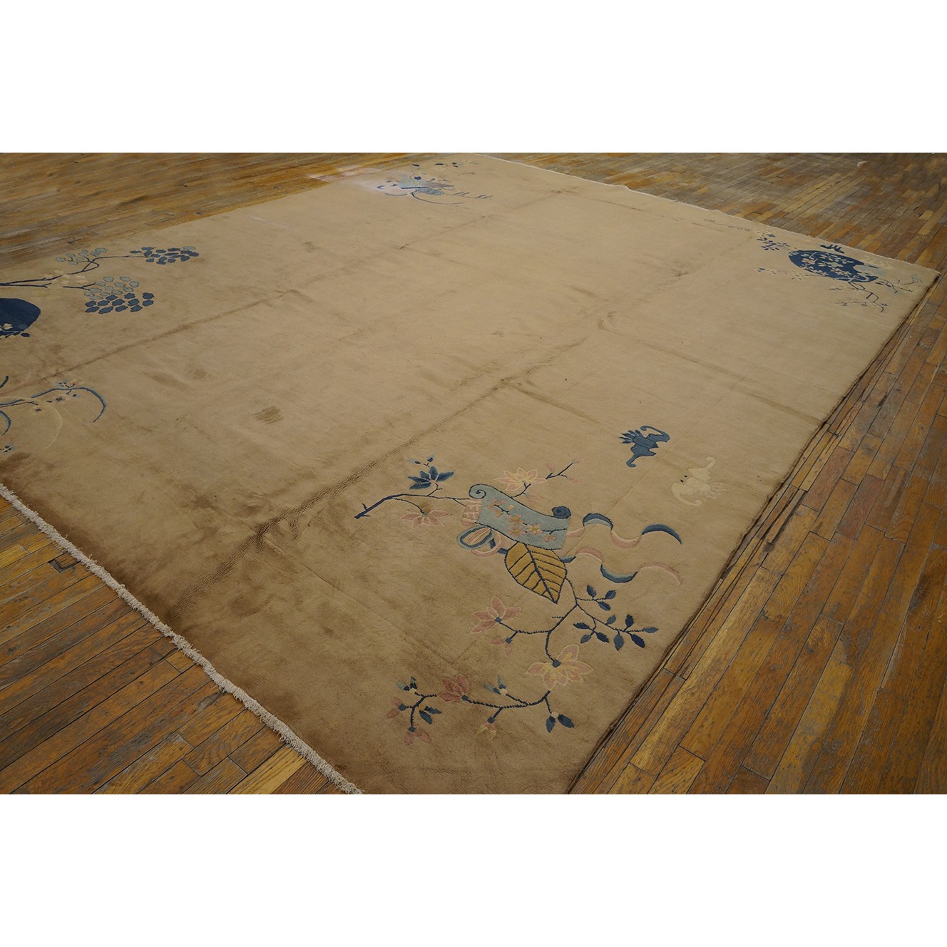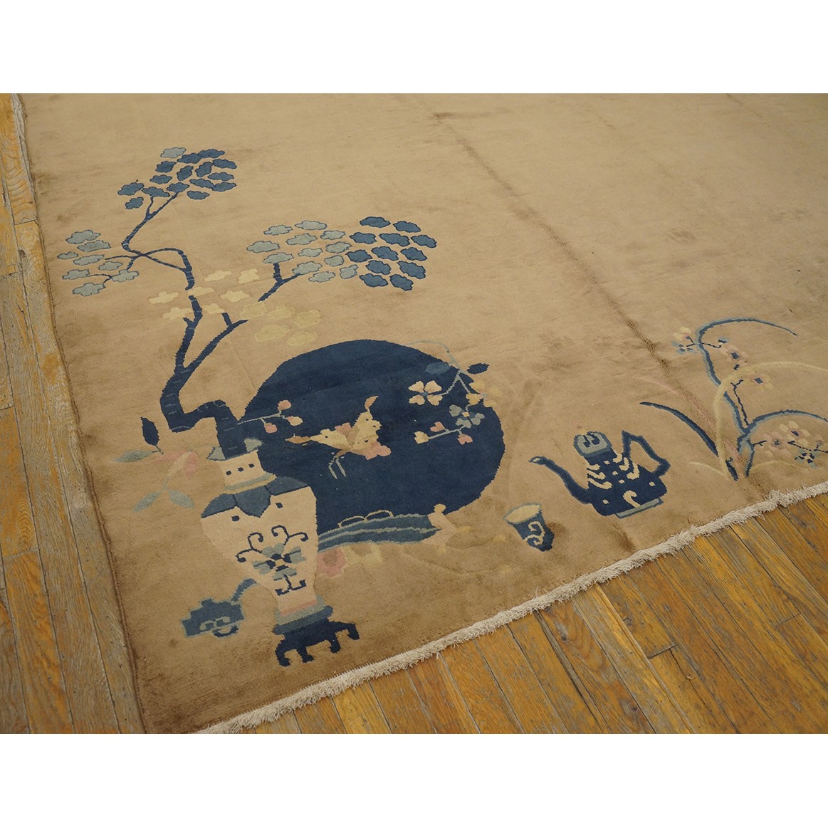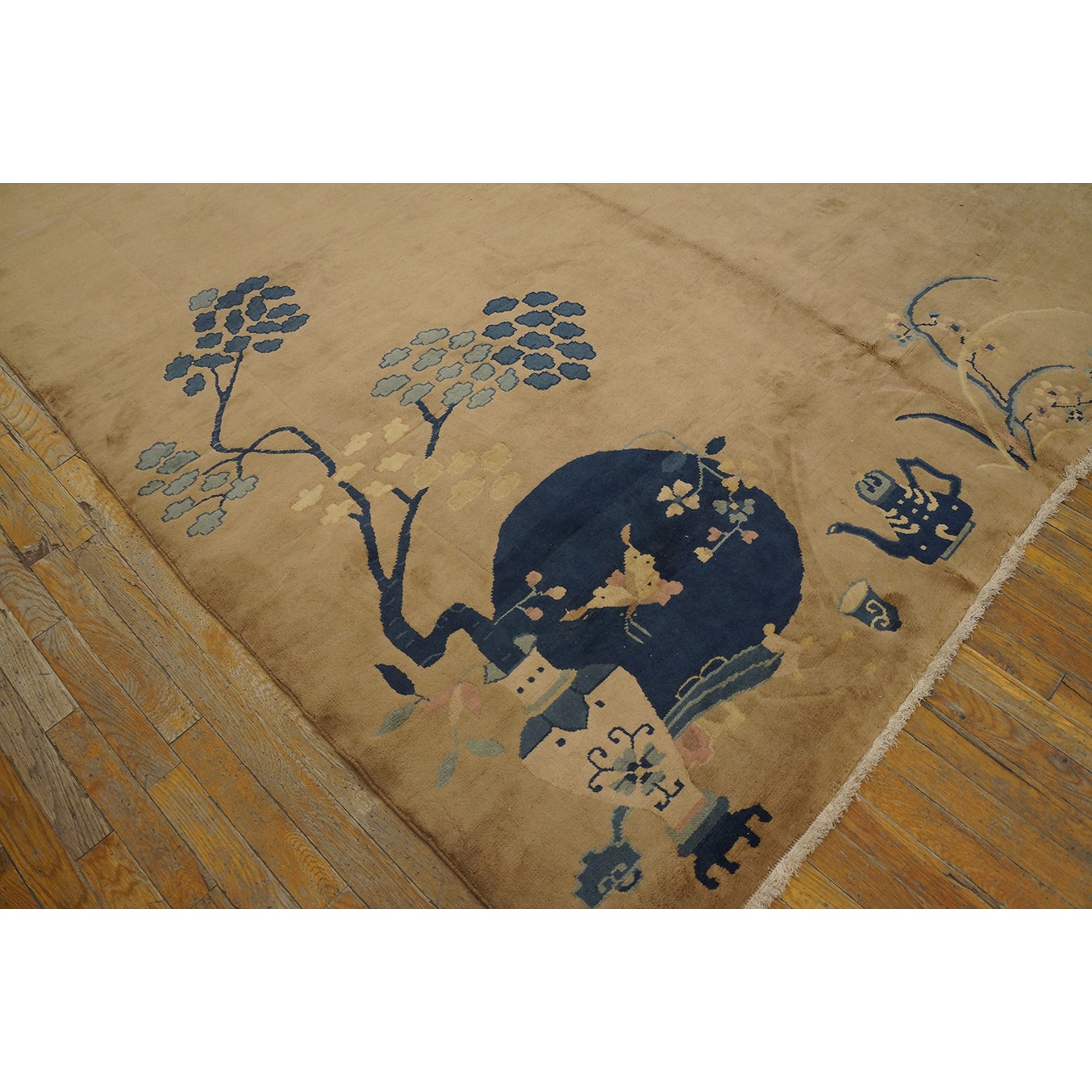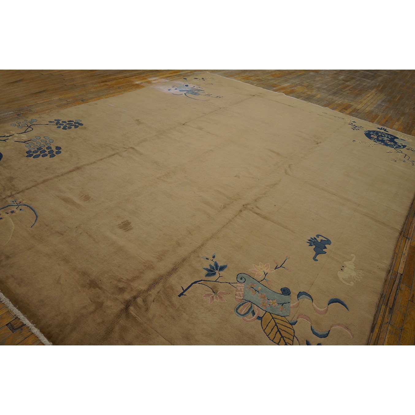 DescriptionChineseCarpets made in China proper. See entries Ningshia, Peking, Art Deco. Chinese - Art DecoAs the name implies, pieces woven between the wars for the Western market by mostly American owned firms especially Nichols and Fette, in thick heavy weaves using strong colors, asymmetric patterns and downplaying the Chinese-ness of the carpet. Nichols rugs are more strong toned than the pastel Fette. Most were woven in the coastal port city of Tientsin. Other lesser known workshops were also active. Some pieces are ultra-geometric and haute-Deco moderne in character: these are very rare. More frequent are pieces with bits of Chinese ornament: vases or other precious objects, paeonies, vines, fences, etc. Most common is the 9 x 12 size, in colors never found in mainstream Chinese rugs: backgrounds in black, mauve, purple, hot pink, orange, olive, employing the best synthetic chrome dyes of the period. Prices are still reasonable and carpets in top condition are available. | |