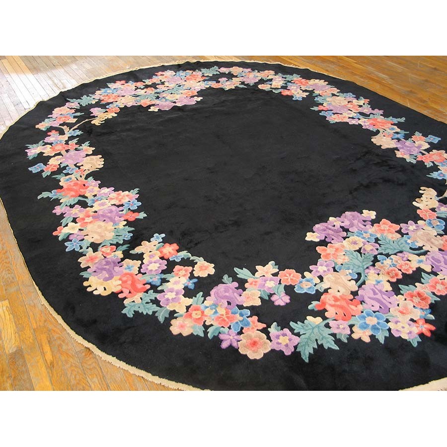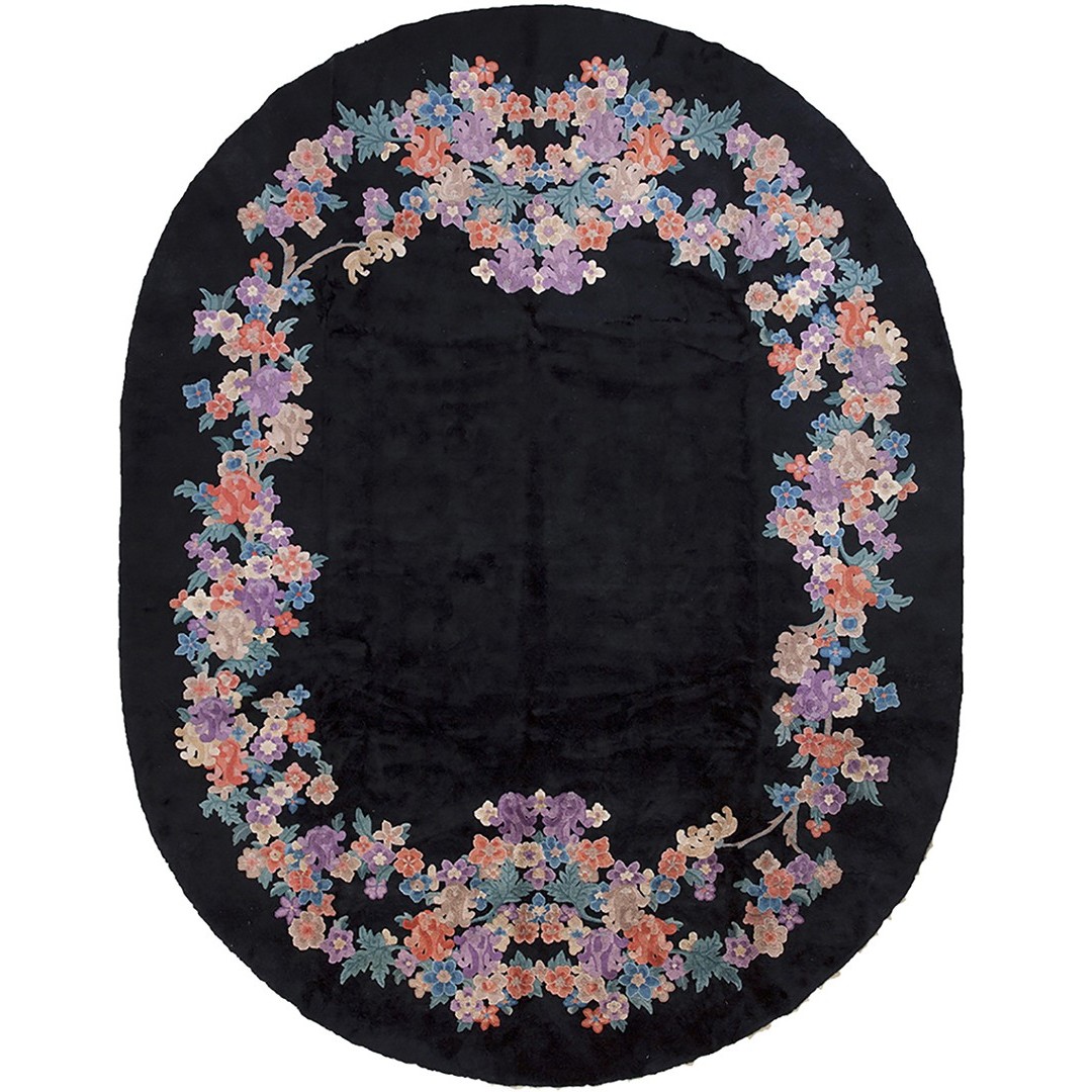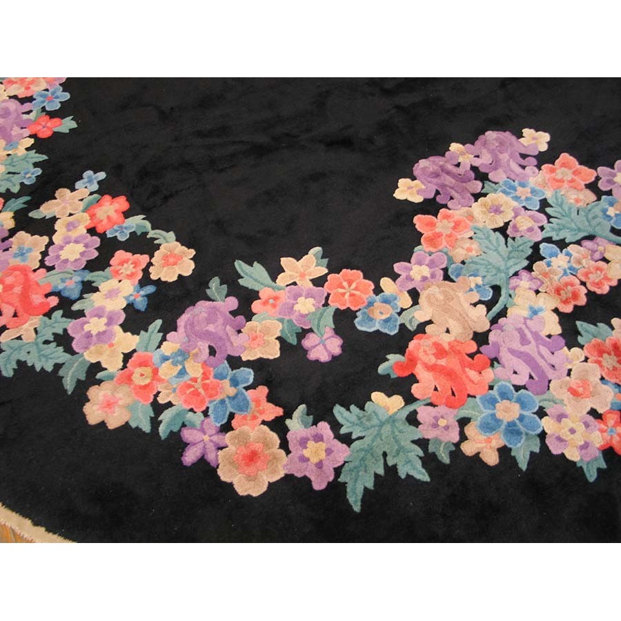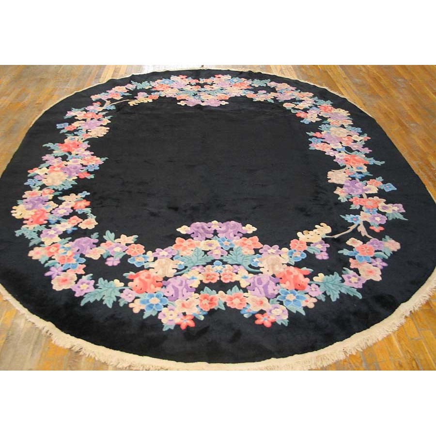 DescriptionChineseCarpets made in China proper. See entries Ningshia, Peking, Art Deco. Chinese - Art DecoAs the name implies, pieces woven between the wars for the Western market by mostly American owned firms especially Nichols and Fette, in thick heavy weaves using strong colors, asymmetric patterns and downplaying the Chinese-ness of the carpet. Nichols rugs are more strong toned than the pastel Fette. Most were woven in the coastal port city of Tientsin. Other lesser known workshops were also active. Some pieces are ultra-geometric and haute-Deco moderne in character: these are very rare. More frequent are pieces with bits of Chinese ornament: vases or other precious objects, paeonies, vines, fences, etc. Most common is the 9 x 12 size, in colors never found in mainstream Chinese rugs: backgrounds in black, mauve, purple, hot pink, orange, olive, employing the best synthetic chrome dyes of the period. Prices are still reasonable and carpets in top condition are available. | |