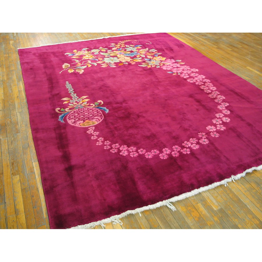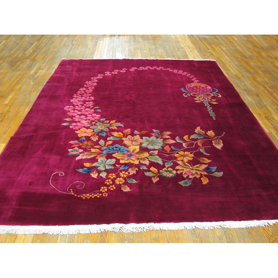 DescriptionChineseCarpets made in China proper. See entries Ningshia, Peking, Art Deco. Chinese - Art DecoAs the name implies, pieces woven between the wars for the Western market by mostly American owned firms especially Nichols and Fette, in thick heavy weaves using strong colors, asymmetric patterns and downplaying the Chinese-ness of the carpet. Nichols rugs are more strong toned than the pastel Fette. Most were woven in the coastal port city of Tientsin. Other lesser known workshops were also active. Some pieces are ultra-geometric and haute-Deco moderne in character: these are very rare. More frequent are pieces with bits of Chinese ornament: vases or other precious objects, paeonies, vines, fences, etc. Most common is the 9 x 12 size, in colors never found in mainstream Chinese rugs: backgrounds in black, mauve, purple, hot pink, orange, olive, employing the best synthetic chrome dyes of the period. Prices are still reasonable and carpets in top condition are available. | |